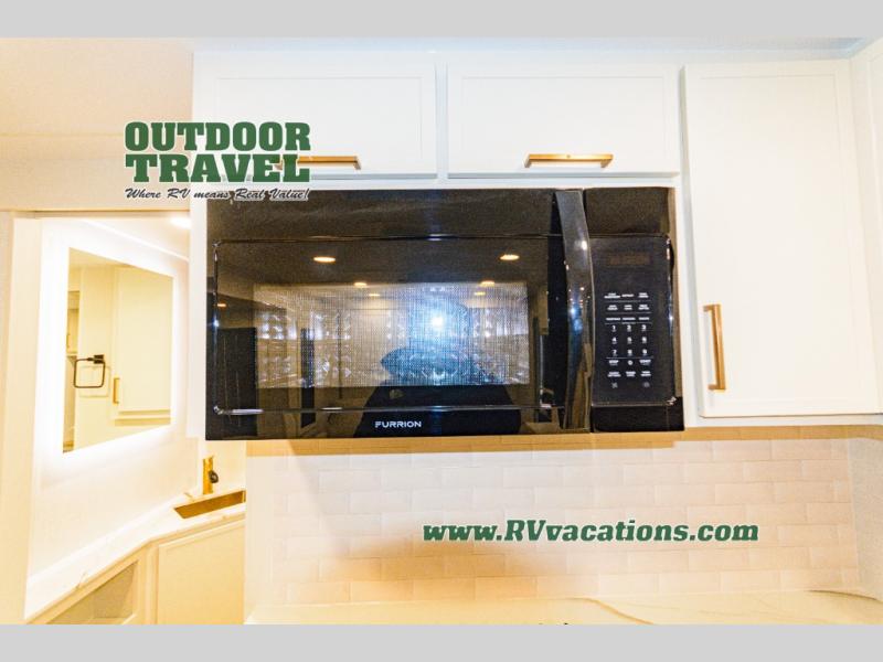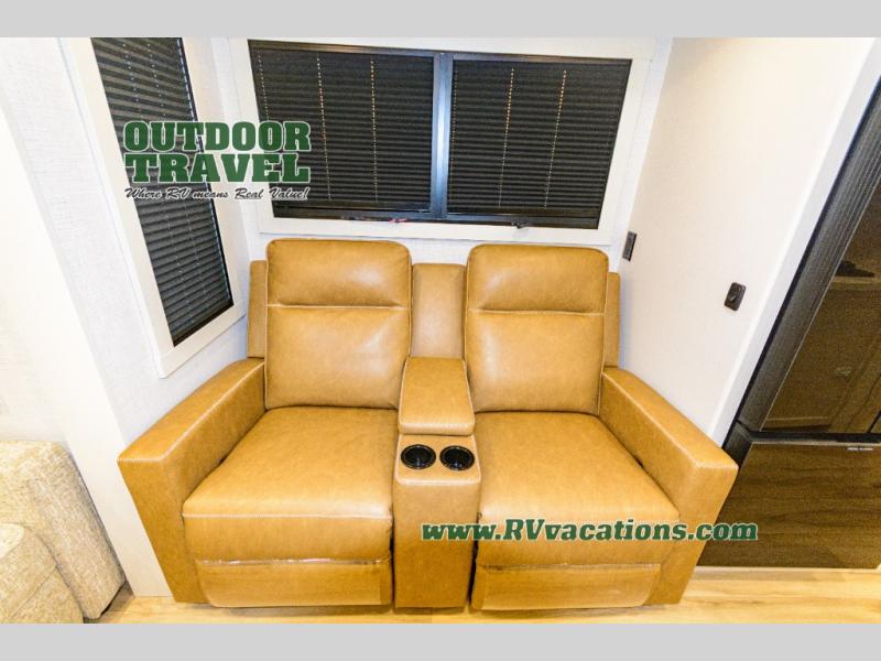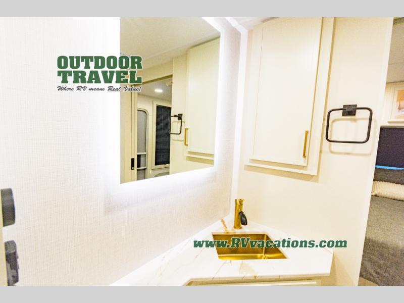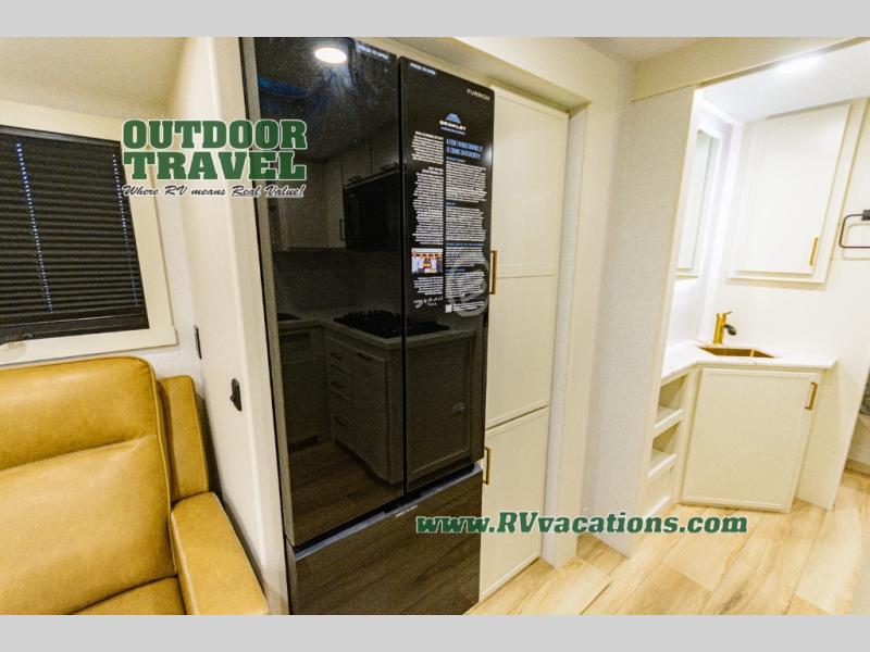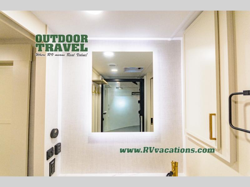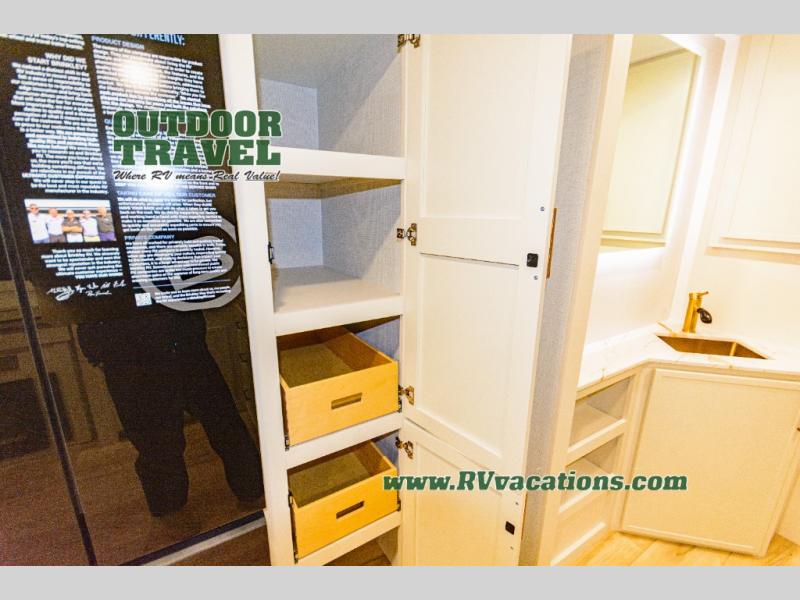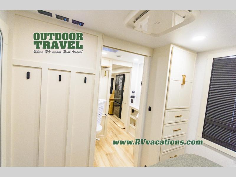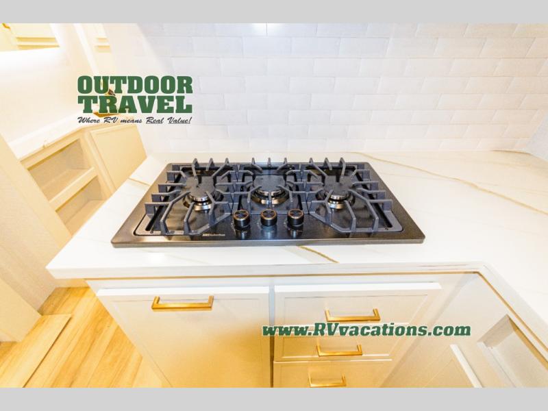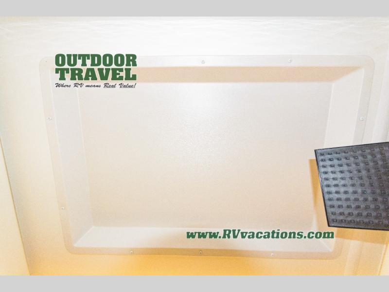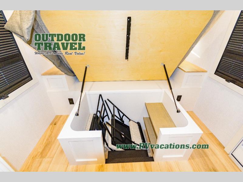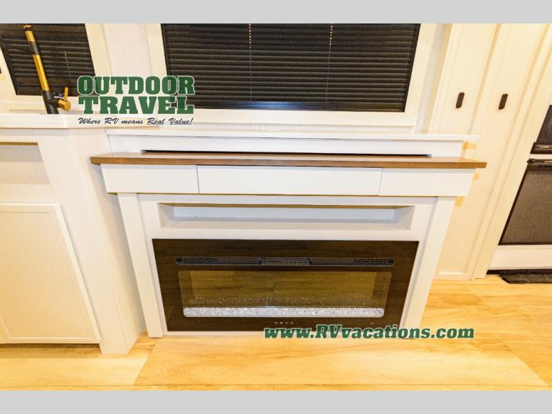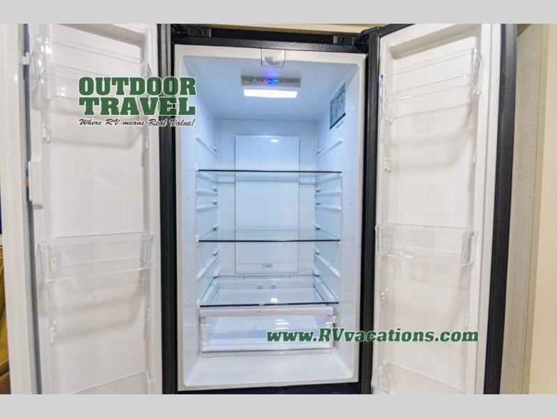 Grab the whole gang and head to the campground in this bunkhouse travel trailer! The 48" x 74" bunks can sleep two to four, and there is a floor to ceiling storage cabinet with drawers, a top bunk window, outlets and USB ports, plus double space-saving pocket doors. Up front you'll find the master bedroom with a 66" x 80" king bed and a MaxSpace Split-Level Wardrobe, TV prep, your own exterior entry door, plus quick access to the walk-thru bath. Everyone can meet in the combined kitchen and living room to relax on the theater seating or tri-fold sofa, and there is pull-out dining table with a drawer and a window above for great outdoor views. The outside is just as accommodating as the inside with its exterior speakers, LED chassis lighting, rear storage compartment with dual access doors, and exterior 12V refrigerator for cold drinks!
