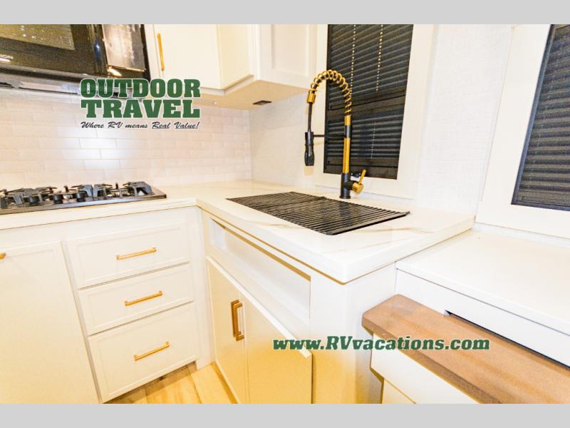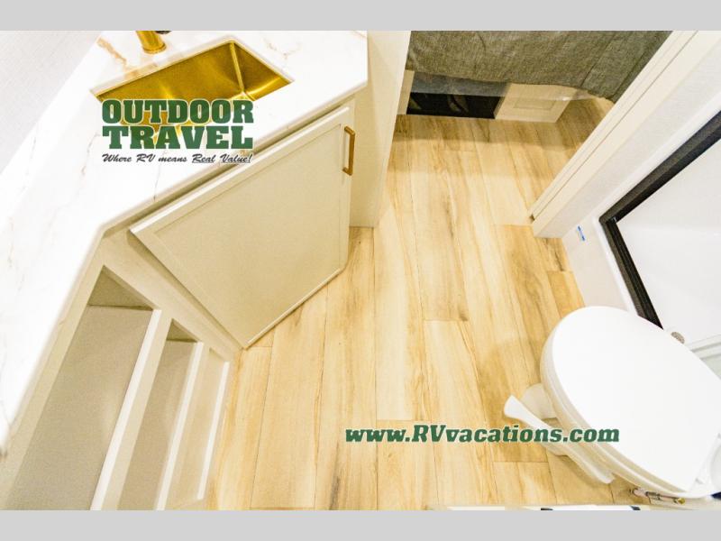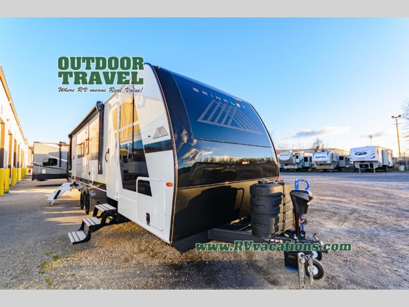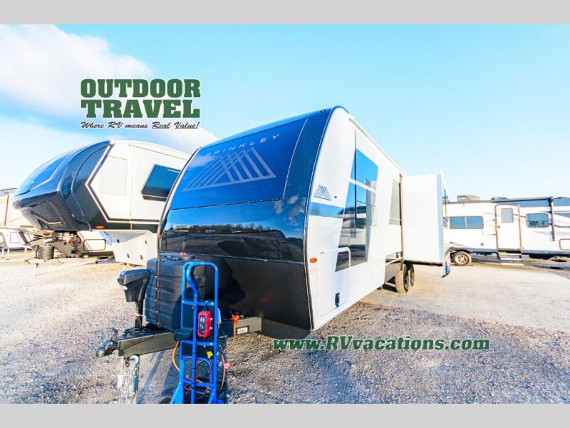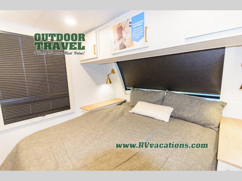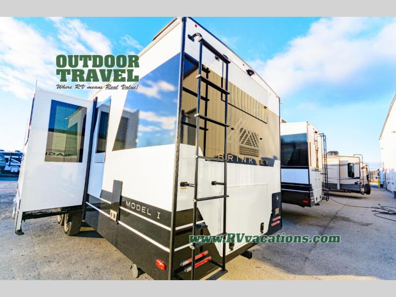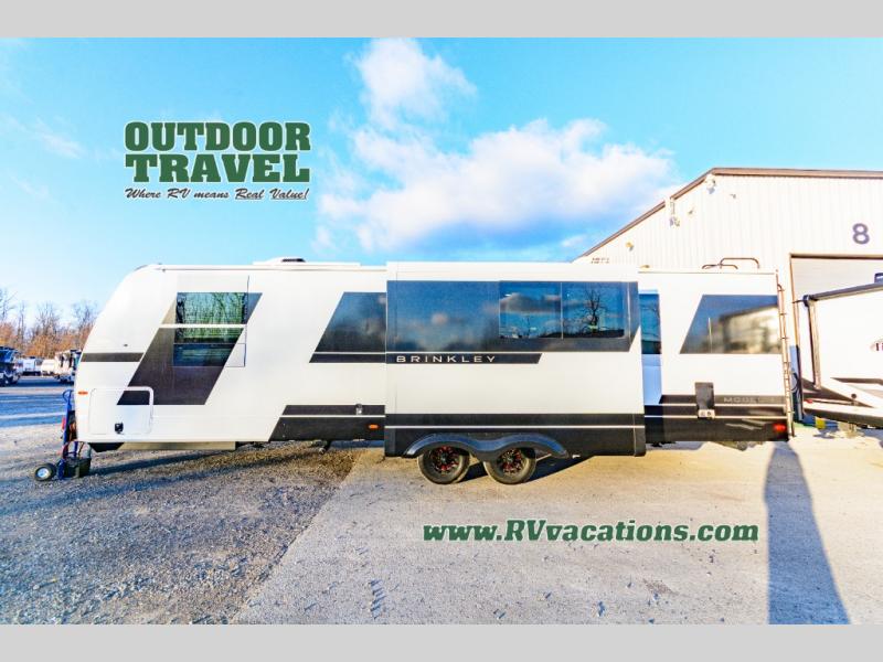 The lightweight Model I travel trailer by Brinkley is the perfect choice for those looking for an easy tow and at-home comforts! There is a drop-frame chassis, high-performance Road Armor suspension equalizer system, and Demco EZ Latch trailer coupler that automatically latches when dropped onto a hitch ball without the need of a safety pin. Additional exterior features include square Euro frameless windows, automotive-grade paint, full-width LED strip lighting in the pass-thru, and a pet & property security campside tie-down to keep your gear and furry friends safe. Inside, you'll be wowed by Brinkley's CraftSense wood trim construction, residential solid surface kitchen countertops, dimmable bedroom lights, and marine-grade neon LED shower lighting to name a few stand-out features!