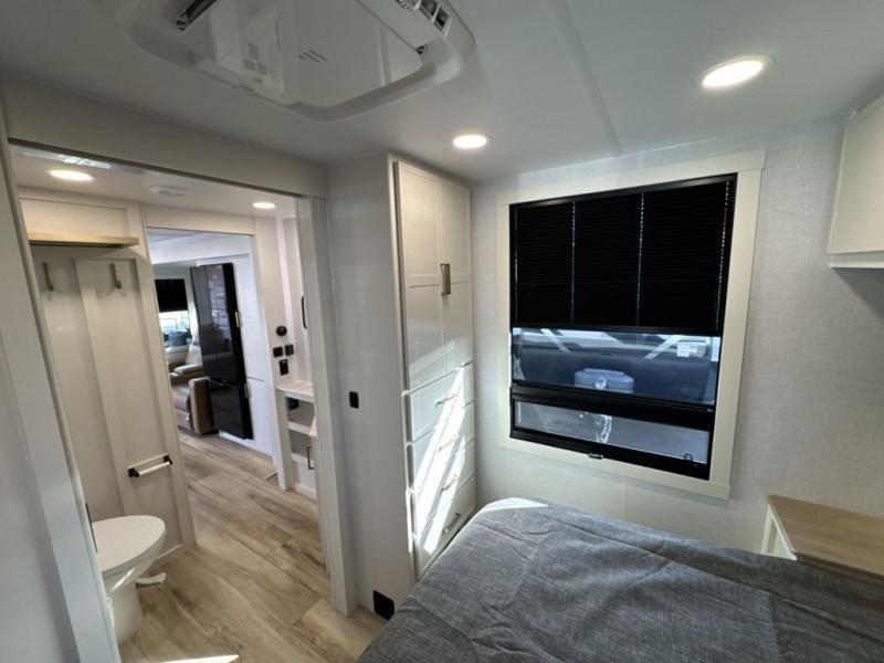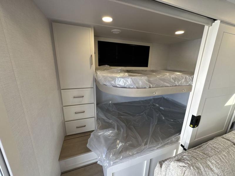 Grab the whole gang and head to the campground in this bunkhouse travel trailer! The 48" x 74" bunks can sleep two to four, and there is a floor to ceiling storage cabinet with drawers, a top bunk window, outlets and USB ports, plus double space-saving pocket doors. Up front you'll find the master bedroom with a 66" x 80" king bed and a MaxSpace Split-Level Wardrobe, TV prep, your own exterior entry door, plus quick access to the walk-thru bath. Everyone can meet in the combined kitchen and living room to relax on the theater seating or tri-fold sofa, and there is pull-out dining table with a drawer and a window above for great outdoor views. The outside is just as accommodating as the inside with its exterior speakers, LED chassis lighting, rear storage compartment with dual access doors, and exterior 12V refrigerator for cold drinks!