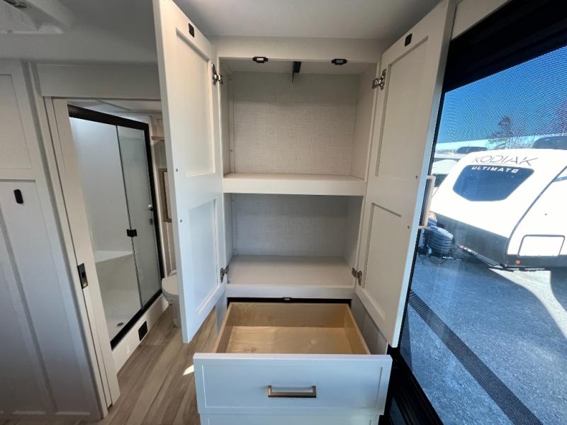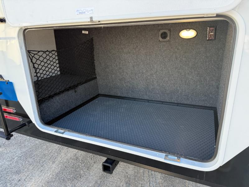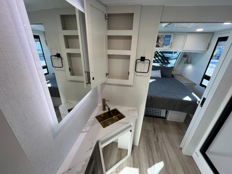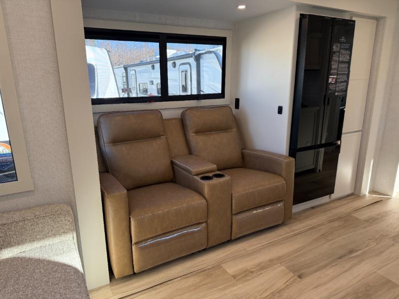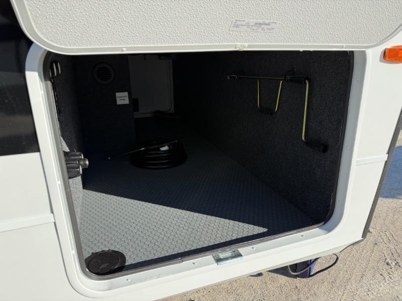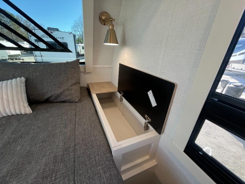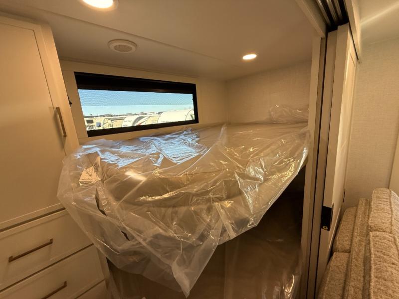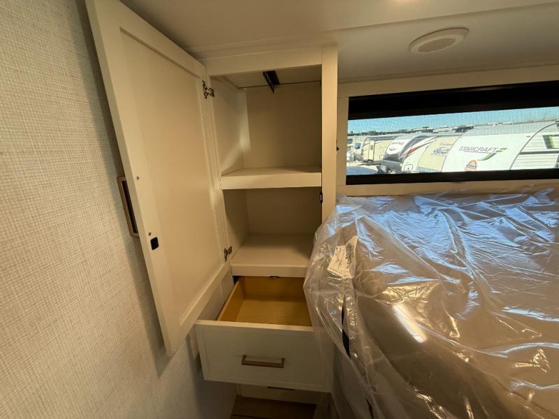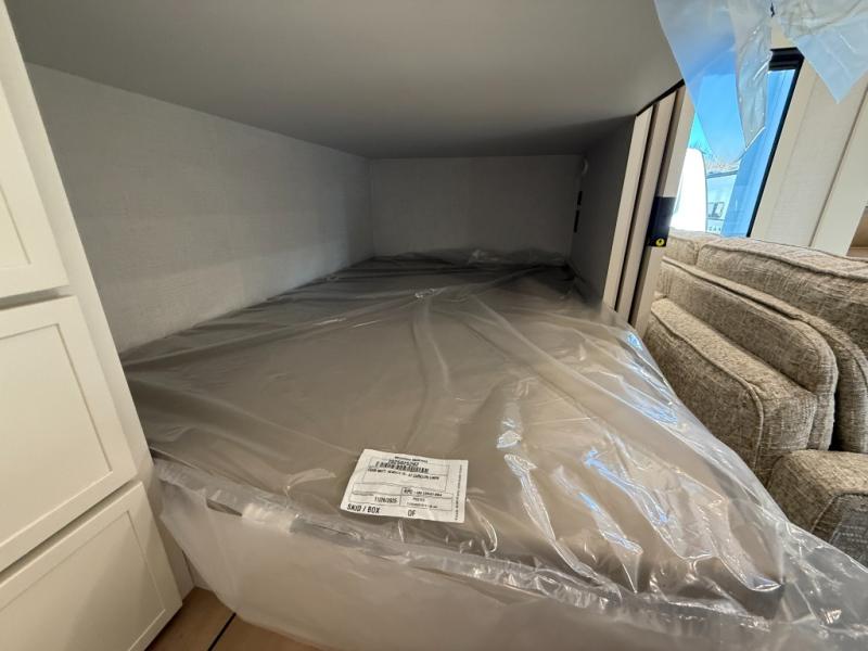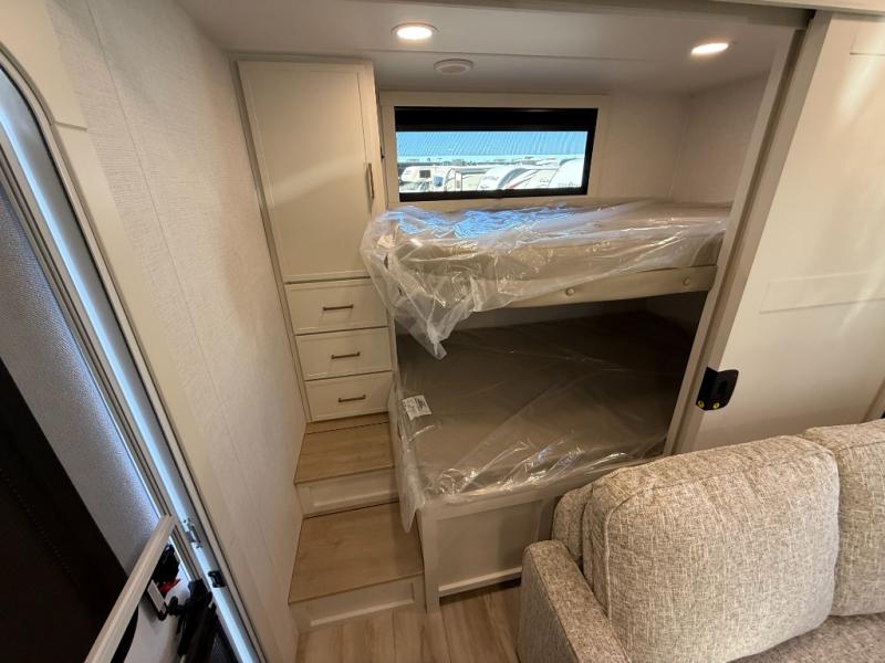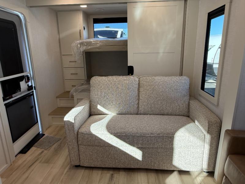 Grab the whole gang and head to the campground in this bunkhouse travel trailer! The 48" x 74" bunks can sleep two to four, and there is a floor to ceiling storage cabinet with drawers, a top bunk window, outlets and USB ports, plus double space-saving pocket doors. Up front you'll find the master bedroom with a 66" x 80" king bed and a MaxSpace Split-Level Wardrobe, TV prep, your own exterior entry door, plus quick access to the walk-thru bath. Everyone can meet in the combined kitchen and living room to relax on the theater seating or tri-fold sofa, and there is pull-out dining table with a drawer and a window above for great outdoor views. The outside is just as accommodating as the inside with its exterior speakers, LED chassis lighting, rear storage compartment with dual access doors, and exterior 12V refrigerator for cold drinks!