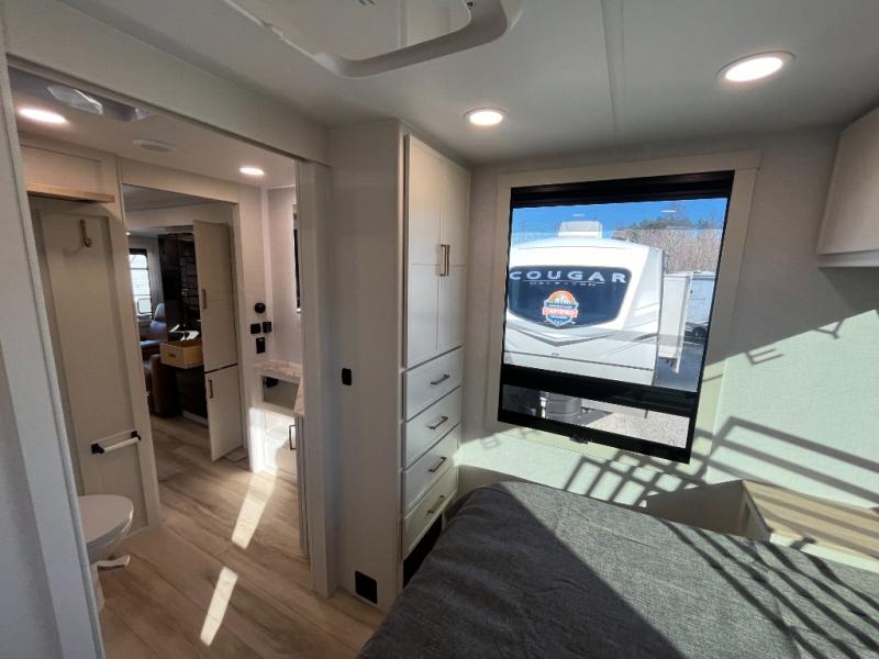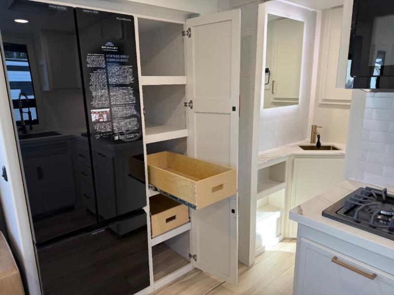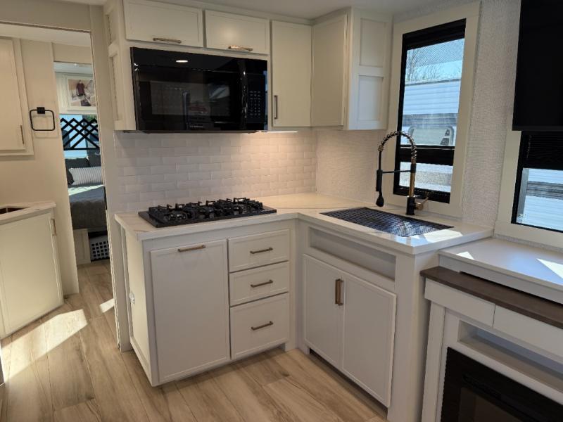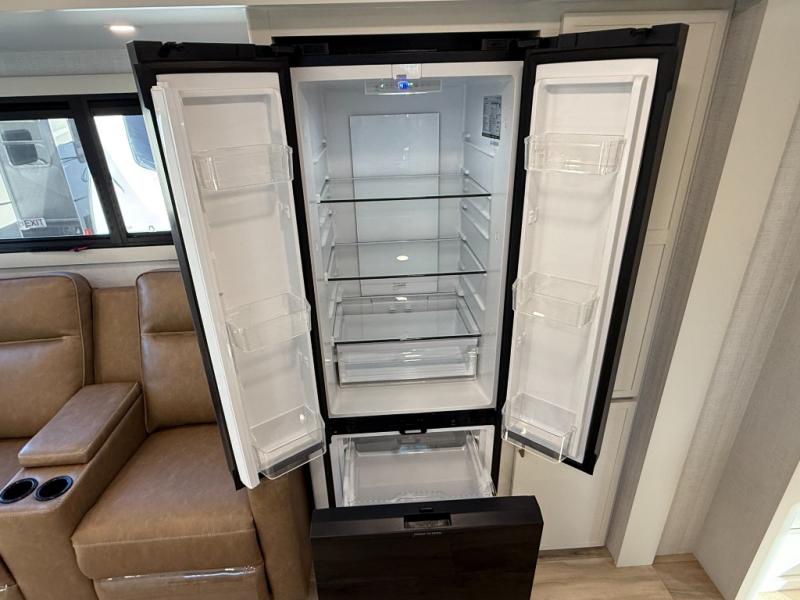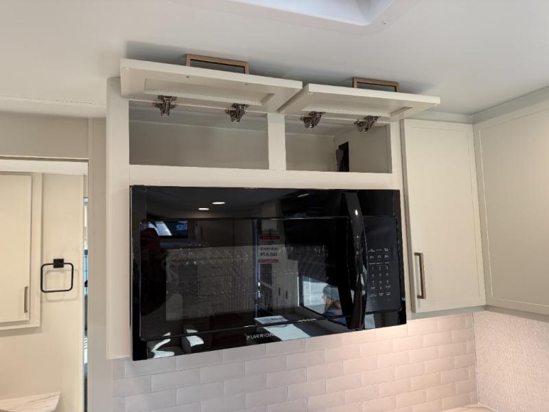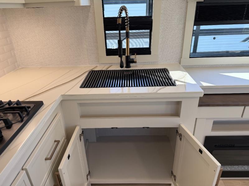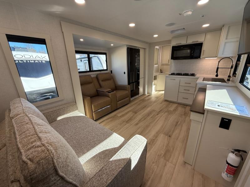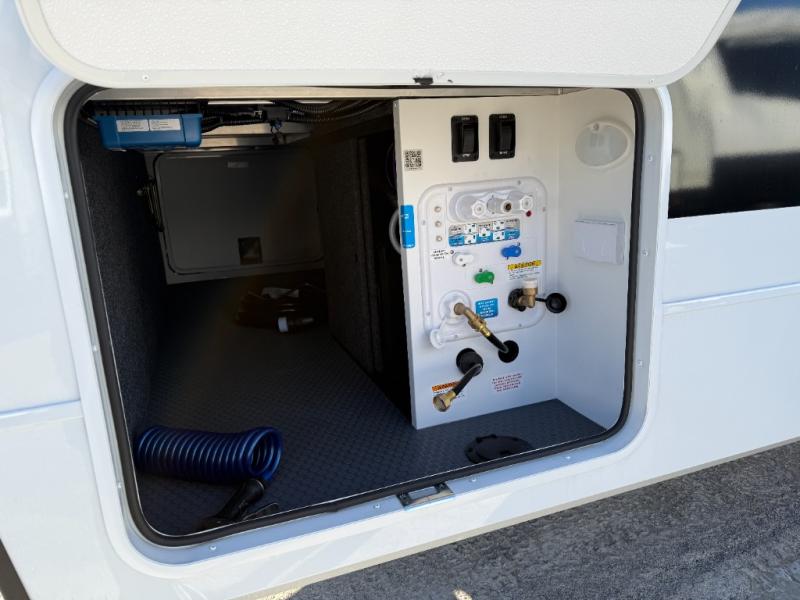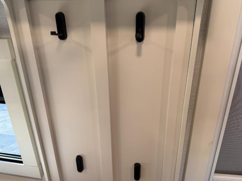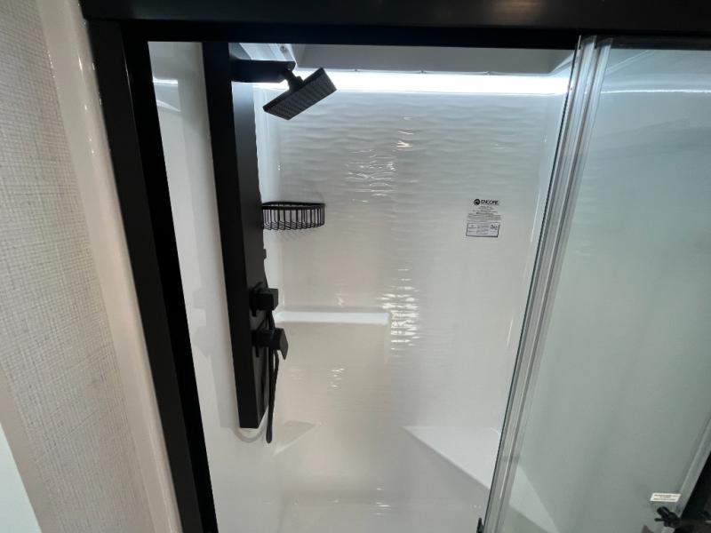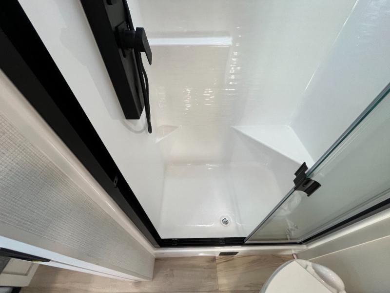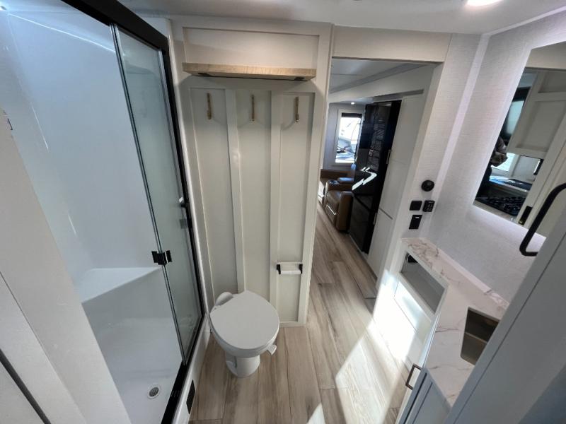 Grab the whole gang and head to the campground in this bunkhouse travel trailer! The 48" x 74" bunks can sleep two to four, and there is a floor to ceiling storage cabinet with drawers, a top bunk window, outlets and USB ports, plus double space-saving pocket doors. Up front you'll find the master bedroom with a 66" x 80" king bed and a MaxSpace Split-Level Wardrobe, TV prep, your own exterior entry door, plus quick access to the walk-thru bath. Everyone can meet in the combined kitchen and living room to relax on the theater seating or tri-fold sofa, and there is pull-out dining table with a drawer and a window above for great outdoor views. The outside is just as accommodating as the inside with its exterior speakers, LED chassis lighting, rear storage compartment with dual access doors, and exterior 12V refrigerator for cold drinks!
