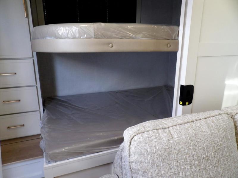 Grab the whole gang and head to the campground in this bunkhouse travel trailer! The 48" x 74" bunks can sleep two to four, and there is a floor to ceiling storage cabinet with drawers, a top bunk window, outlets and USB ports, plus double space-saving pocket doors. Up front you'll find the master bedroom with a 66" x 80" king bed and a MaxSpace Split-Level Wardrobe, TV prep, your own exterior entry door, plus quick access to the walk-thru bath. Everyone can meet in the combined kitchen and living room to relax on the theater seating or tri-fold sofa, and there is pull-out dining table with a drawer and a window above for great outdoor views. The outside is just as accommodating as the inside with its exterior speakers, LED chassis lighting, rear storage compartment with dual access doors, and exterior 12V refrigerator for cold drinks!