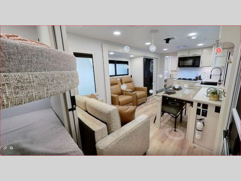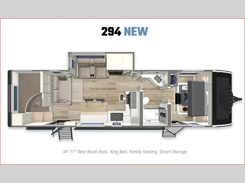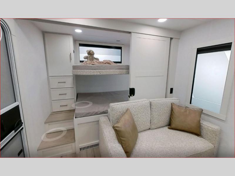 Grab the whole gang and head to the campground in this bunkhouse travel trailer! The 48" x 74" bunks can sleep two to four, and there is a floor to ceiling storage cabinet with drawers, a top bunk window, outlets and USB ports, plus double space-saving pocket doors. Up front you'll find the master bedroom with a 66" x 80" king bed and a MaxSpace Split-Level Wardrobe, TV prep, your own exterior entry door, plus quick access to the walk-thru bath. Everyone can meet in the combined kitchen and living room to relax on the theater seating or tri-fold sofa, and there is pull-out dining table with a drawer and a window above for great outdoor views. The outside is just as accommodating as the inside with its exterior speakers, LED chassis lighting, rear storage compartment with dual access doors, and exterior 12V refrigerator for cold drinks!