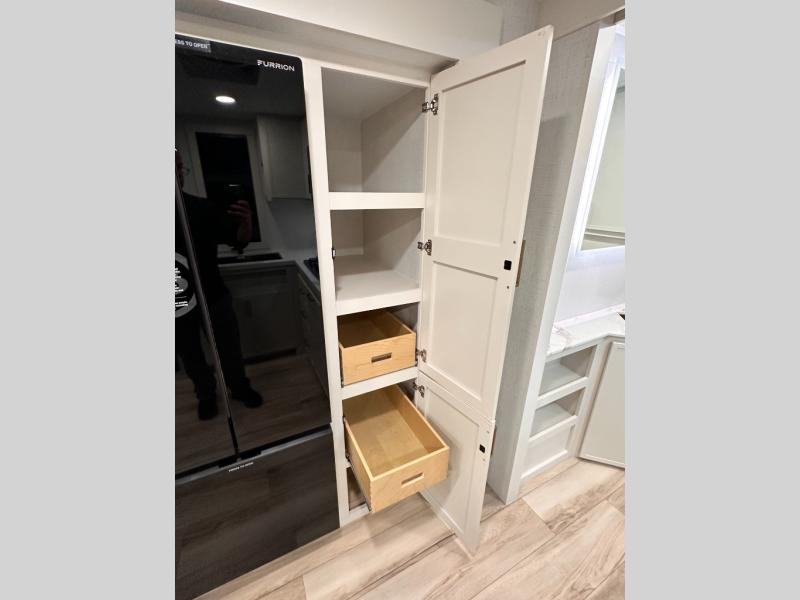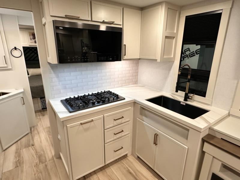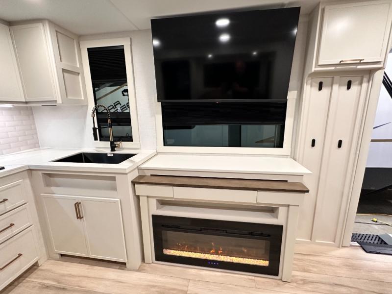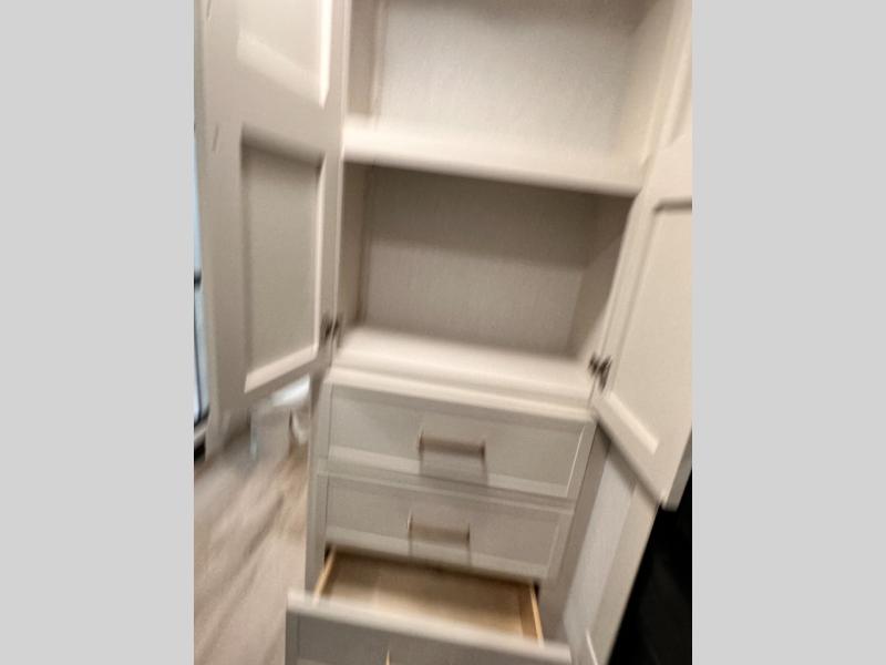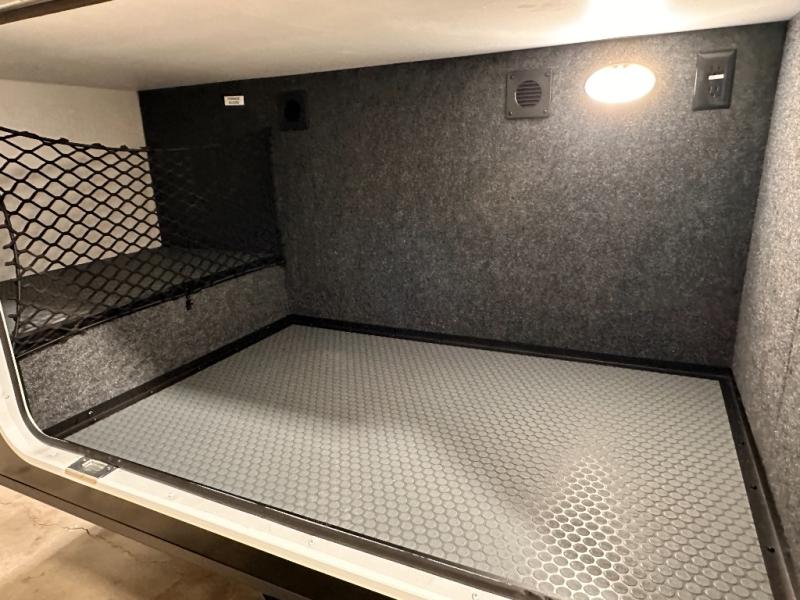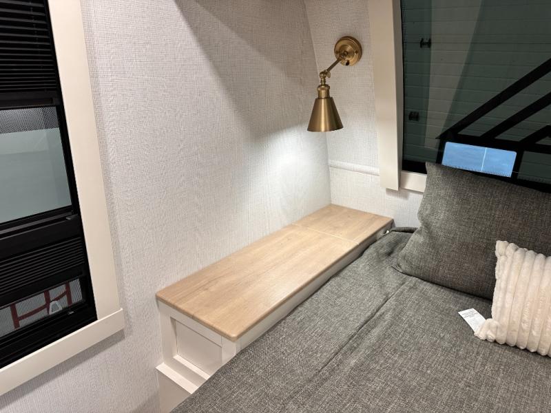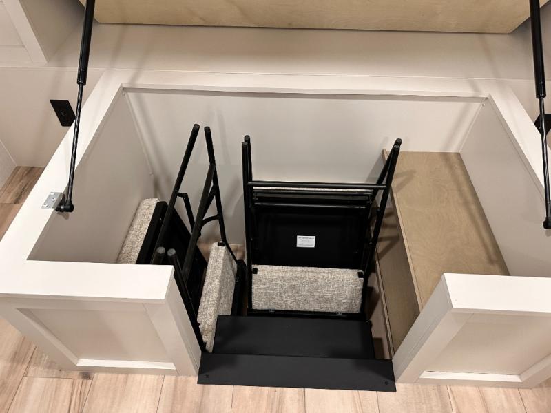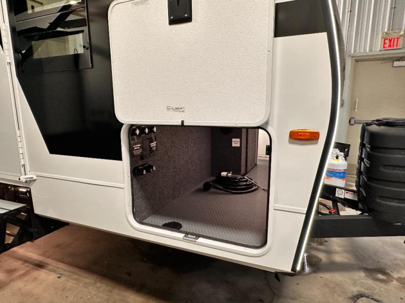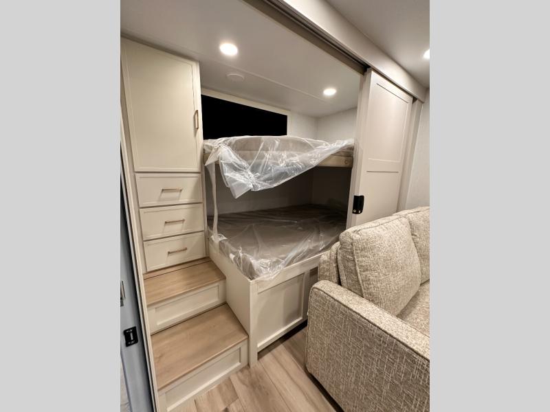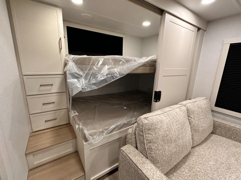 Grab the whole gang and head to the campground in this bunkhouse travel trailer! The 48" x 74" bunks can sleep two to four, and there is a floor to ceiling storage cabinet with drawers, a top bunk window, outlets and USB ports, plus double space-saving pocket doors. Up front you'll find the master bedroom with a 66" x 80" king bed and a MaxSpace Split-Level Wardrobe, TV prep, your own exterior entry door, plus quick access to the walk-thru bath. Everyone can meet in the combined kitchen and living room to relax on the theater seating or tri-fold sofa, and there is pull-out dining table with a drawer and a window above for great outdoor views. The outside is just as accommodating as the inside with its exterior speakers, LED chassis lighting, rear storage compartment with dual access doors, and exterior 12V refrigerator for cold drinks!