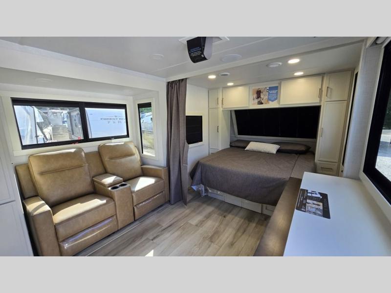 Step inside and you’ll find a luxury-forward design with high-end finishes: a king-sized “Olympic queen” bed, a full bath with one-piece fiberglass shower, solid surface countertops, and premium cabinetry with dovetail construction. The living area features a large slide-out with theater seating (or optional tri-fold sofa) and a slide-out dining table with a pull-out drawer.