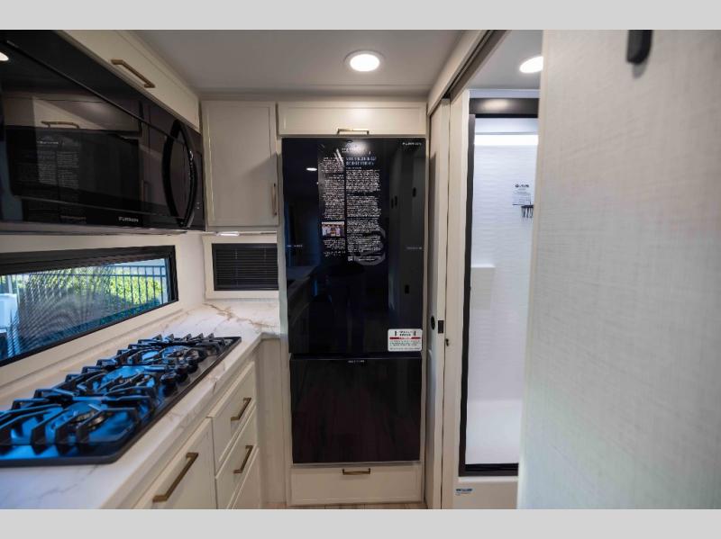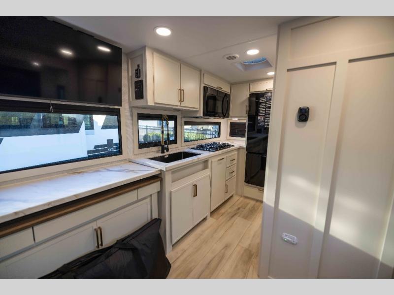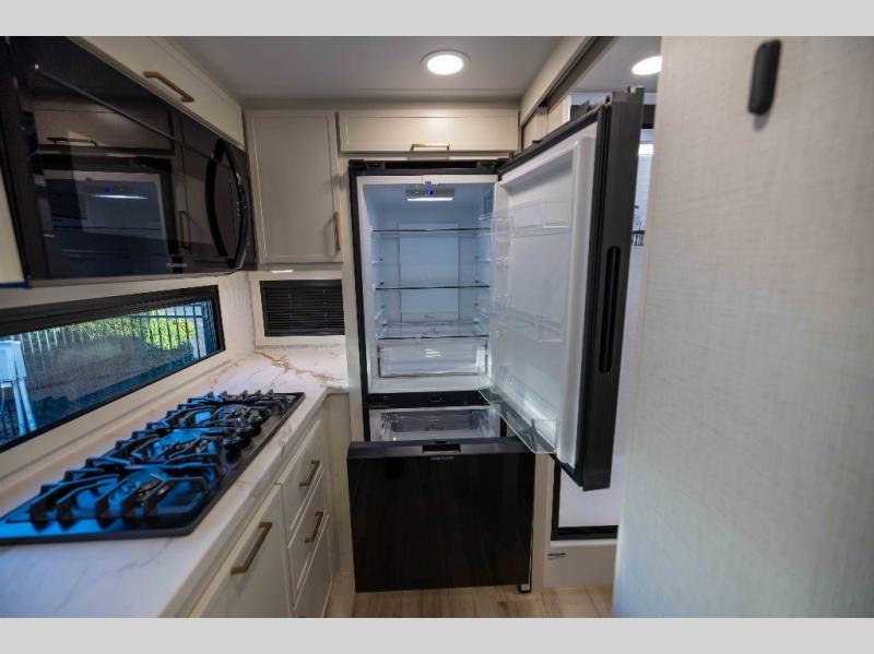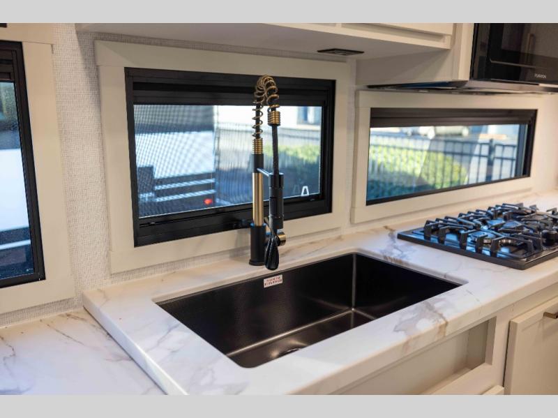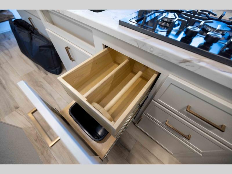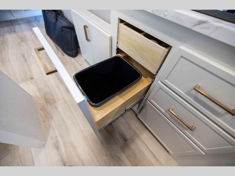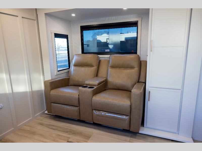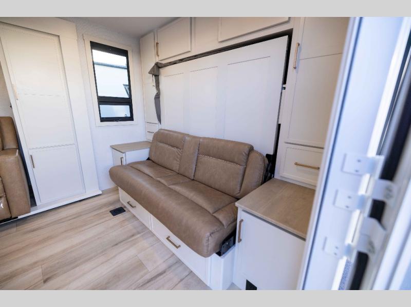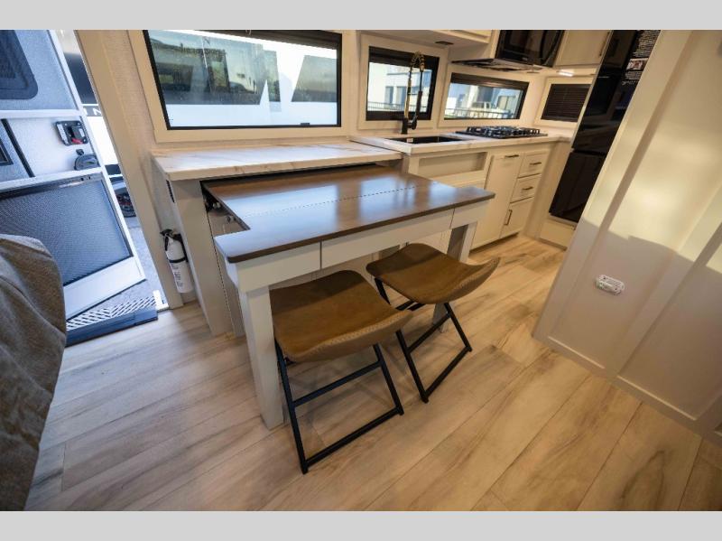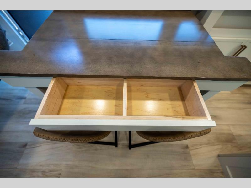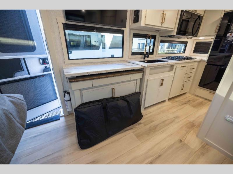 This is the perfect travel trailer for the couple looking for comfort at the campground! Once you've unloaded the pass-thru storage, you can put out the 16' patio awning and relax in your camp chairs. Head inside to make lunch in the fully equipped kitchen that includes a three-burner range, 30" convection microwave, and dishwasher prep. There is a pantry with outlets within the large slide out, along with a 10-cu. ft. refrigerator, plus theater seating across from the TV. And if you need sleeping space for guests, just choose the optional tri-fold sofa in place of the theater seating! You'll appreciate the front sofa plus a Feather-Lift bed system, providing seating space during the day and sleeping space at night! A pull-out table with a drawer provides a place to dine together, and a full bath on board will let you freshen up each day.