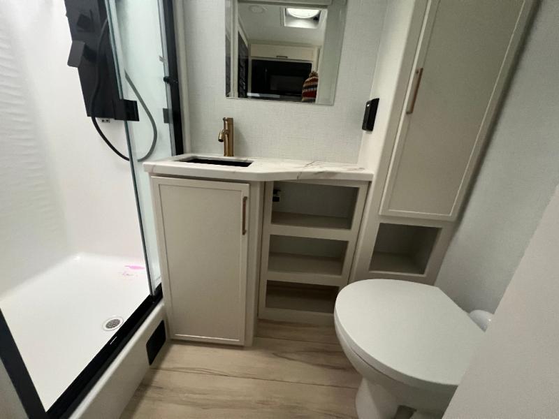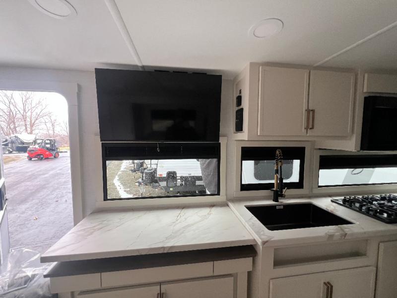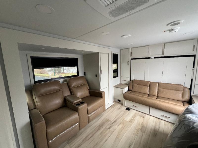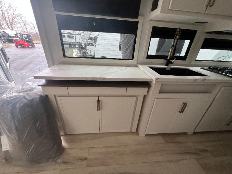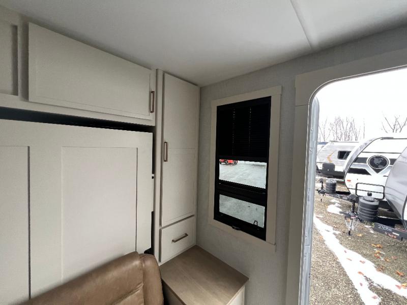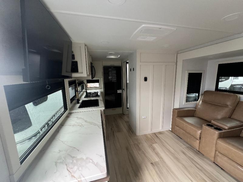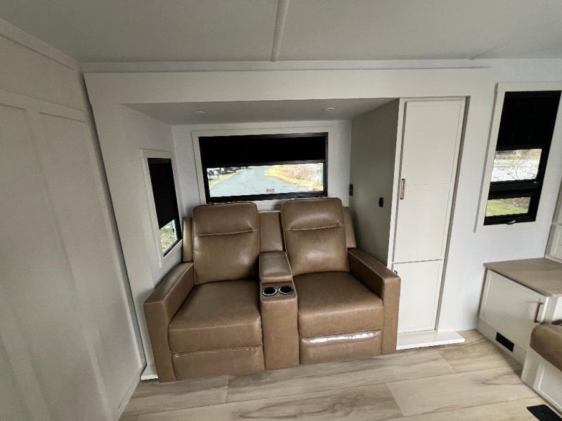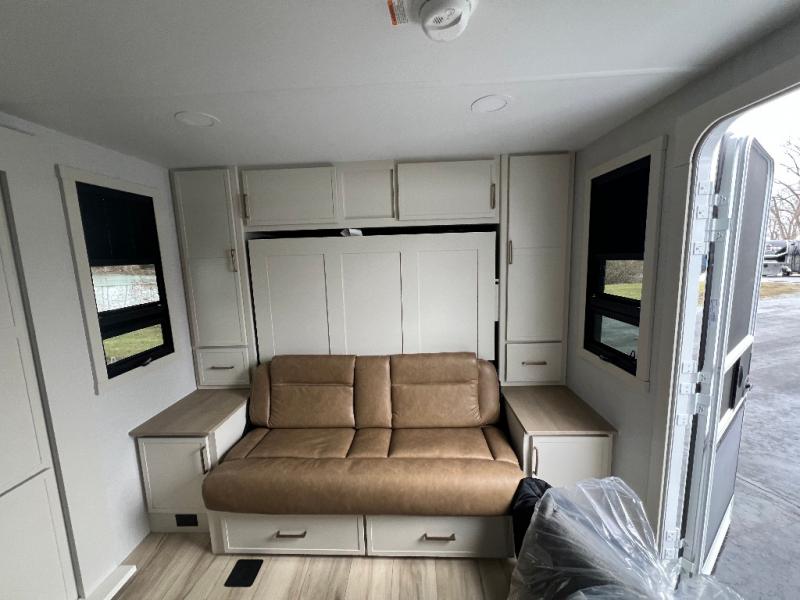 This is the perfect travel trailer for the couple looking for comfort at the campground! Once you've unloaded the pass-thru storage, you can put out the 16' patio awning and relax in your camp chairs. Head inside to make lunch in the fully equipped kitchen that includes a three-burner range, 30" convection microwave, and dishwasher prep. There is a pantry with outlets within the large slide out, along with a 10-cu. ft. refrigerator, plus theater seating across from the TV. And if you need sleeping space for guests, just choose the optional tri-fold sofa in place of the theater seating! You'll appreciate the front sofa plus a Feather-Lift bed system, providing seating space during the day and sleeping space at night! A pull-out table with a drawer provides a place to dine together, and a full bath on board will let you freshen up each day.