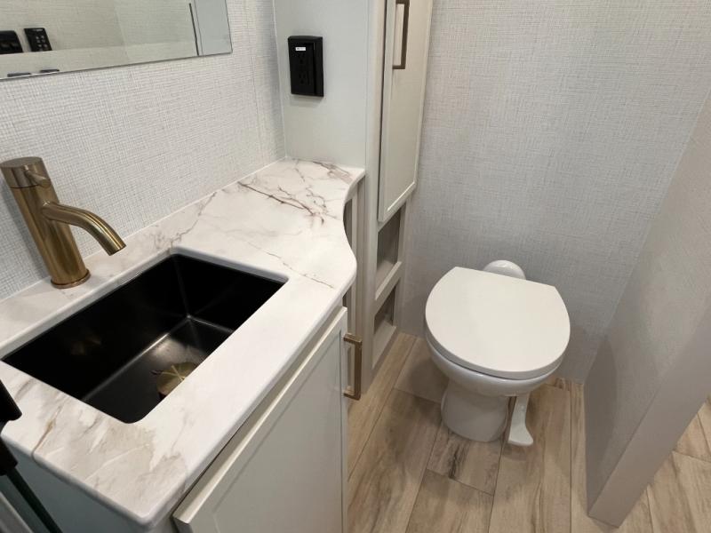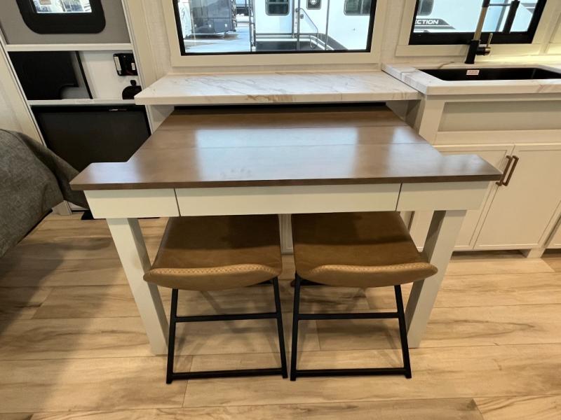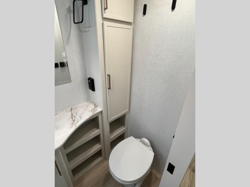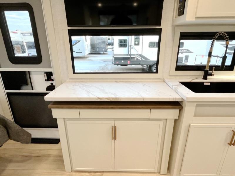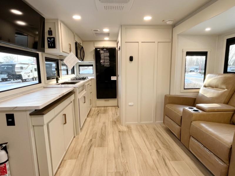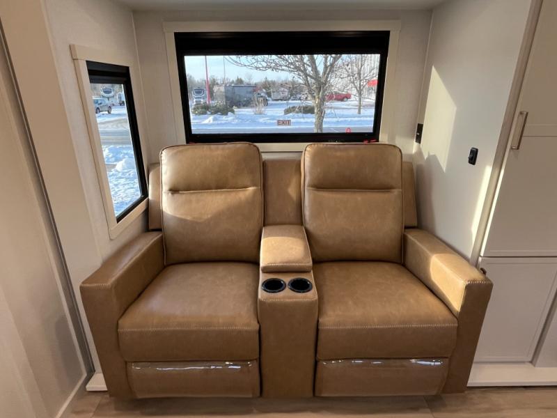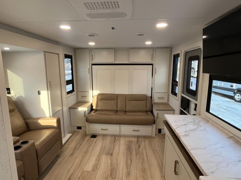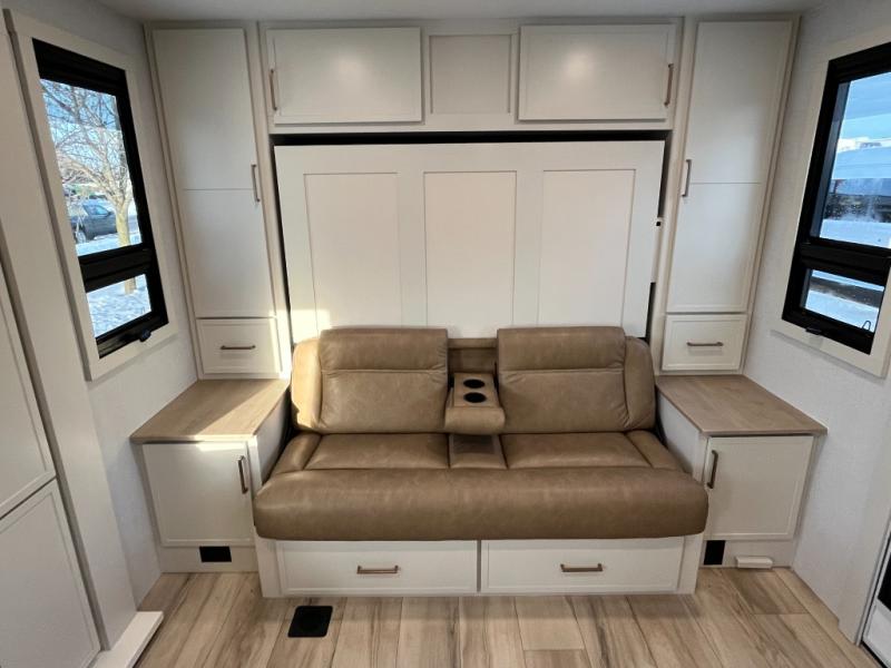 This is the perfect travel trailer for the couple looking for comfort at the campground! Once you've unloaded the pass-thru storage, you can put out the 16' patio awning and relax in your camp chairs. Head inside to make lunch in the fully equipped kitchen that includes a three-burner range, 30" convection microwave, and dishwasher prep. There is a pantry with outlets within the large slide out, along with a 10-cu. ft. refrigerator, plus theater seating across from the TV. And if you need sleeping space for guests, just choose the optional tri-fold sofa in place of the theater seating! You'll appreciate the front sofa plus a Feather-Lift bed system, providing seating space during the day and sleeping space at night! A pull-out table with a drawer provides a place to dine together, and a full bath on board will let you freshen up each day.
