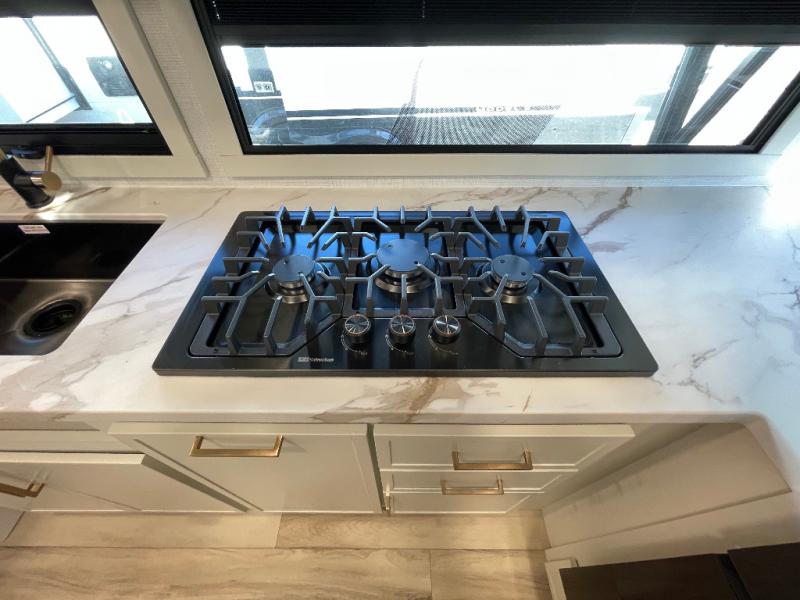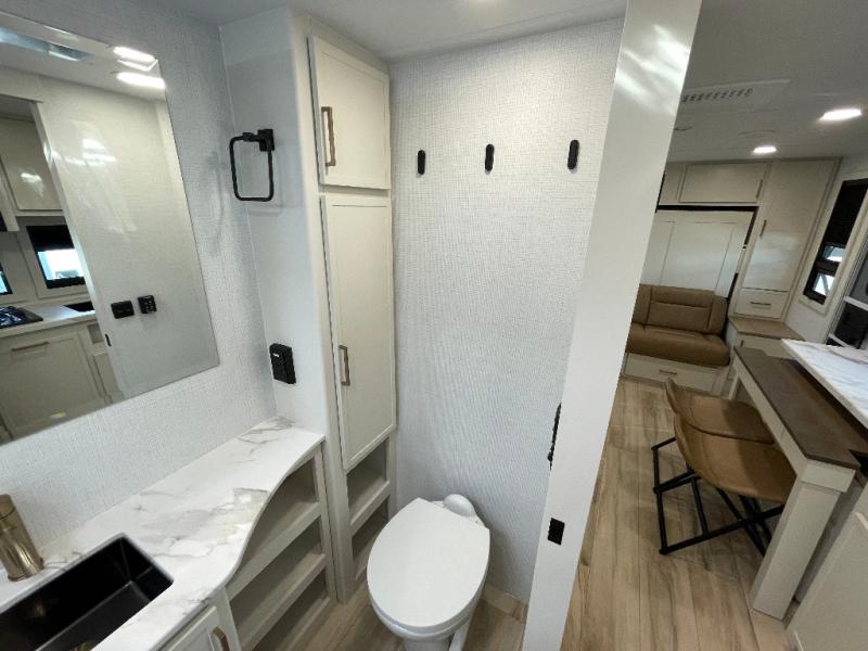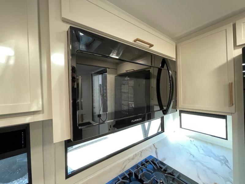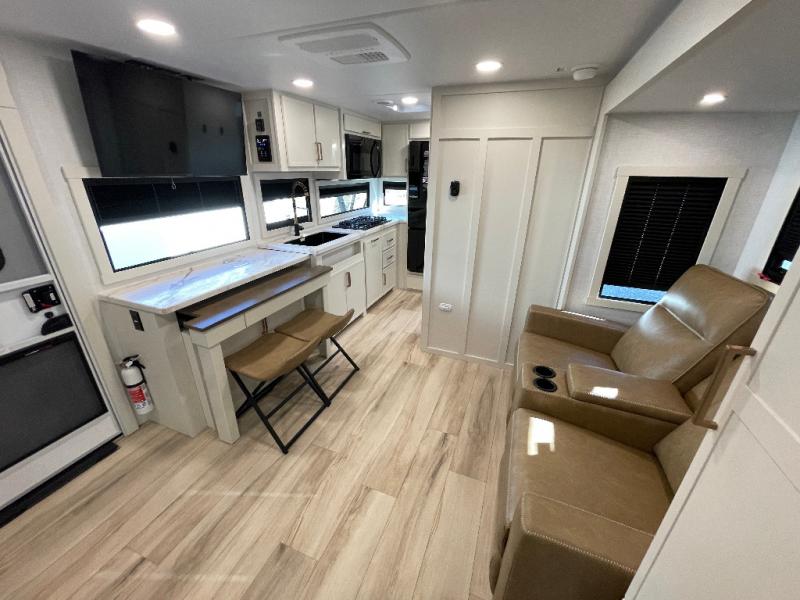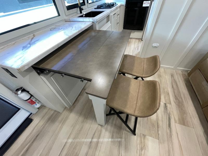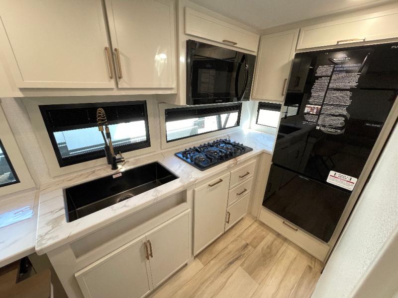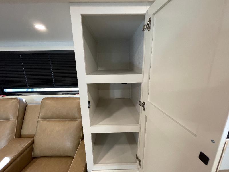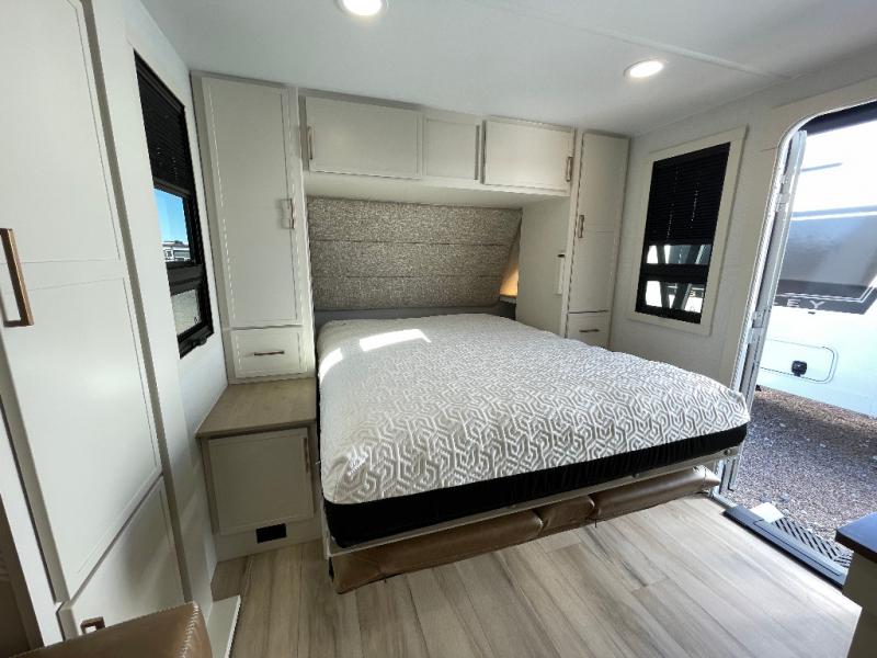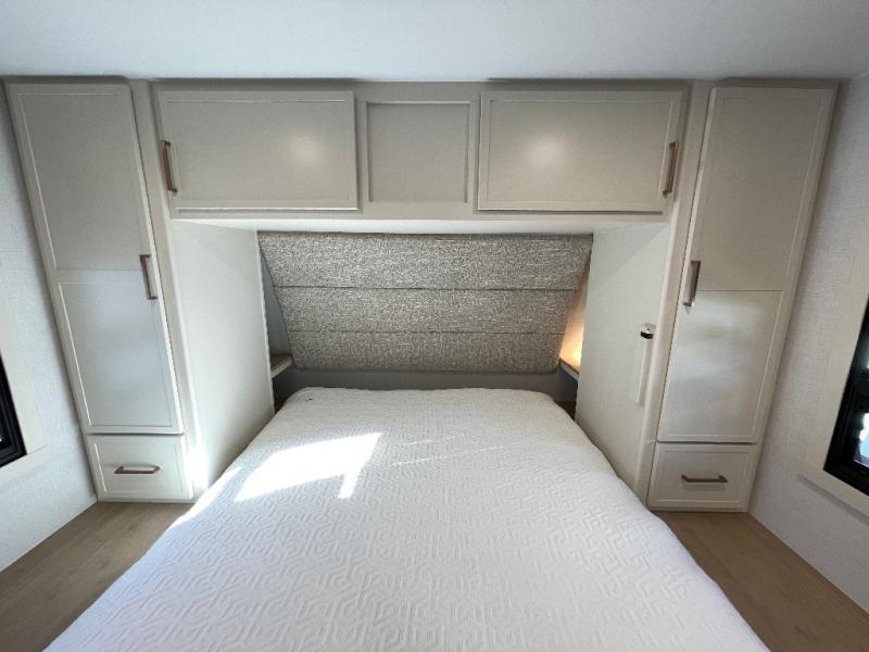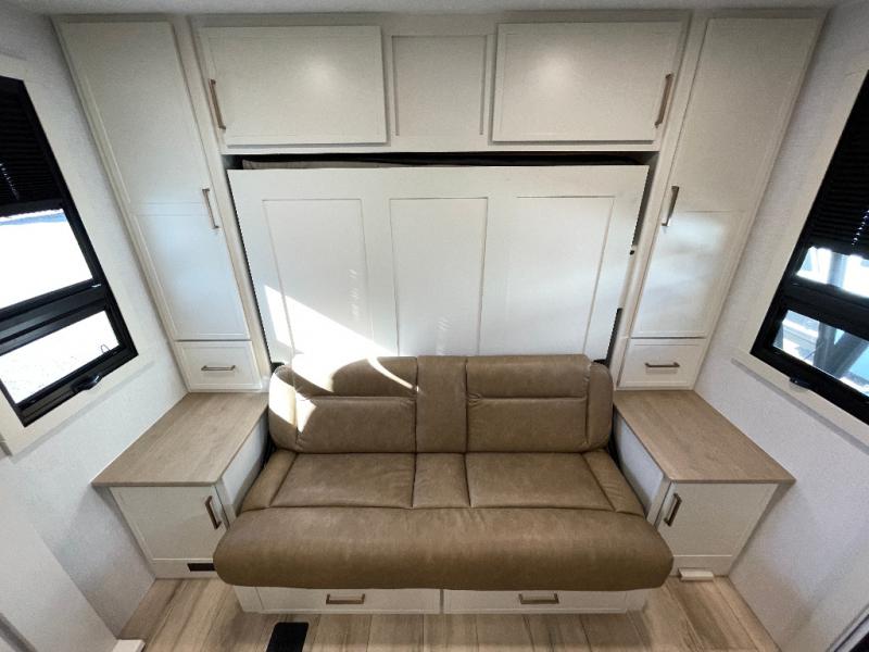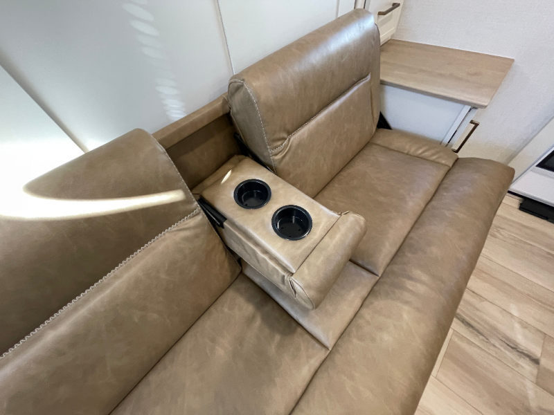 This is the perfect travel trailer for the couple looking for comfort at the campground! Once you've unloaded the pass-thru storage, you can put out the 16' patio awning and relax in your camp chairs. Head inside to make lunch in the fully equipped kitchen that includes a three-burner range, 30" convection microwave, and dishwasher prep. There is a pantry with outlets within the large slide out, along with a 10-cu. ft. refrigerator, plus theater seating across from the TV. And if you need sleeping space for guests, just choose the optional tri-fold sofa in place of the theater seating! You'll appreciate the front sofa plus a Feather-Lift bed system, providing seating space during the day and sleeping space at night! A pull-out table with a drawer provides a place to dine together, and a full bath on board will let you freshen up each day.