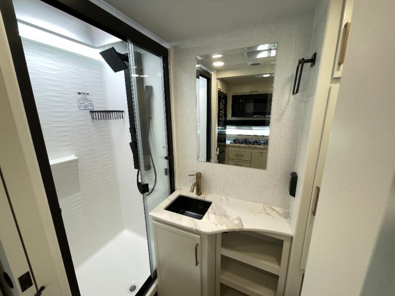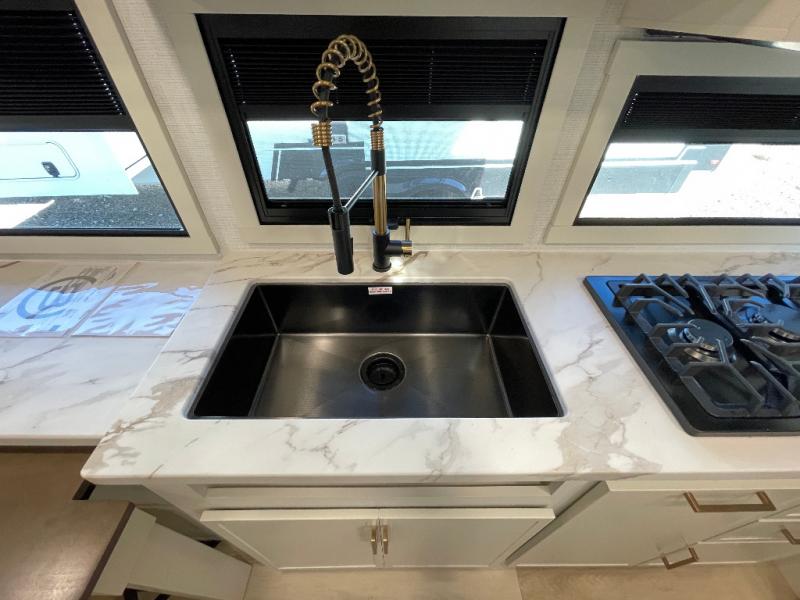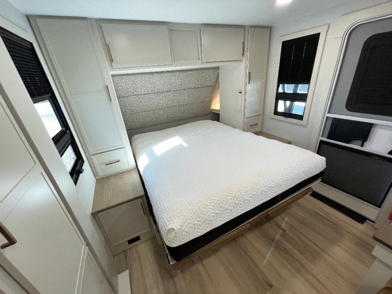The Model Ix by Brinkley is your ticket to lightweight towing and exceptional features. This premium half-ton towable travel trailer features Brinkley's CraftSense building materials for a higher level of construction, along with a seamless laminated aluminum exterior with automotive grade full-body paint and modern graphics. You will stay powered up thanks to the power package with a 200-watt solar panel, and the Road Armor suspension will help provide a smooth tow from home to campground. The interior of the Model Ix includes premium residential cabinets with dovetail drawers, an ultra quiet and efficient A/C system, and a SoundCore Boom 2 Bluetooth waterproof speaker so you can listen to your favorite tunes indoors or outdoors!