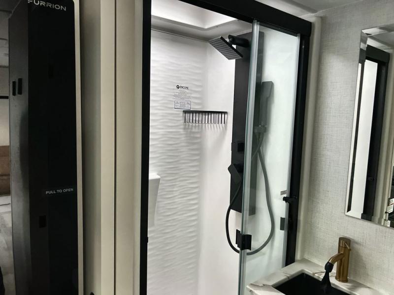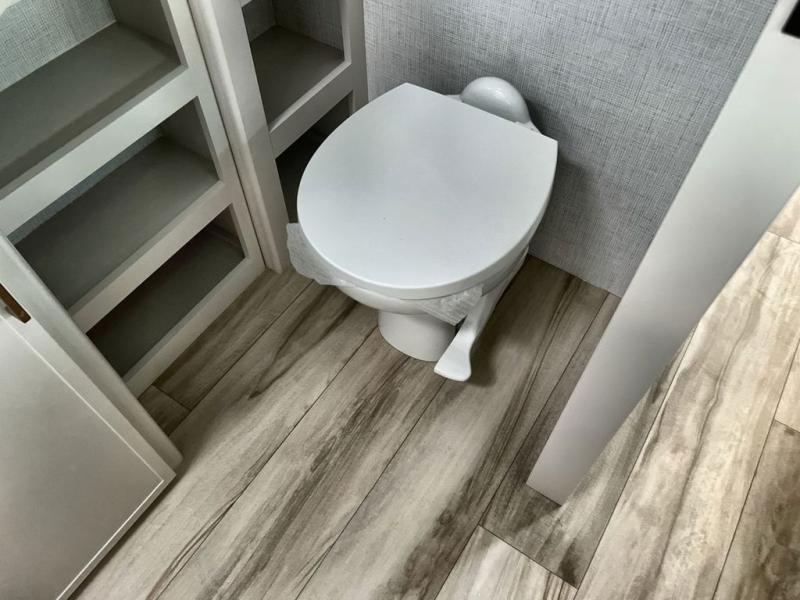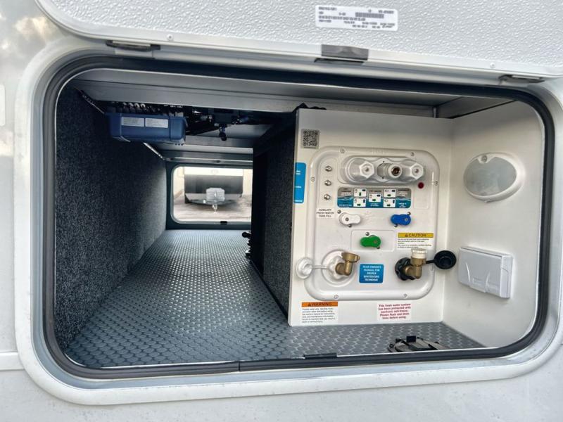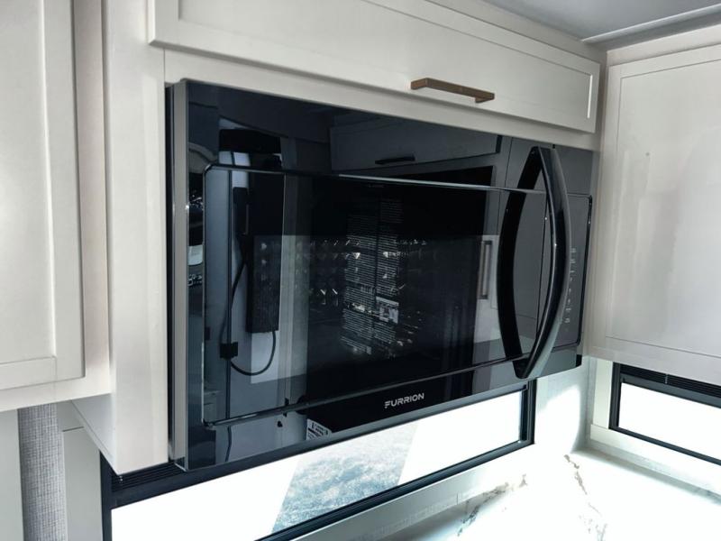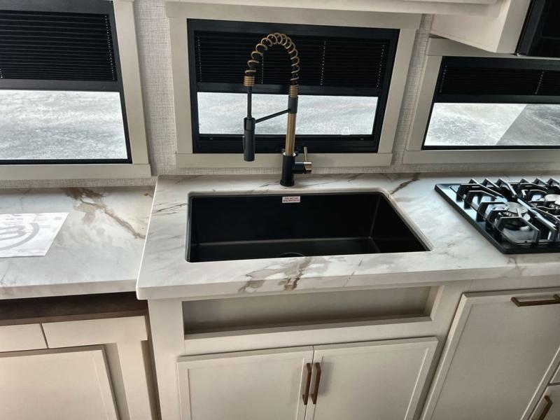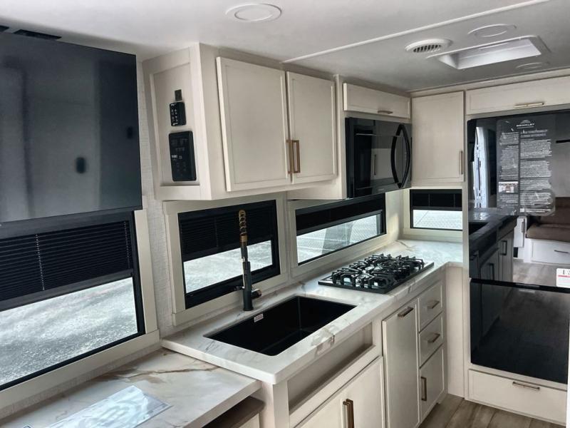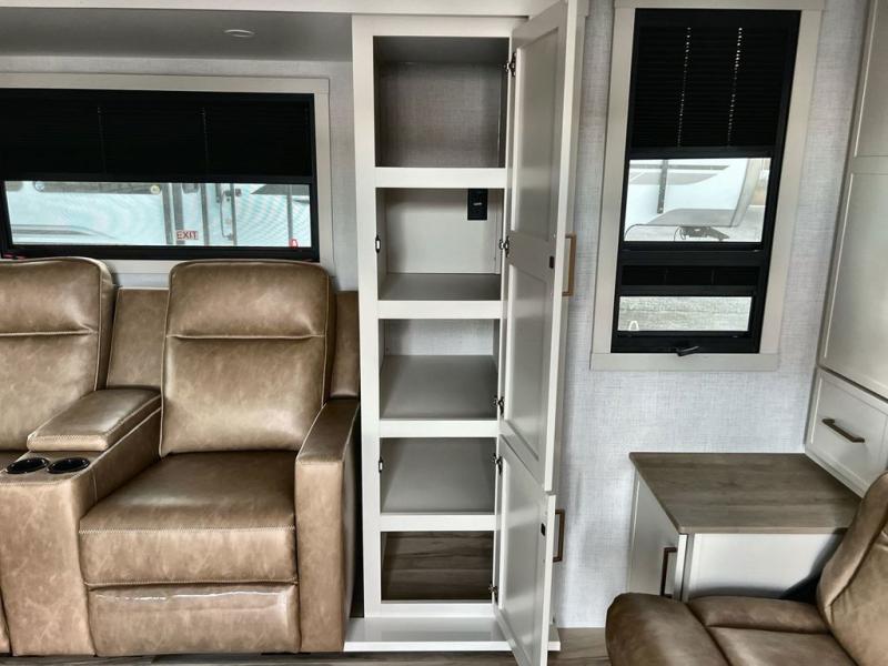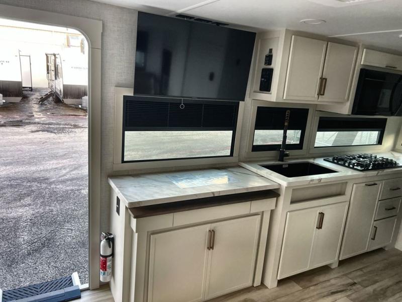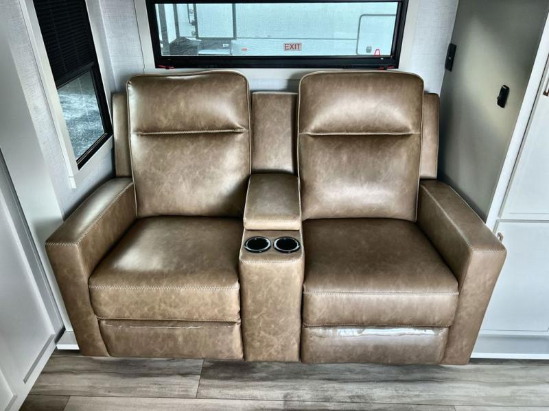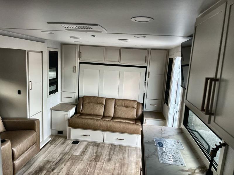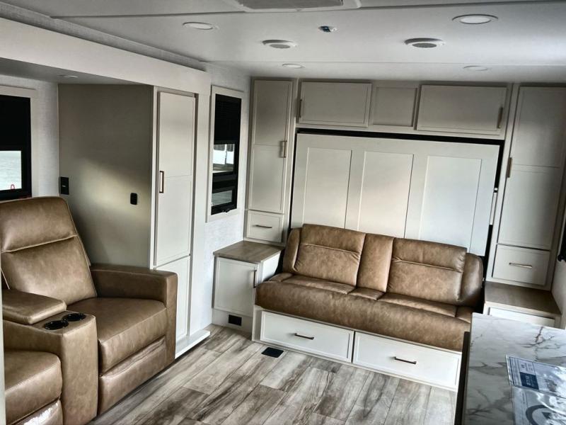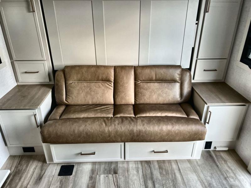 This is the perfect travel trailer for the couple looking for comfort at the campground! Once you've unloaded the pass-thru storage, you can put out the 16' patio awning and relax in your camp chairs. Head inside to make lunch in the fully equipped kitchen that includes a three-burner range, 30" convection microwave, and dishwasher prep. There is a pantry with outlets within the large slide out, along with a 10-cu. ft. refrigerator, plus theater seating across from the TV. And if you need sleeping space for guests, just choose the optional tri-fold sofa in place of the theater seating! You'll appreciate the front sofa plus a Feather-Lift bed system, providing seating space during the day and sleeping space at night! A pull-out table with a drawer provides a place to dine together, and a full bath on board will let you freshen up each day.