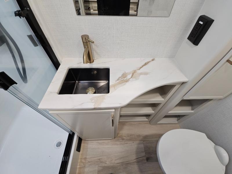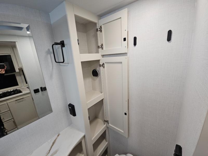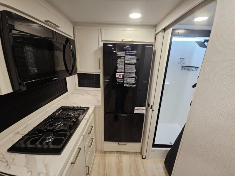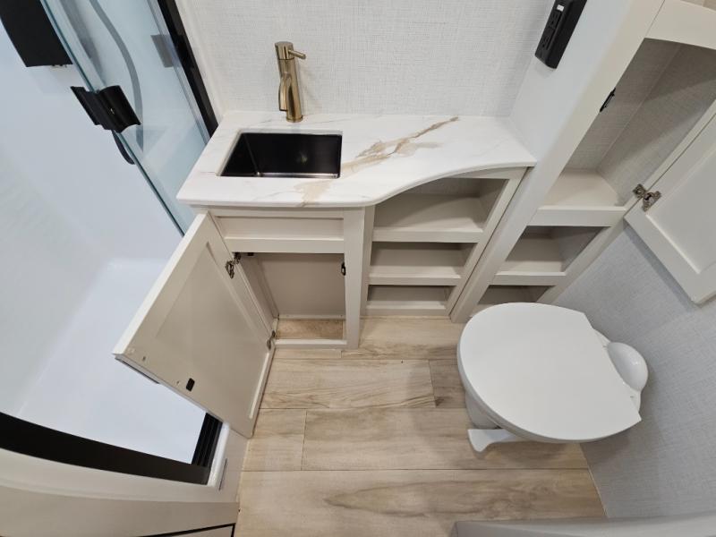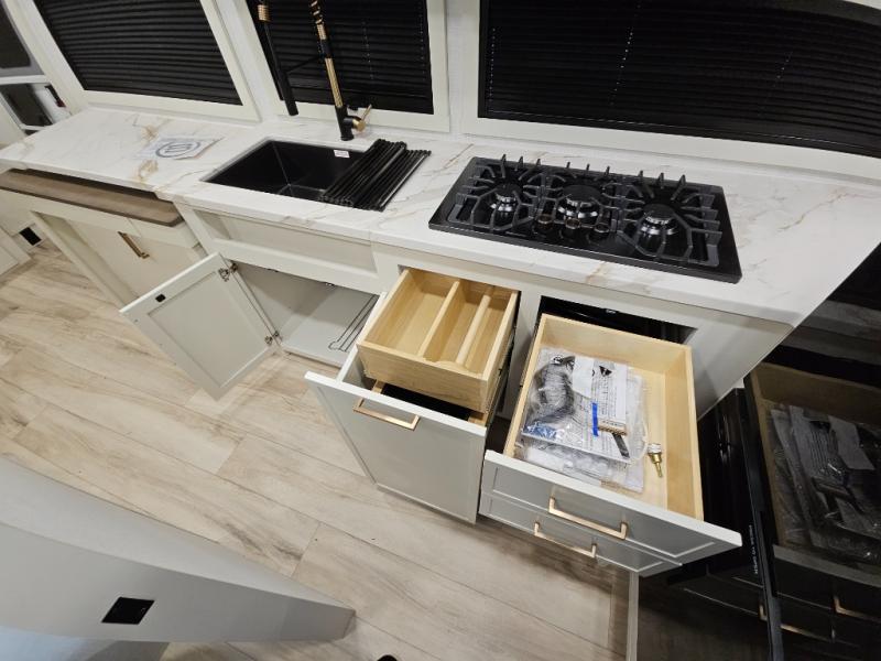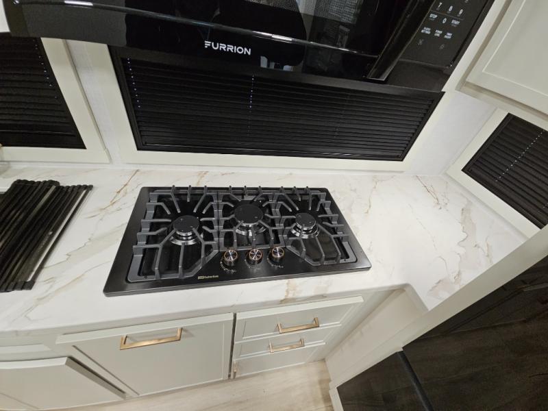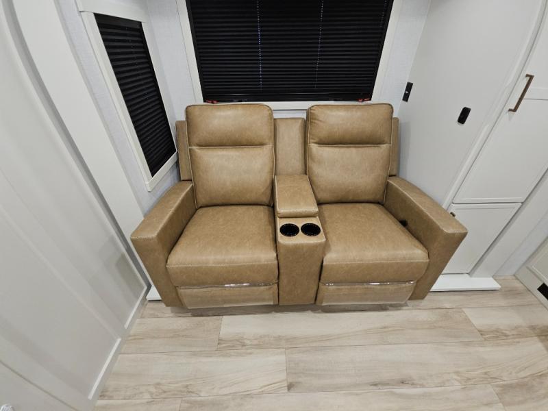 This is the perfect travel trailer for the couple looking for comfort at the campground! Once you've unloaded the pass-thru storage, you can put out the 16' patio awning and relax in your camp chairs. Head inside to make lunch in the fully equipped kitchen that includes a three-burner range, 30" convection microwave, and dishwasher prep. There is a pantry with outlets within the large slide out, along with a 10-cu. ft. refrigerator, plus theater seating across from the TV. And if you need sleeping space for guests, just choose the optional tri-fold sofa in place of the theater seating! You'll appreciate the front sofa plus a Feather-Lift bed system, providing seating space during the day and sleeping space at night! A pull-out table with a drawer provides a place to dine together, and a full bath on board will let you freshen up each day.
