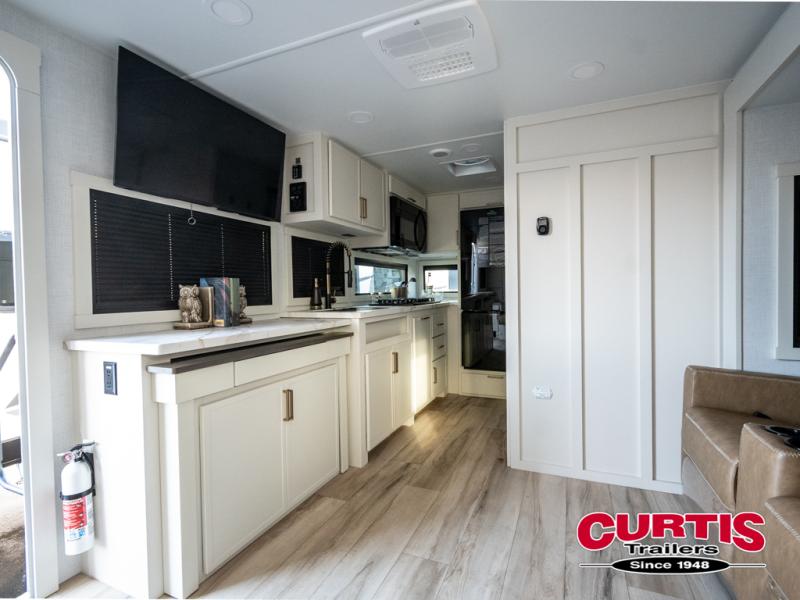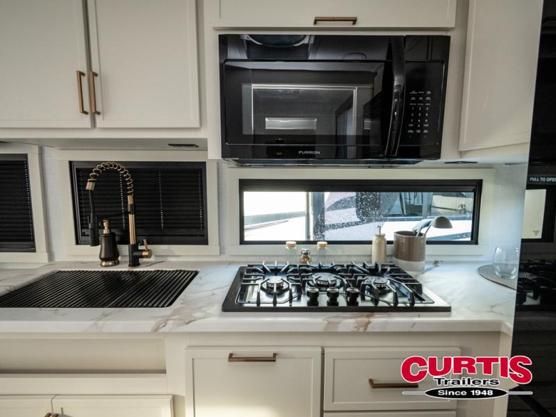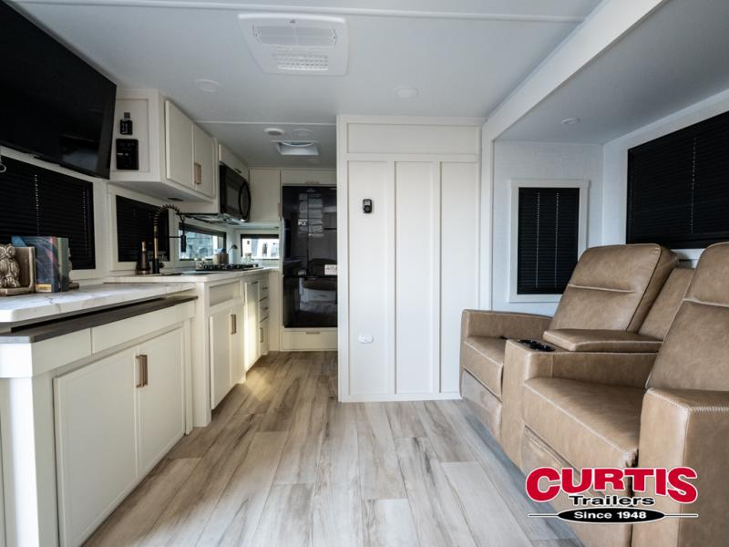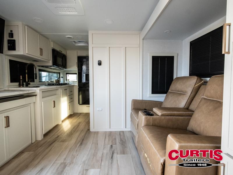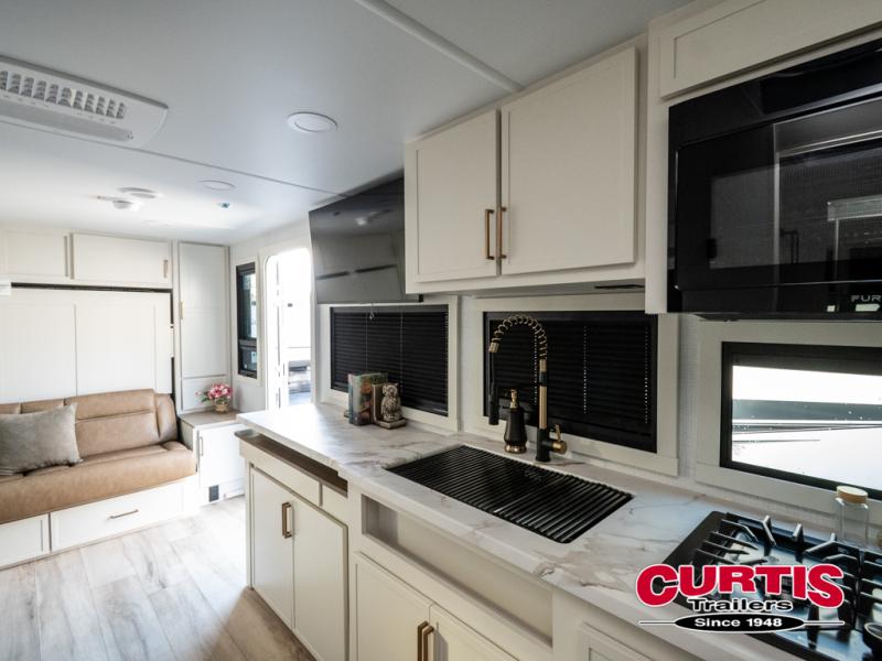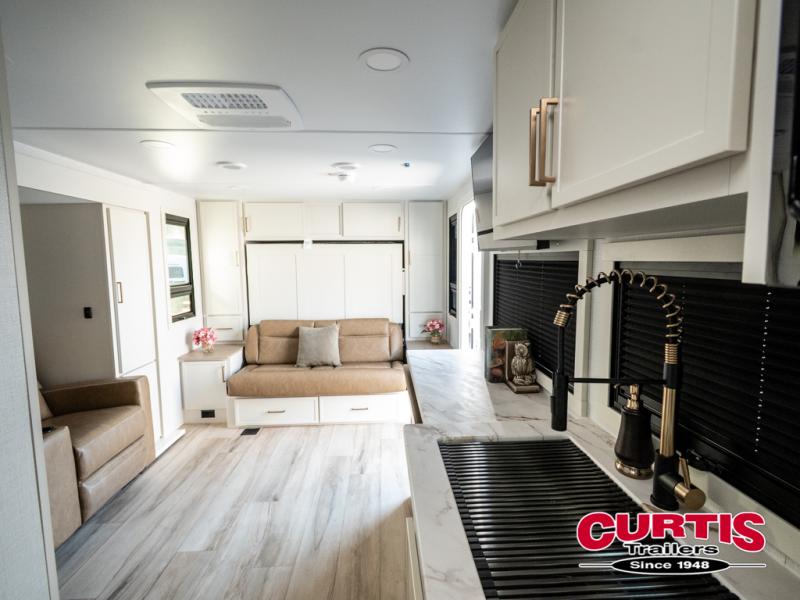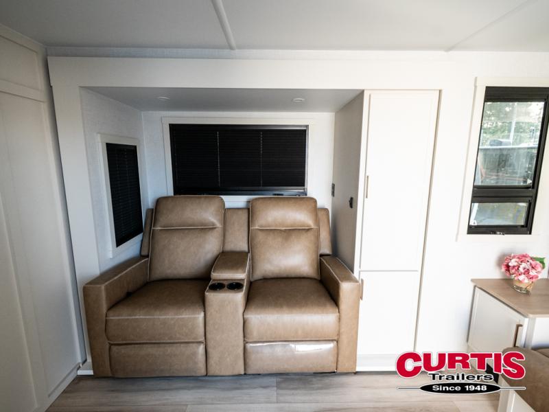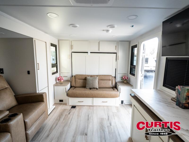 This is the perfect travel trailer for the couple looking for comfort at the campground! Once you've unloaded the pass-thru storage, you can put out the 16' patio awning and relax in your camp chairs. Head inside to make lunch in the fully equipped kitchen that includes a three-burner range, 30" convection microwave, and dishwasher prep. There is a pantry with outlets within the large slide out, along with a 10-cu. ft. refrigerator, plus theater seating across from the TV. And if you need sleeping space for guests, just choose the optional tri-fold sofa in place of the theater seating! You'll appreciate the front sofa plus a Feather-Lift bed system, providing seating space during the day and sleeping space at night! A pull-out table with a drawer provides a place to dine together, and a full bath on board will let you freshen up each day.