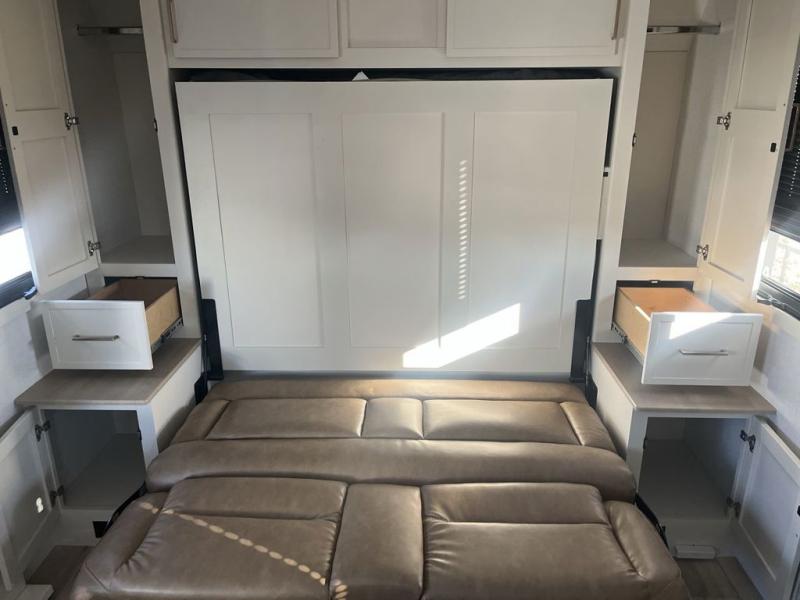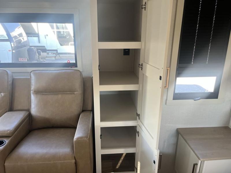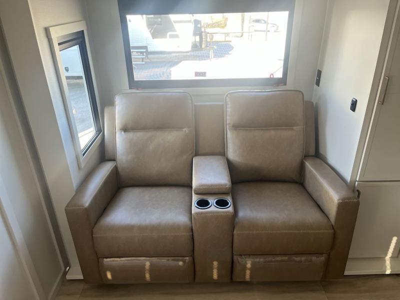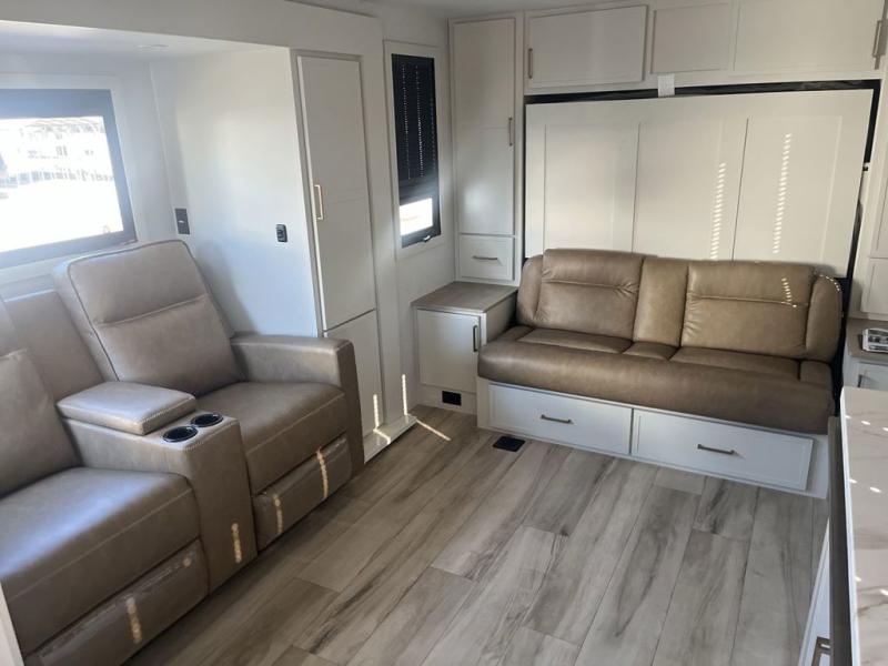 This is the perfect travel trailer for the couple looking for comfort at the campground! Once you've unloaded the pass-thru storage, you can put out the 16' patio awning and relax in your camp chairs. Head inside to make lunch in the fully equipped kitchen that includes a three-burner range, 30" convection microwave, and dishwasher prep. There is a pantry with outlets within the large slide out, along with a 10-cu. ft. refrigerator, plus theater seating across from the TV. And if you need sleeping space for guests, just choose the optional tri-fold sofa in place of the theater seating! You'll appreciate the front sofa plus a Feather-Lift bed system, providing seating space during the day and sleeping space at night! A pull-out table with a drawer provides a place to dine together, and a full bath on board will let you freshen up each day.