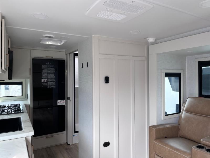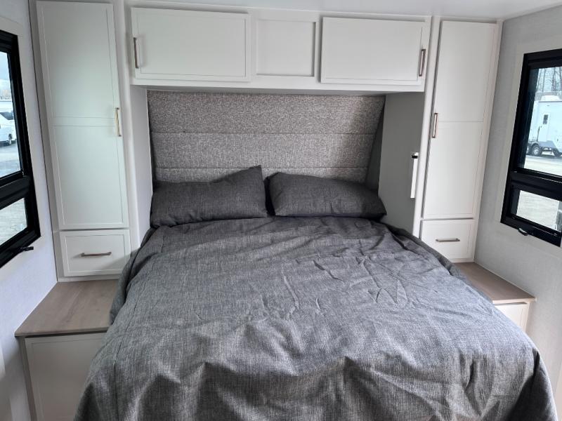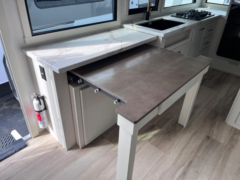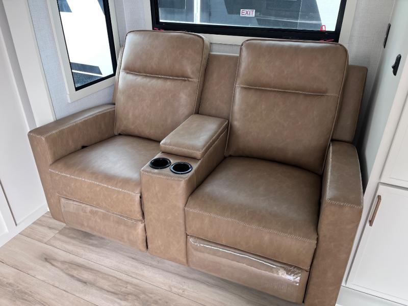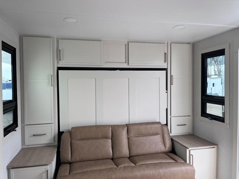 This is the perfect travel trailer for the couple looking for comfort at the campground! Once you've unloaded the pass-thru storage, you can put out the 16' patio awning and relax in your camp chairs. Head inside to make lunch in the fully equipped kitchen that includes a three-burner range, 30" convection microwave, and dishwasher prep. There is a pantry with outlets within the large slide out, along with a 10-cu. ft. refrigerator, plus theater seating across from the TV. And if you need sleeping space for guests, just choose the optional tri-fold sofa in place of the theater seating! You'll appreciate the front sofa plus a Feather-Lift bed system, providing seating space during the day and sleeping space at night! A pull-out table with a drawer provides a place to dine together, and a full bath on board will let you freshen up each day.