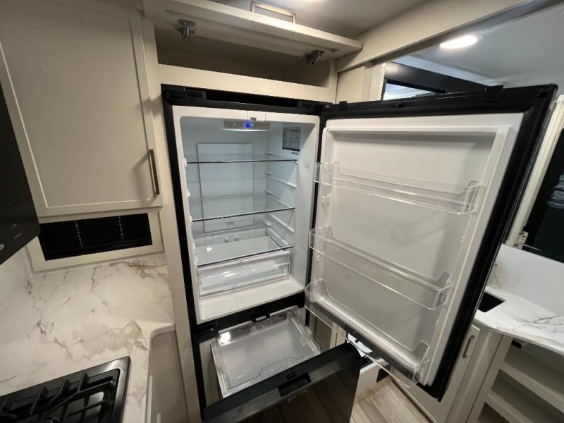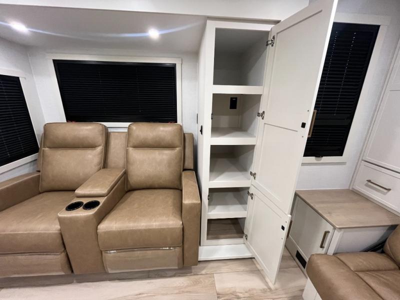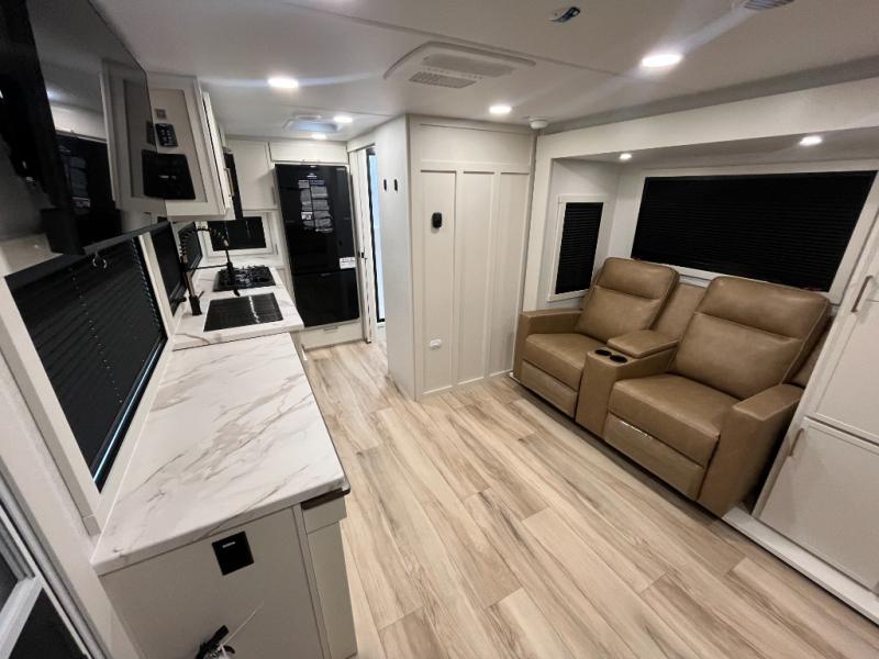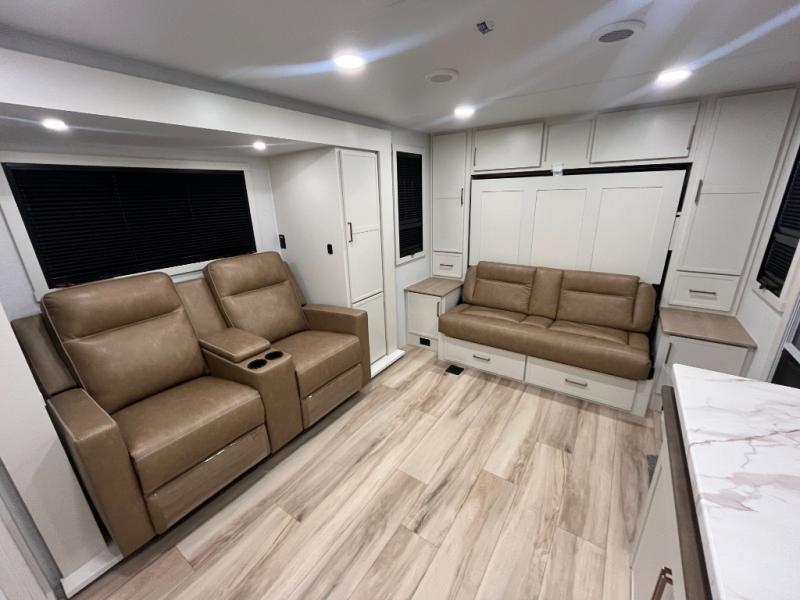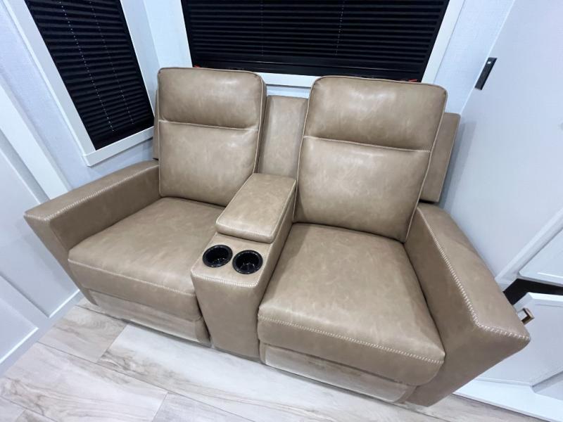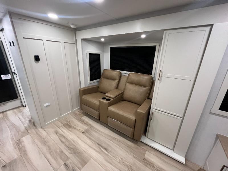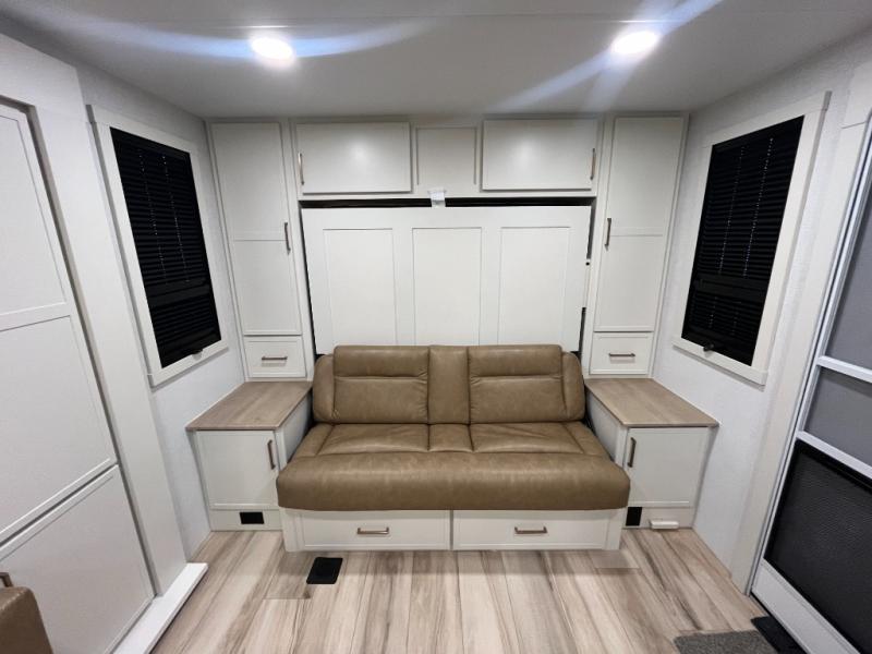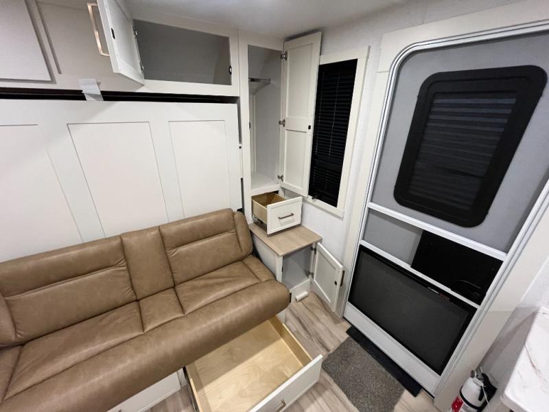 This is the perfect travel trailer for the couple looking for comfort at the campground! Once you've unloaded the pass-thru storage, you can put out the 16' patio awning and relax in your camp chairs. Head inside to make lunch in the fully equipped kitchen that includes a three-burner range, 30" convection microwave, and dishwasher prep. There is a pantry with outlets within the large slide out, along with a 10-cu. ft. refrigerator, plus theater seating across from the TV. And if you need sleeping space for guests, just choose the optional tri-fold sofa in place of the theater seating! You'll appreciate the front sofa plus a Feather-Lift bed system, providing seating space during the day and sleeping space at night! A pull-out table with a drawer provides a place to dine together, and a full bath on board will let you freshen up each day.