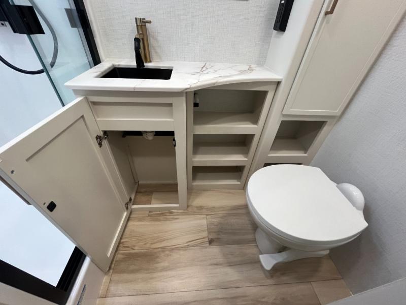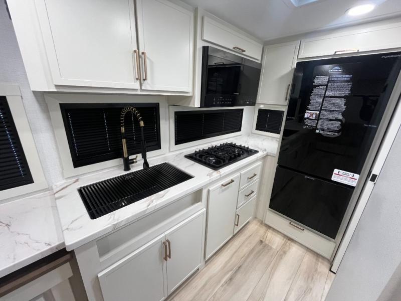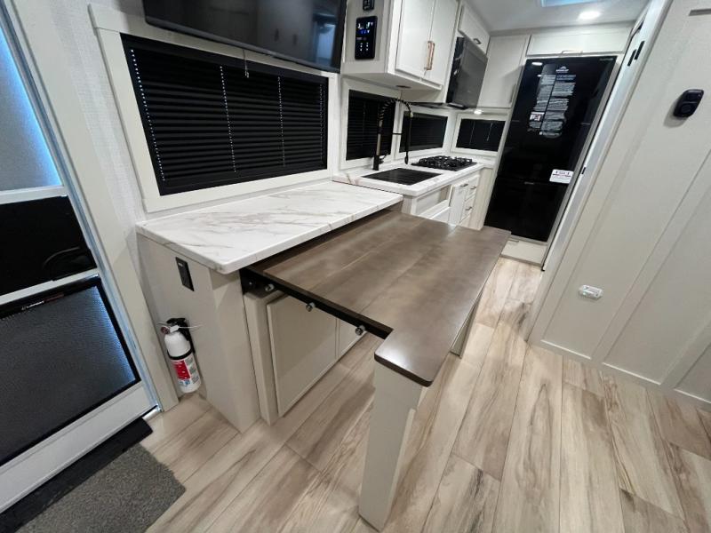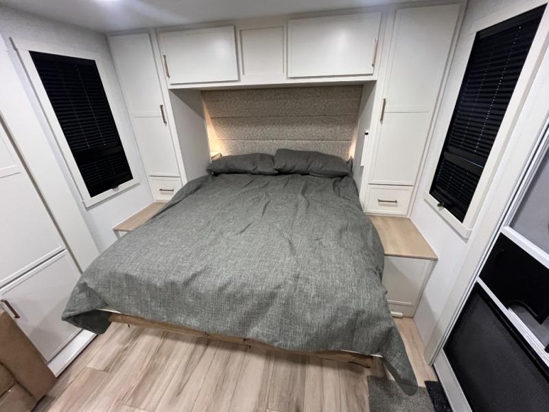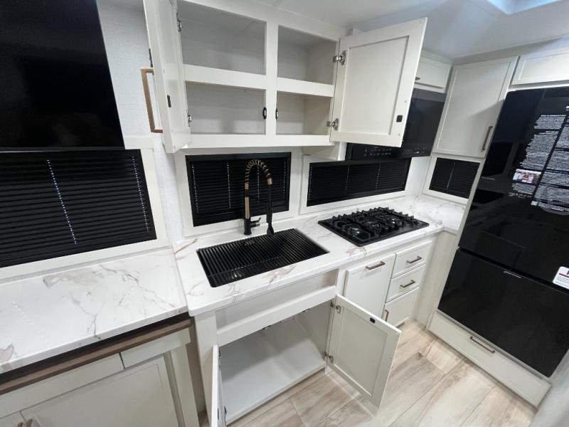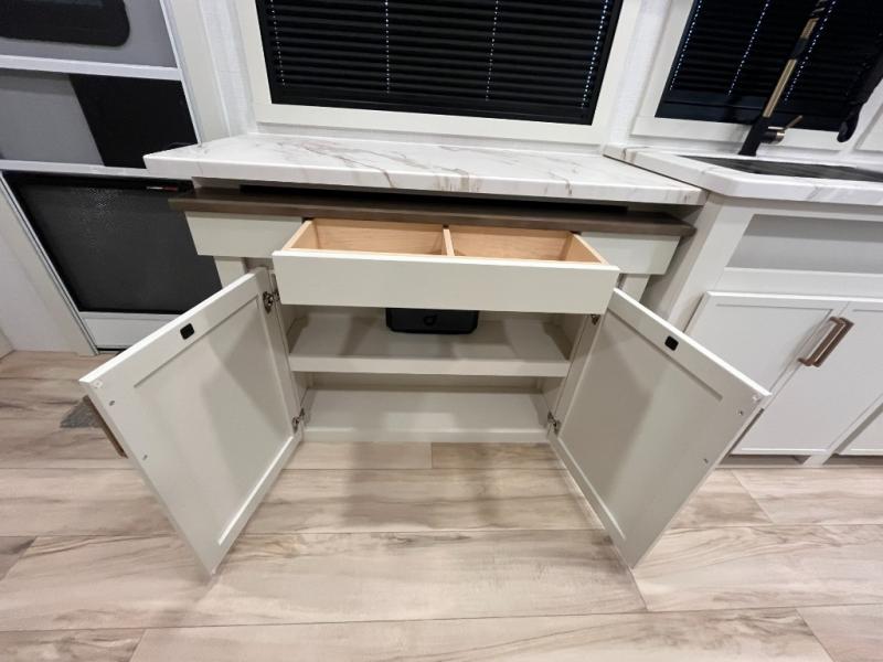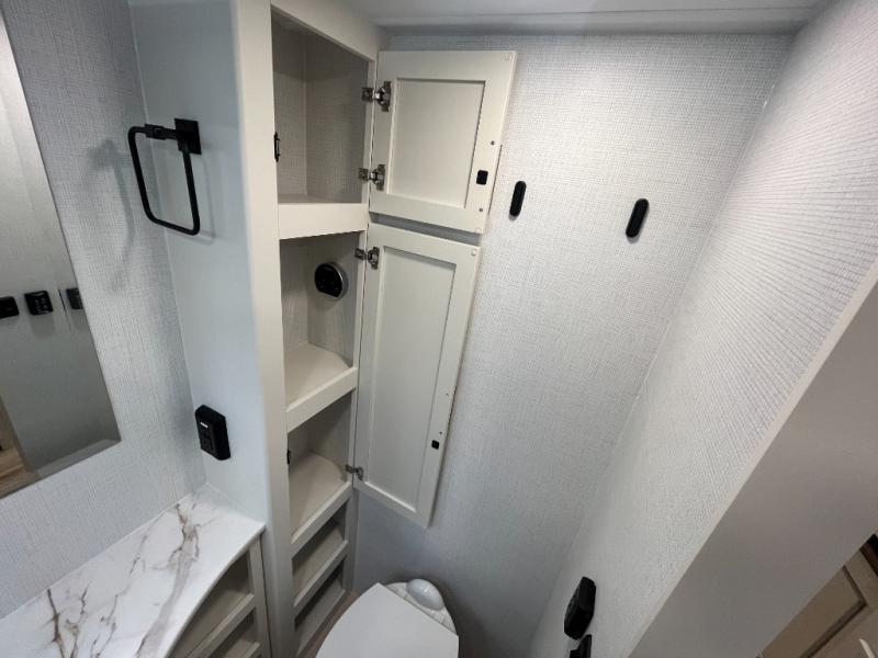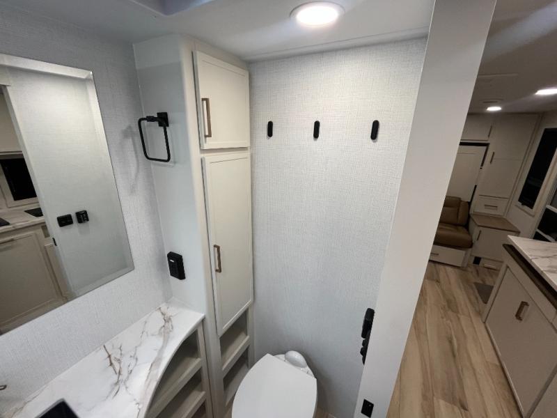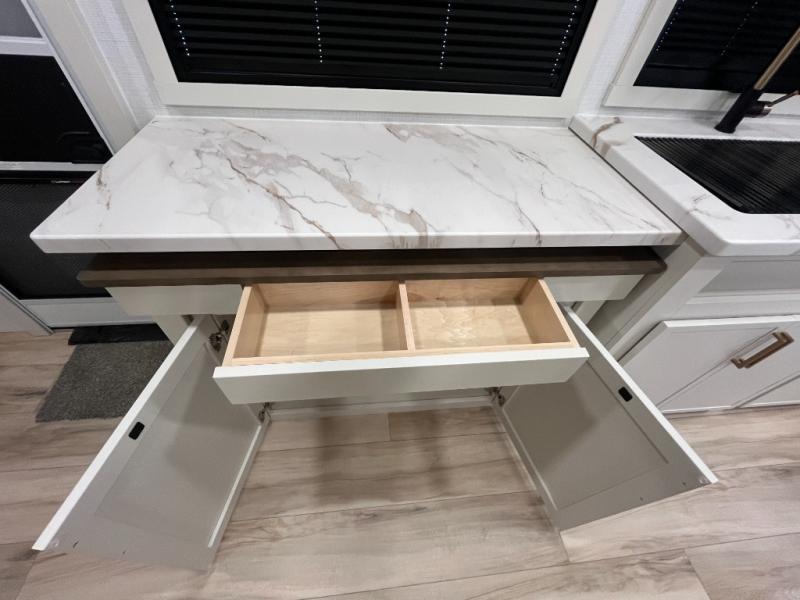 This is the perfect travel trailer for the couple looking for comfort at the campground! Once you've unloaded the pass-thru storage, you can put out the 16' patio awning and relax in your camp chairs. Head inside to make lunch in the fully equipped kitchen that includes a three-burner range, 30" convection microwave, and dishwasher prep. There is a pantry with outlets within the large slide out, along with a 10-cu. ft. refrigerator, plus theater seating across from the TV. And if you need sleeping space for guests, just choose the optional tri-fold sofa in place of the theater seating! You'll appreciate the front sofa plus a Feather-Lift bed system, providing seating space during the day and sleeping space at night! A pull-out table with a drawer provides a place to dine together, and a full bath on board will let you freshen up each day.