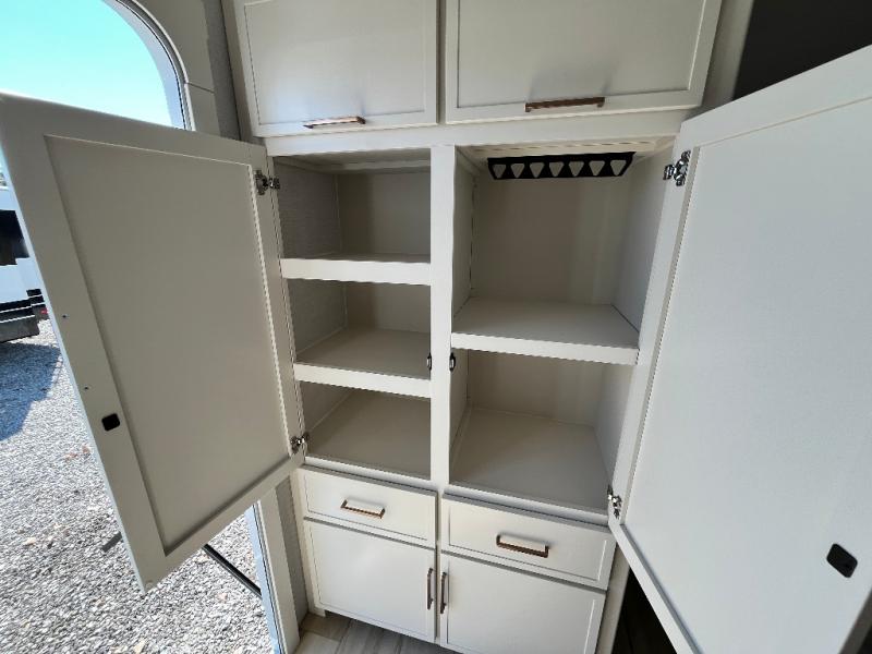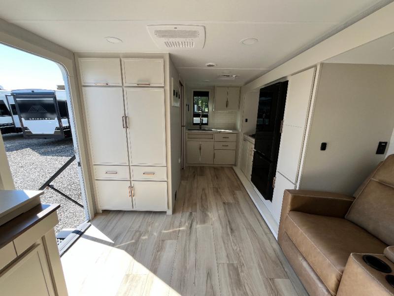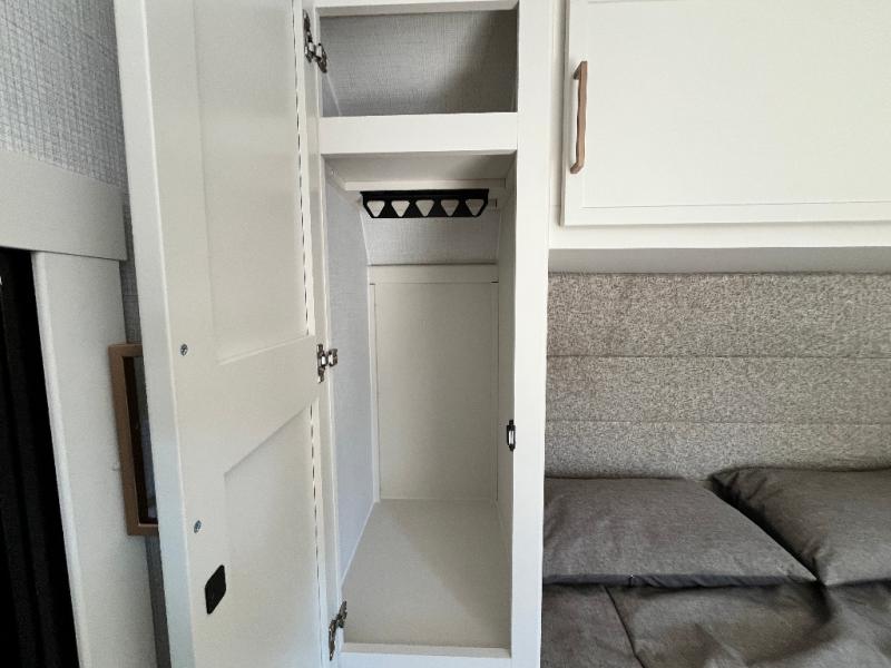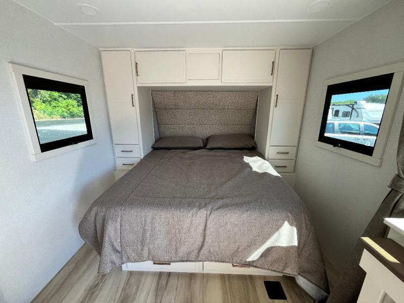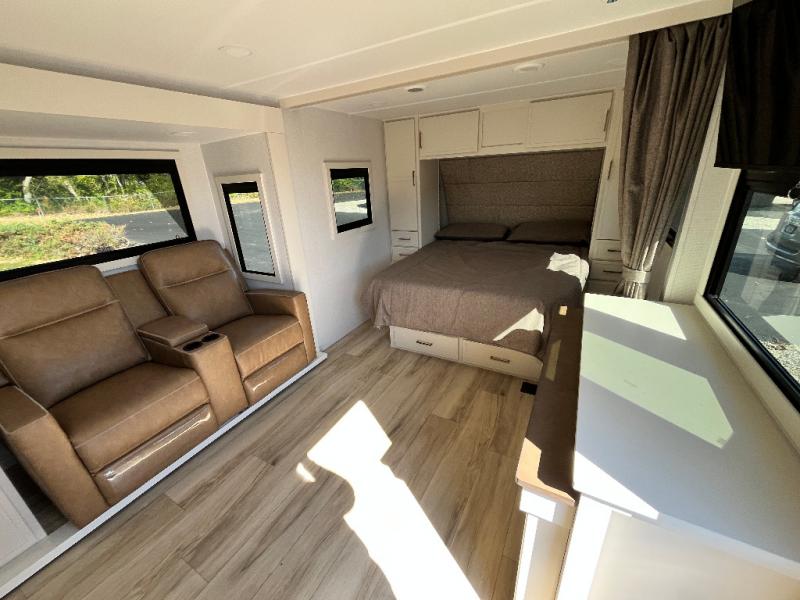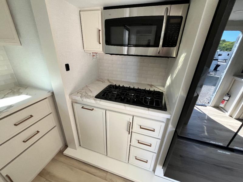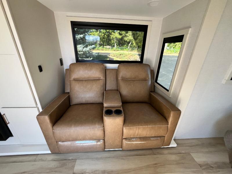 This is the perfect travel trailer for the couple looking for comfort at the campground! Once you've unloaded the pass-thru storage, you can put out the 17' patio awning and relax in your camp chairs. Head inside to make lunch in the fully-equipped kitchen that incudes a range, 30" convection microwave, and dishwasher prep. There is a pantry with outlets within the large slide out, along with a 10 cu. ft. refrigerator that you can access with the slide in, plus theater seating across from the TV. And if you need sleeping space for guests, just choose the optional tri-fold sofa in place of the theater seating! A pull-out table with a drawer provides a place to dine together, and the entryway closet will be perfect to keep jackets and shoes tidy. You'll get a great night's rest on the front queen bed with four drawers, nightstand cubbies, and a room divider for a little more privacy.