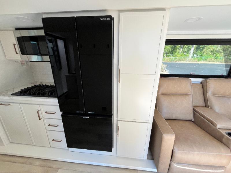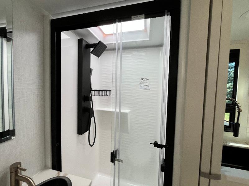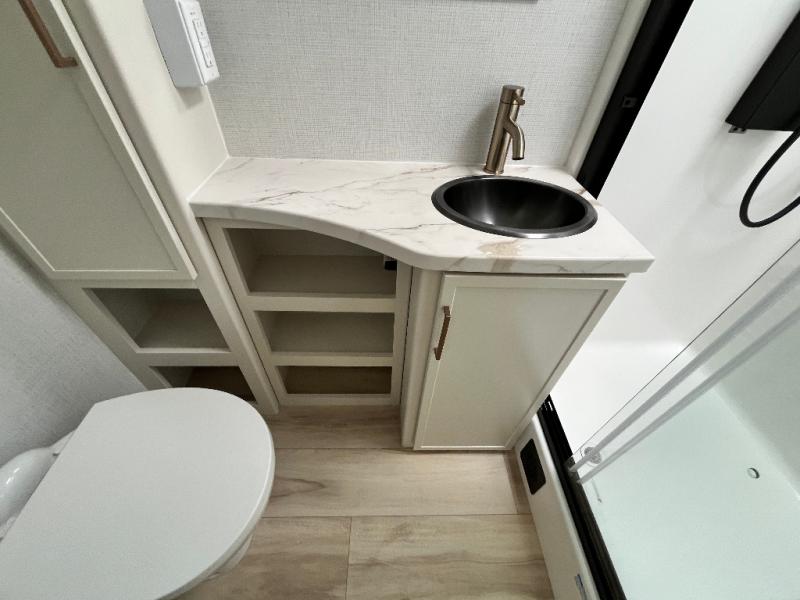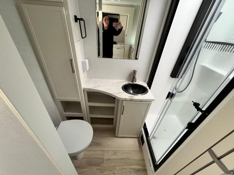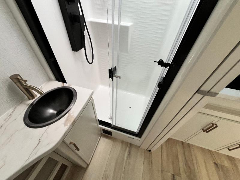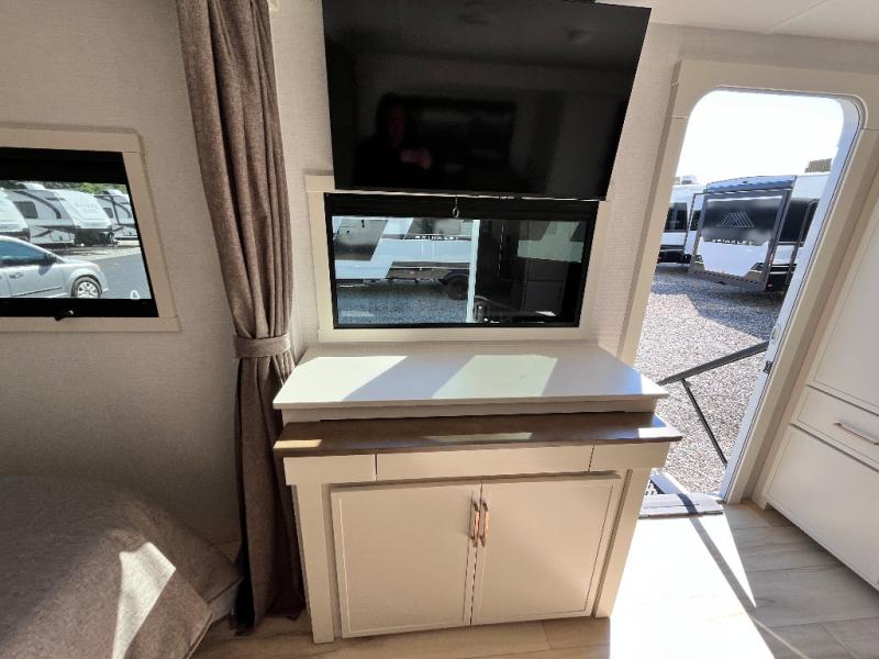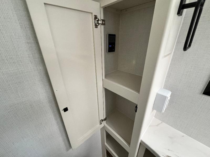 This is the perfect travel trailer for the couple looking for comfort at the campground! Once you've unloaded the pass-thru storage, you can put out the 17' patio awning and relax in your camp chairs. Head inside to make lunch in the fully-equipped kitchen that incudes a range, 30" convection microwave, and dishwasher prep. There is a pantry with outlets within the large slide out, along with a 10 cu. ft. refrigerator that you can access with the slide in, plus theater seating across from the TV. And if you need sleeping space for guests, just choose the optional tri-fold sofa in place of the theater seating! A pull-out table with a drawer provides a place to dine together, and the entryway closet will be perfect to keep jackets and shoes tidy. You'll get a great night's rest on the front queen bed with four drawers, nightstand cubbies, and a room divider for a little more privacy.