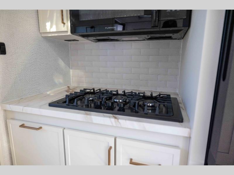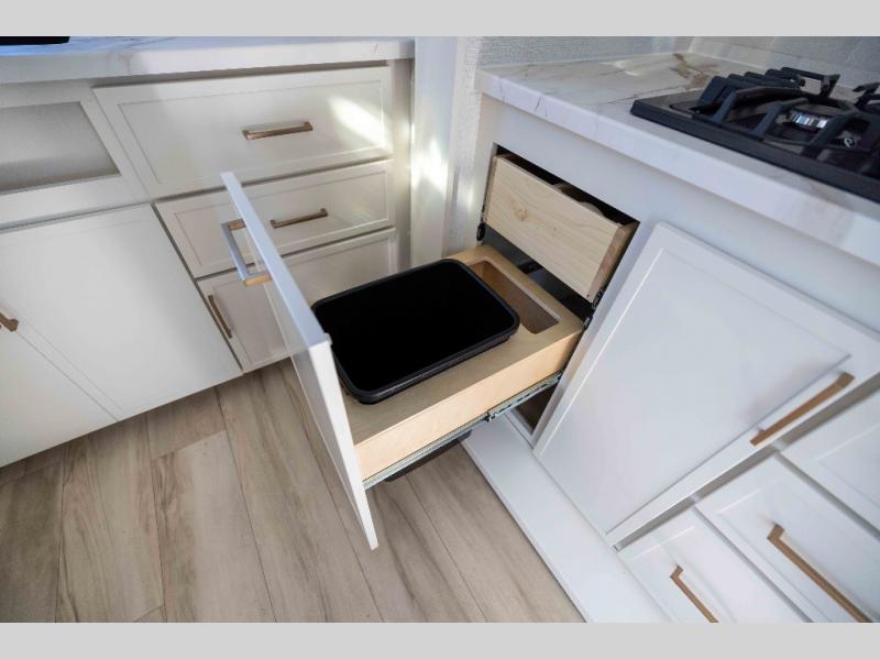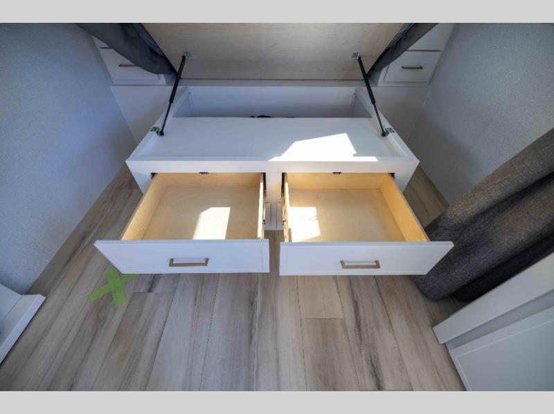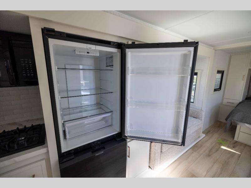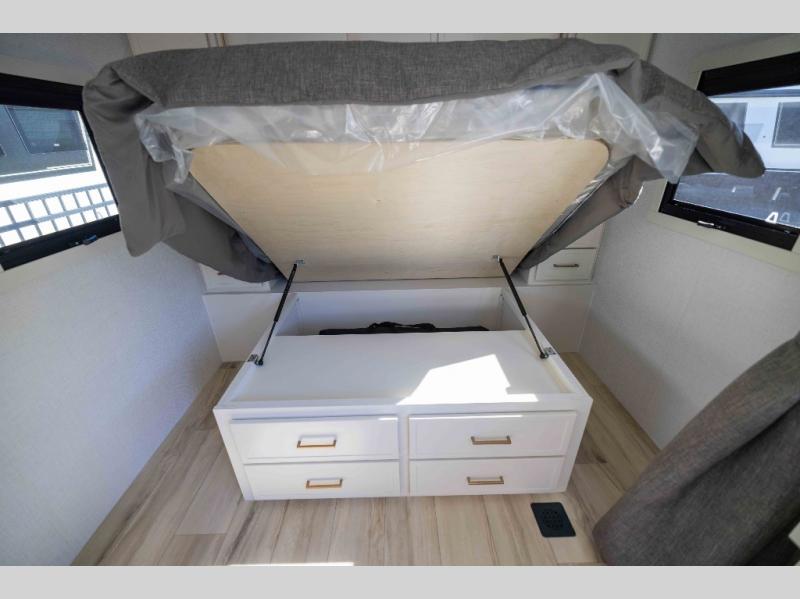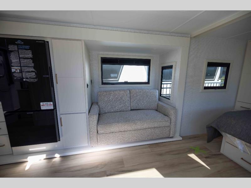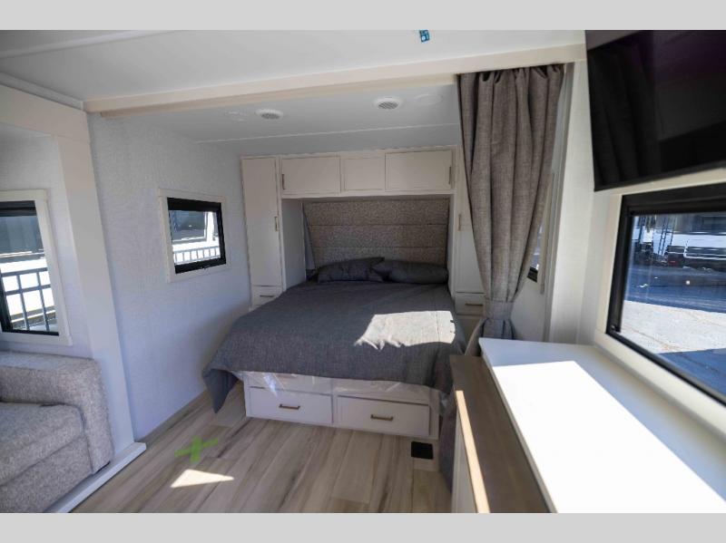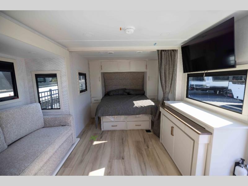 This is the perfect travel trailer for the couple looking for comfort at the campground! Once you've unloaded the pass-thru storage, you can put out the 17' patio awning and relax in your camp chairs. Head inside to make lunch in the fully-equipped kitchen that incudes a range, 30" convection microwave, and dishwasher prep. There is a pantry with outlets within the large slide out, along with a 10 cu. ft. refrigerator that you can access with the slide in, plus theater seating across from the TV. And if you need sleeping space for guests, just choose the optional tri-fold sofa in place of the theater seating! A pull-out table with a drawer provides a place to dine together, and the entryway closet will be perfect to keep jackets and shoes tidy. You'll get a great night's rest on the front queen bed with four drawers, nightstand cubbies, and a room divider for a little more privacy.