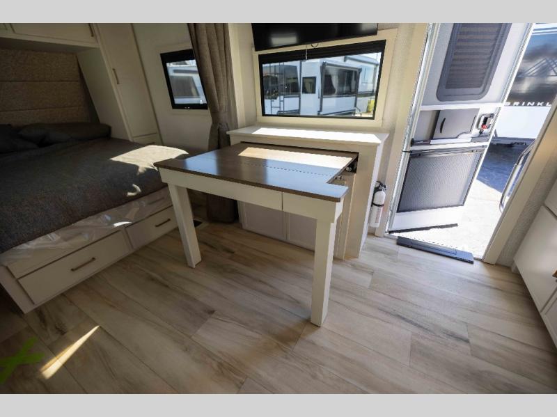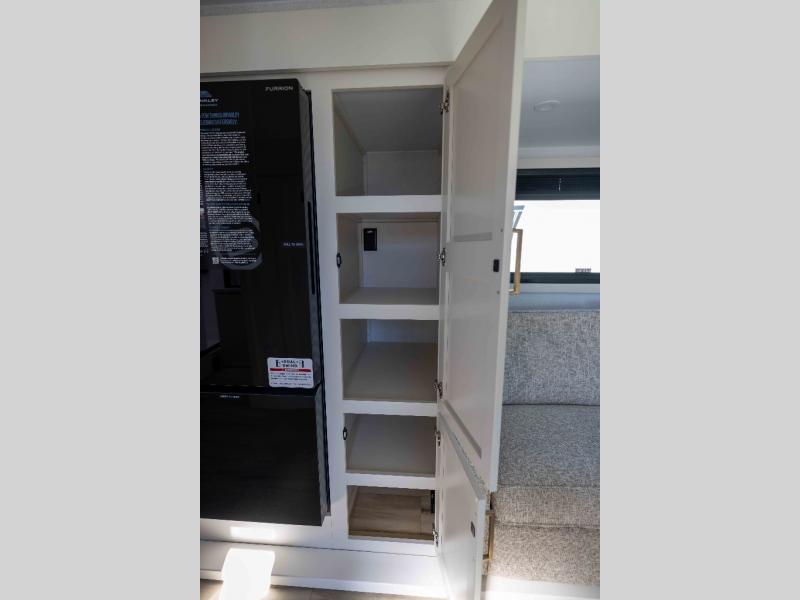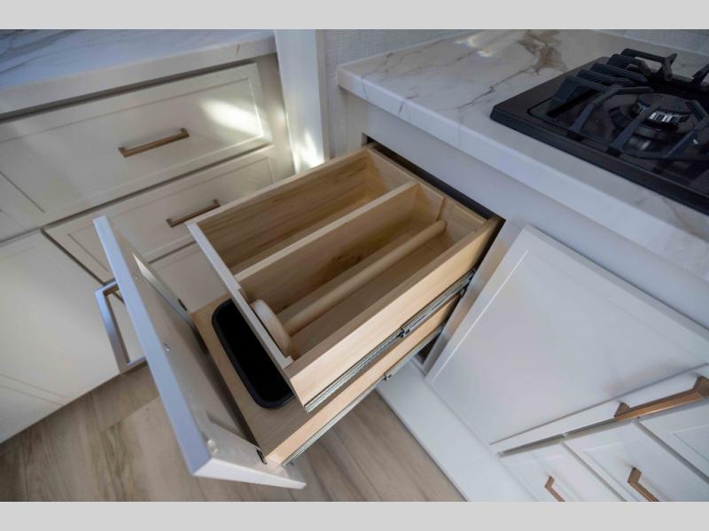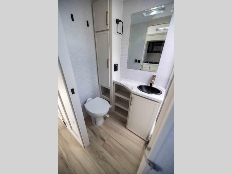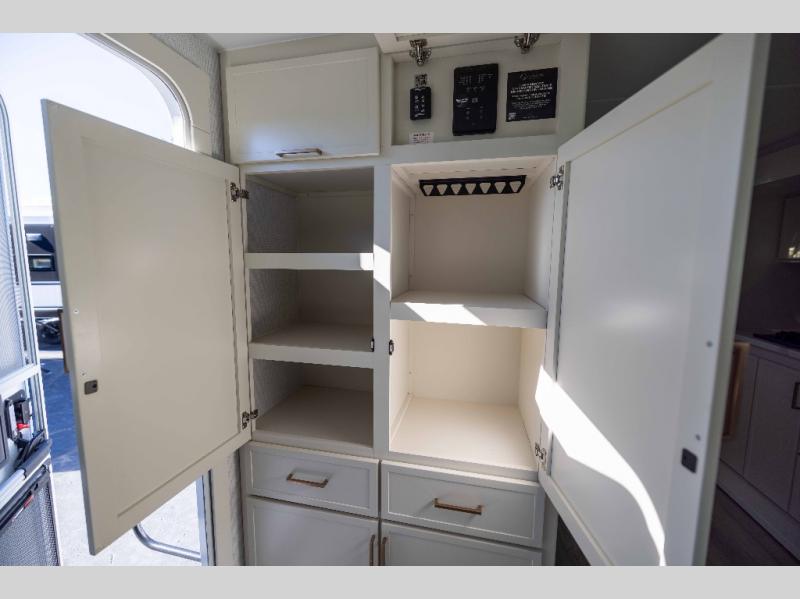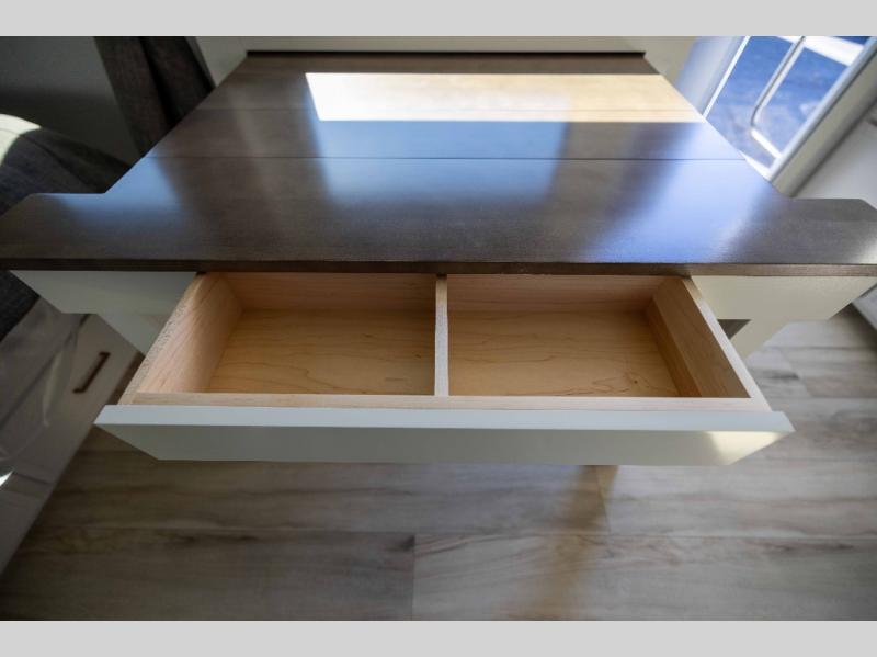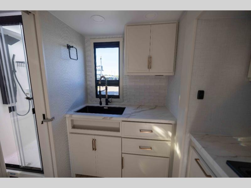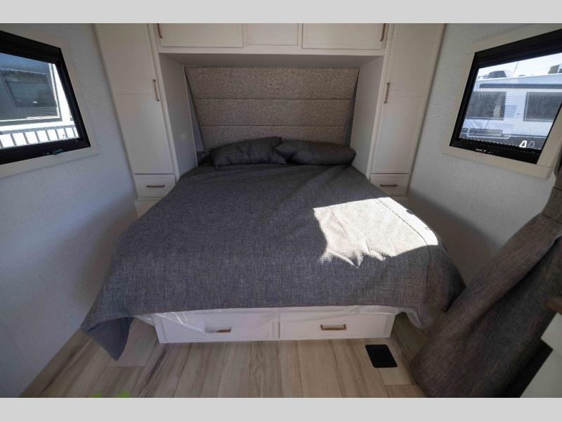 This is the perfect travel trailer for the couple looking for comfort at the campground! Once you've unloaded the pass-thru storage, you can put out the 17' patio awning and relax in your camp chairs. Head inside to make lunch in the fully-equipped kitchen that incudes a range, 30" convection microwave, and dishwasher prep. There is a pantry with outlets within the large slide out, along with a 10 cu. ft. refrigerator that you can access with the slide in, plus theater seating across from the TV. And if you need sleeping space for guests, just choose the optional tri-fold sofa in place of the theater seating! A pull-out table with a drawer provides a place to dine together, and the entryway closet will be perfect to keep jackets and shoes tidy. You'll get a great night's rest on the front queen bed with four drawers, nightstand cubbies, and a room divider for a little more privacy.