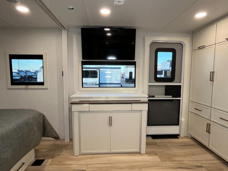 This is the perfect travel trailer for the couple looking for comfort at the campground! Once you've unloaded the pass-thru storage, you can put out the 17' patio awning and relax in your camp chairs. Head inside to make lunch in the fully-equipped kitchen that incudes a range, 30" convection microwave, and dishwasher prep. There is a pantry with outlets within the large slide out, along with a 10 cu. ft. refrigerator that you can access with the slide in, plus theater seating across from the TV. And if you need sleeping space for guests, just choose the optional tri-fold sofa in place of the theater seating! A pull-out table with a drawer provides a place to dine together, and the entryway closet will be perfect to keep jackets and shoes tidy. You'll get a great night's rest on the front queen bed with four drawers, nightstand cubbies, and a room divider for a little more privacy.