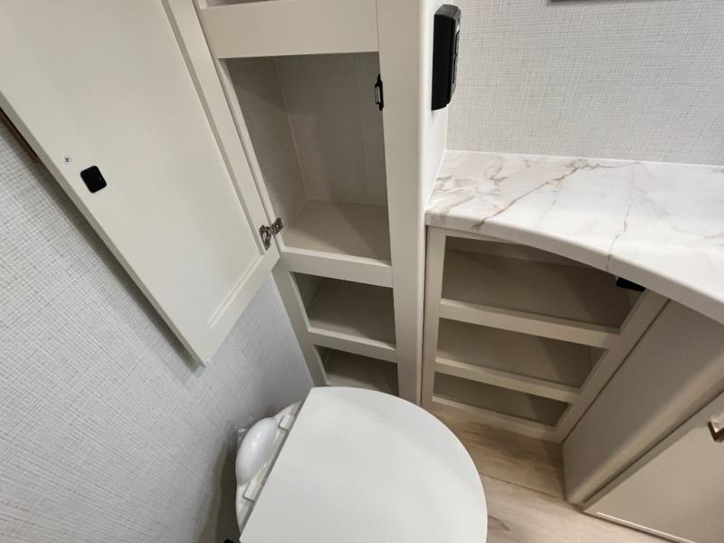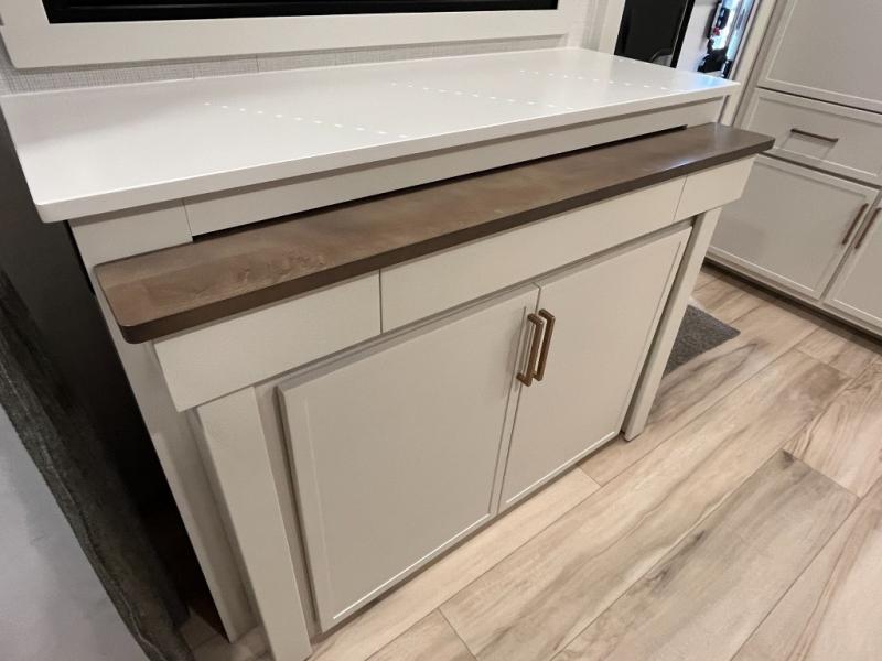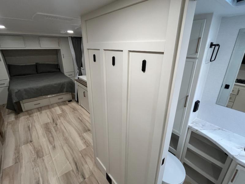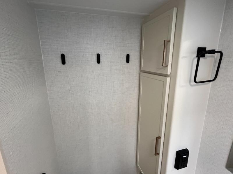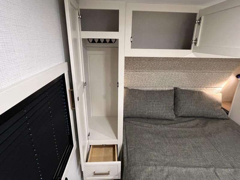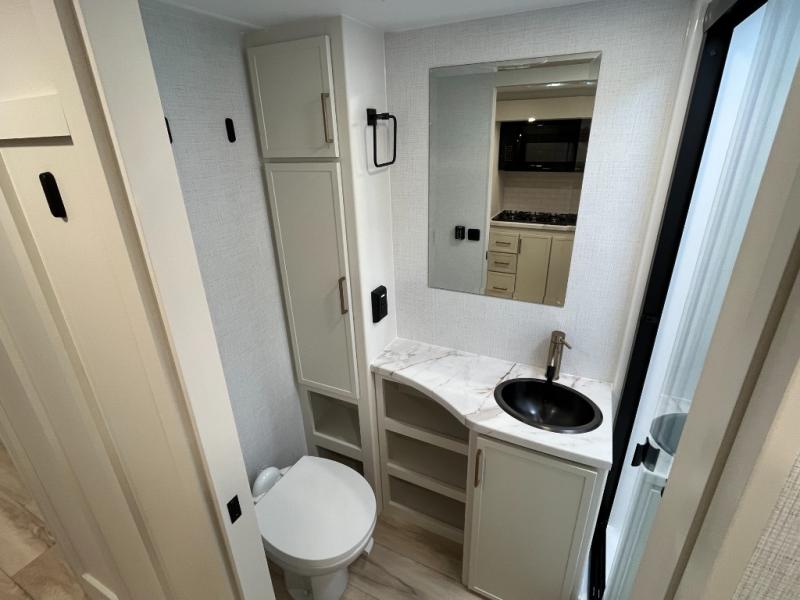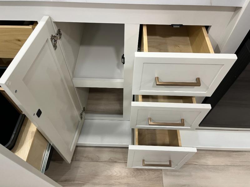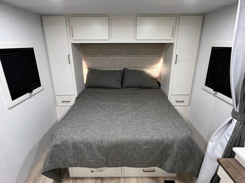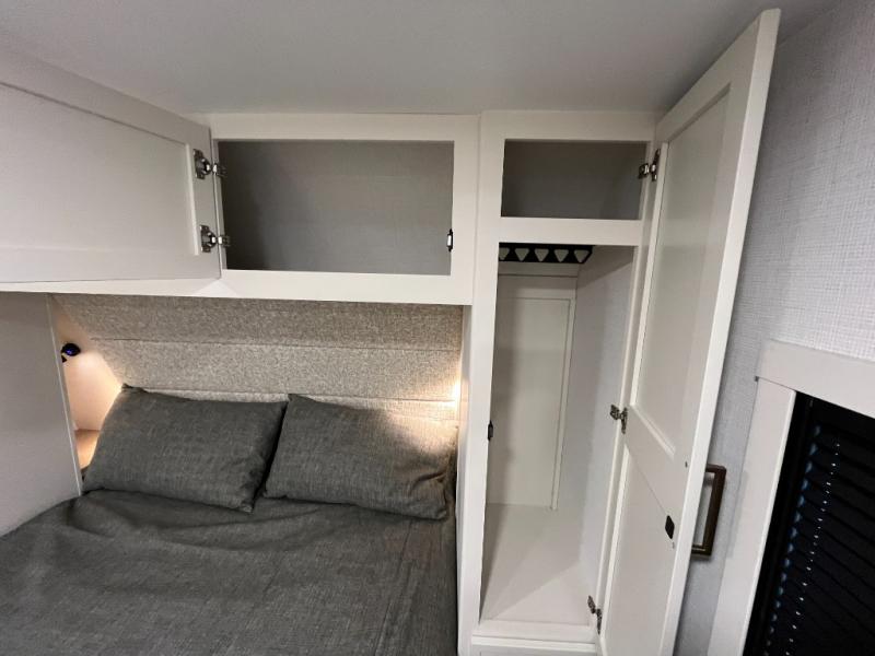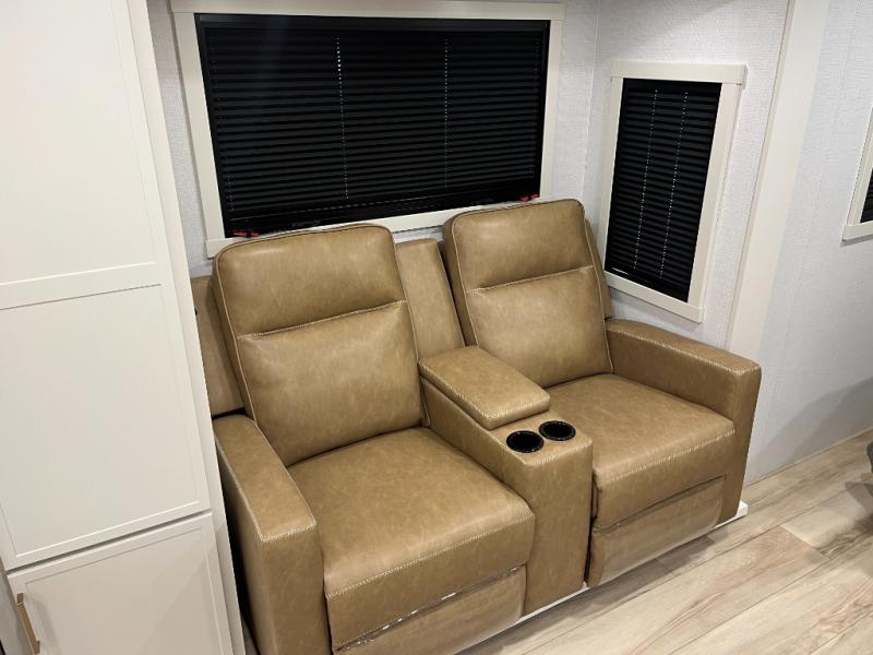 This is the perfect travel trailer for the couple looking for comfort at the campground! Once you've unloaded the pass-thru storage, you can put out the 17' patio awning and relax in your camp chairs. Head inside to make lunch in the fully-equipped kitchen that incudes a range, 30" convection microwave, and dishwasher prep. There is a pantry with outlets within the large slide out, along with a 10 cu. ft. refrigerator that you can access with the slide in, plus theater seating across from the TV. And if you need sleeping space for guests, just choose the optional tri-fold sofa in place of the theater seating! A pull-out table with a drawer provides a place to dine together, and the entryway closet will be perfect to keep jackets and shoes tidy. You'll get a great night's rest on the front queen bed with four drawers, nightstand cubbies, and a room divider for a little more privacy.