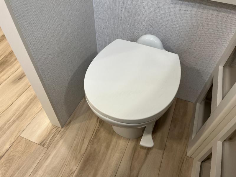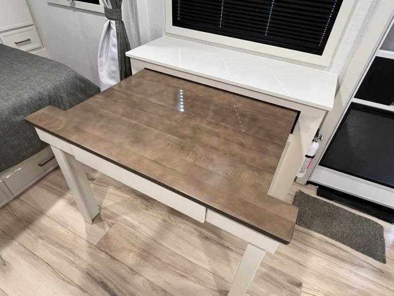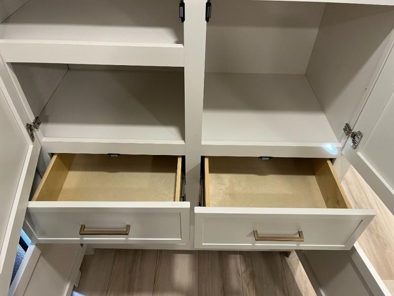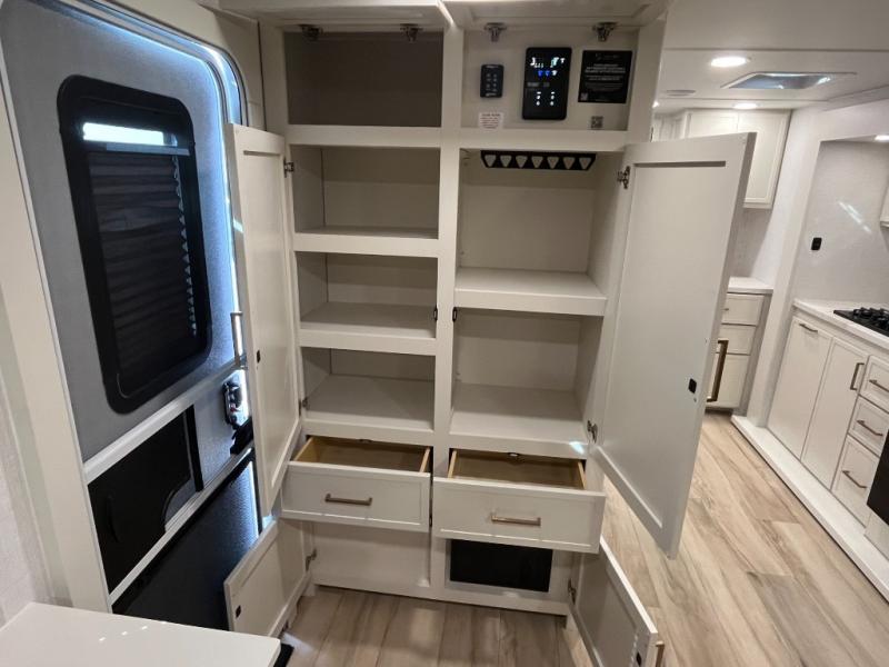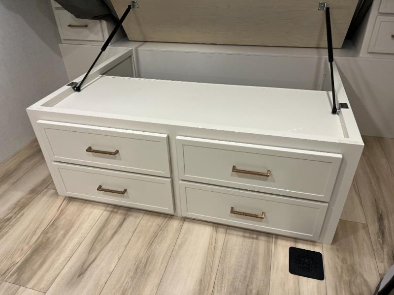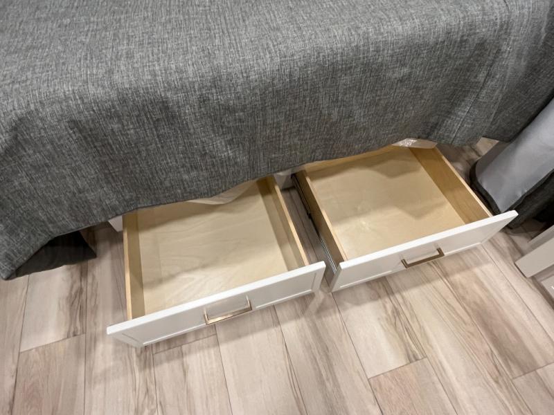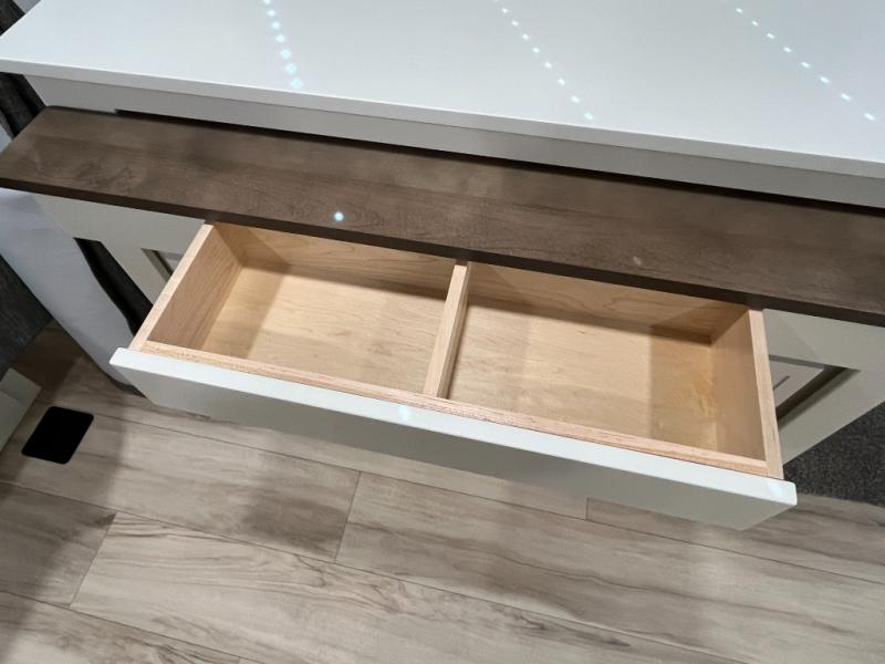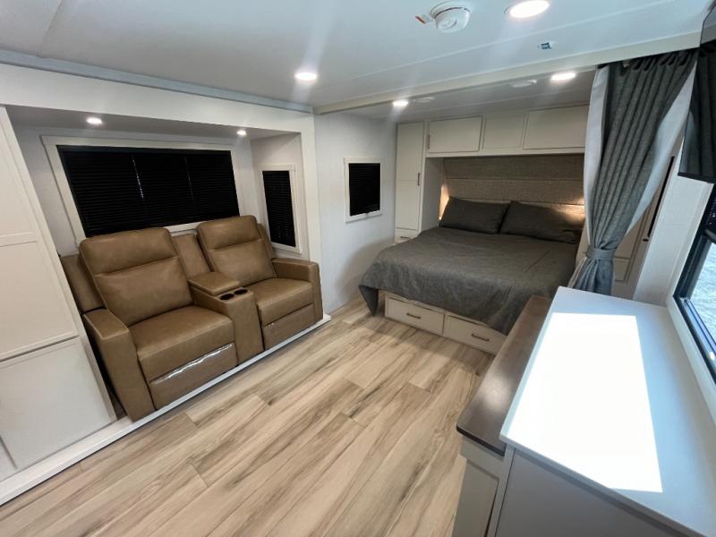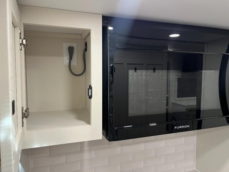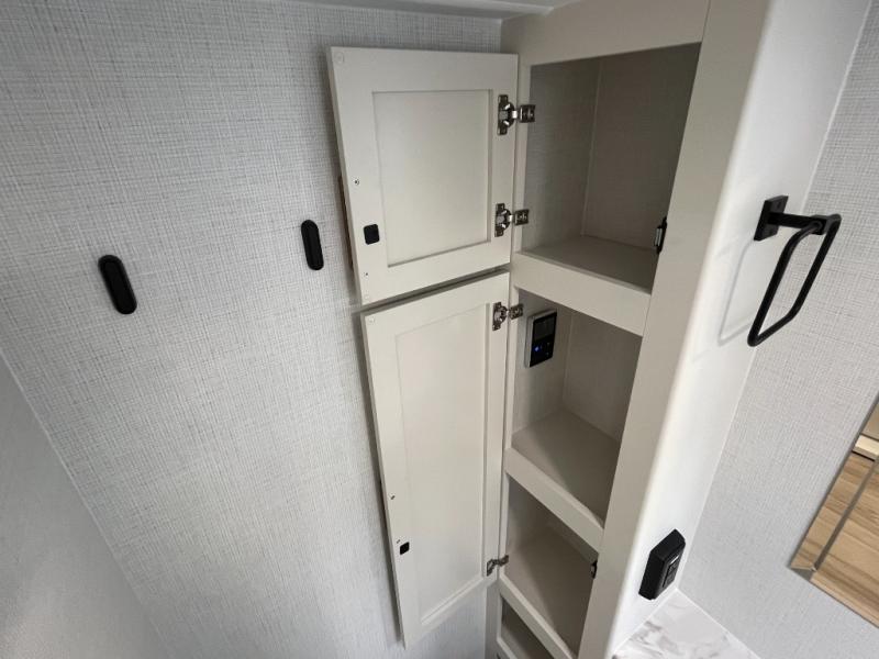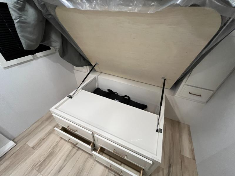 This is the perfect travel trailer for the couple looking for comfort at the campground! Once you've unloaded the pass-thru storage, you can put out the 17' patio awning and relax in your camp chairs. Head inside to make lunch in the fully-equipped kitchen that incudes a range, 30" convection microwave, and dishwasher prep. There is a pantry with outlets within the large slide out, along with a 10 cu. ft. refrigerator that you can access with the slide in, plus theater seating across from the TV. And if you need sleeping space for guests, just choose the optional tri-fold sofa in place of the theater seating! A pull-out table with a drawer provides a place to dine together, and the entryway closet will be perfect to keep jackets and shoes tidy. You'll get a great night's rest on the front queen bed with four drawers, nightstand cubbies, and a room divider for a little more privacy.