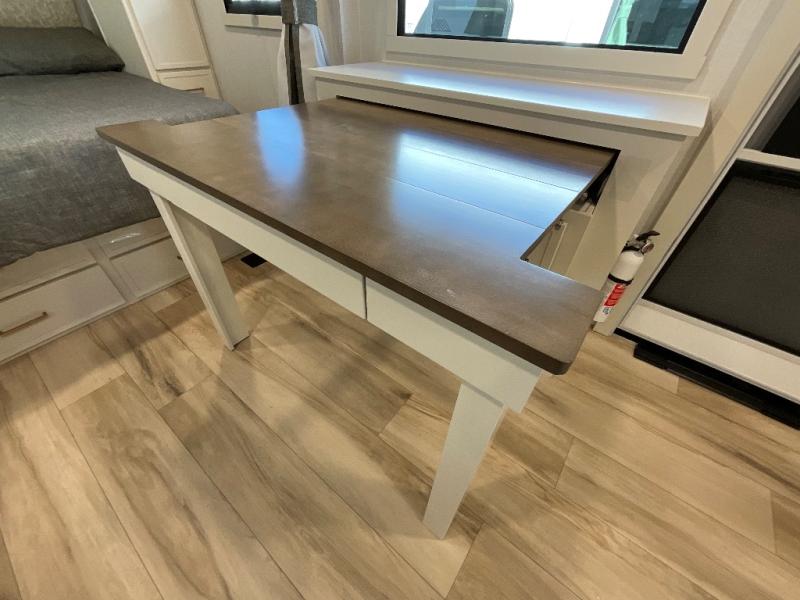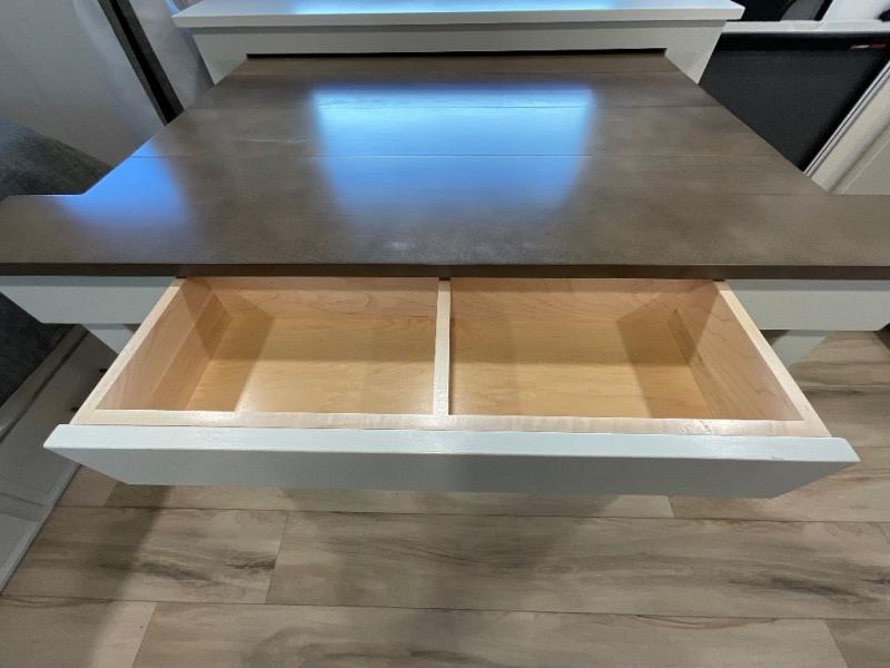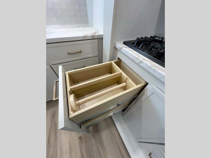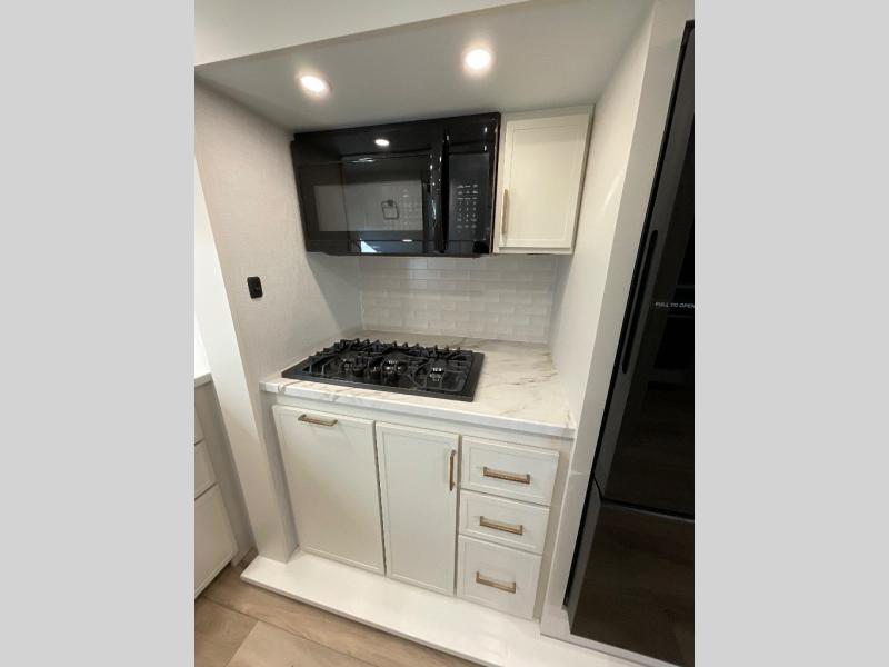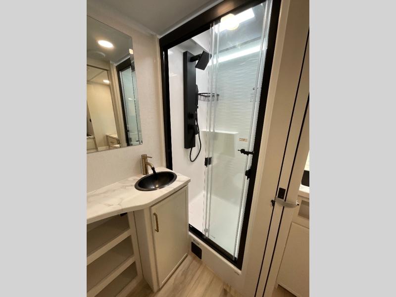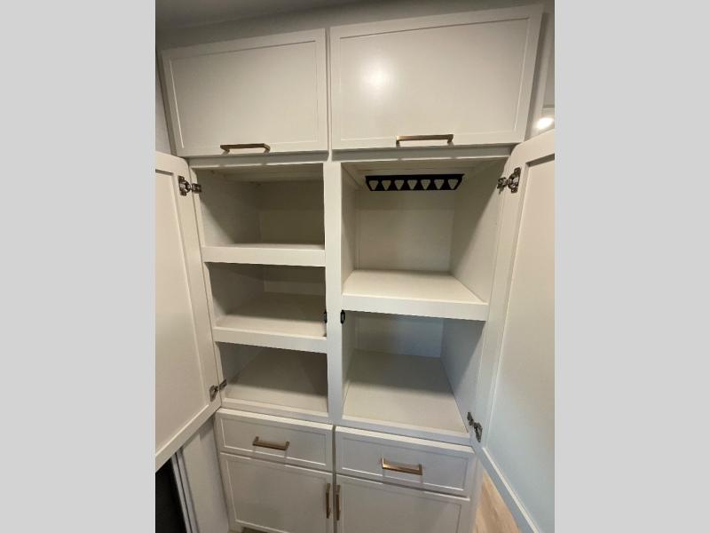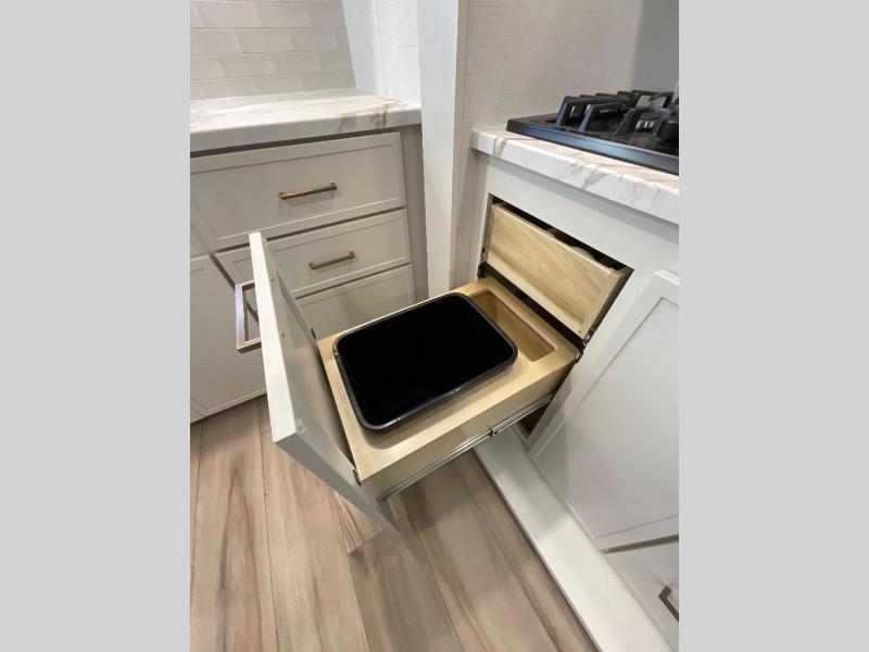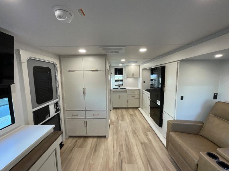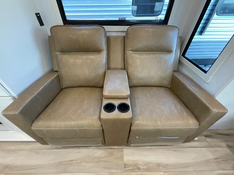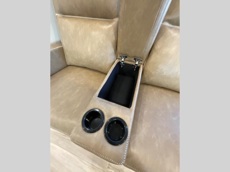 This is the perfect travel trailer for the couple looking for comfort at the campground! Once you've unloaded the pass-thru storage, you can put out the 17' patio awning and relax in your camp chairs. Head inside to make lunch in the fully-equipped kitchen that incudes a range, 30" convection microwave, and dishwasher prep. There is a pantry with outlets within the large slide out, along with a 10 cu. ft. refrigerator that you can access with the slide in, plus theater seating across from the TV. And if you need sleeping space for guests, just choose the optional tri-fold sofa in place of the theater seating! A pull-out table with a drawer provides a place to dine together, and the entryway closet will be perfect to keep jackets and shoes tidy. You'll get a great night's rest on the front queen bed with four drawers, nightstand cubbies, and a room divider for a little more privacy.