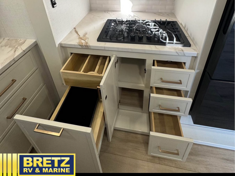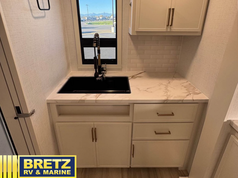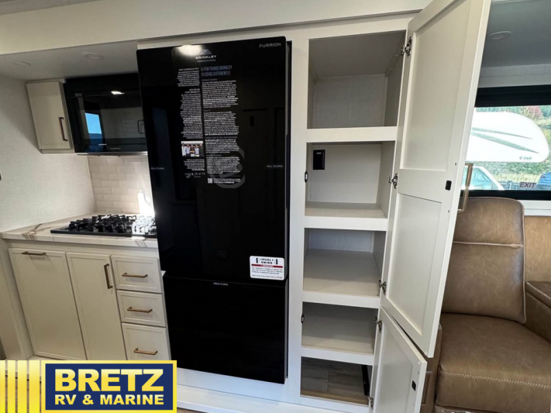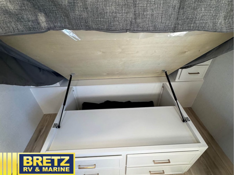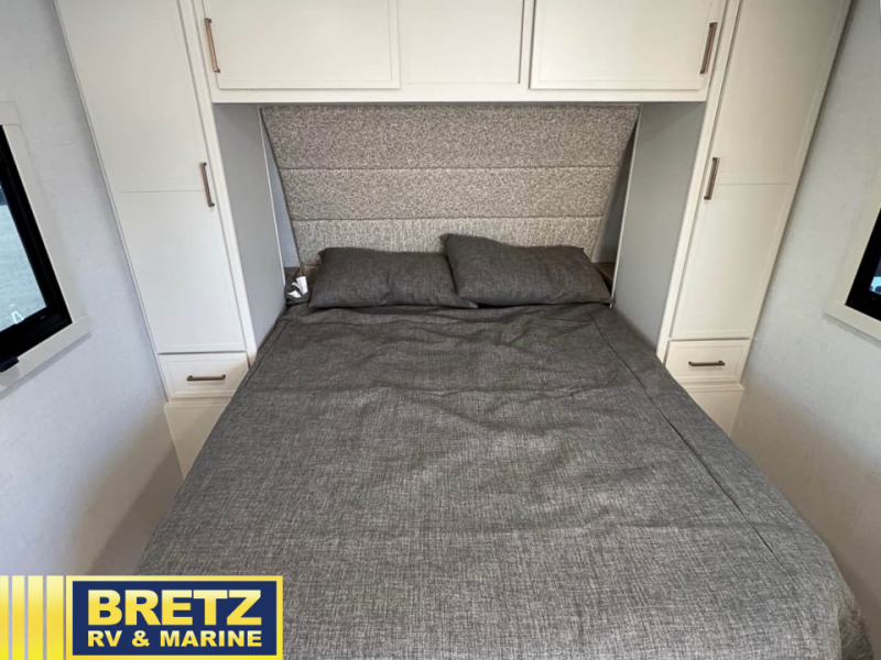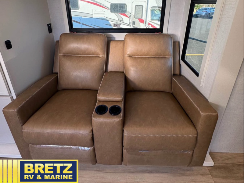 This is the perfect travel trailer for the couple looking for comfort at the campground! Once you've unloaded the pass-thru storage, you can put out the 17' patio awning and relax in your camp chairs. Head inside to make lunch in the fully-equipped kitchen that incudes a range, 30" convection microwave, and dishwasher prep. There is a pantry with outlets within the large slide out, along with a 10 cu. ft. refrigerator that you can access with the slide in, plus theater seating across from the TV. And if you need sleeping space for guests, just choose the optional tri-fold sofa in place of the theater seating! A pull-out table with a drawer provides a place to dine together, and the entryway closet will be perfect to keep jackets and shoes tidy. You'll get a great night's rest on the front queen bed with four drawers, nightstand cubbies, and a room divider for a little more privacy.