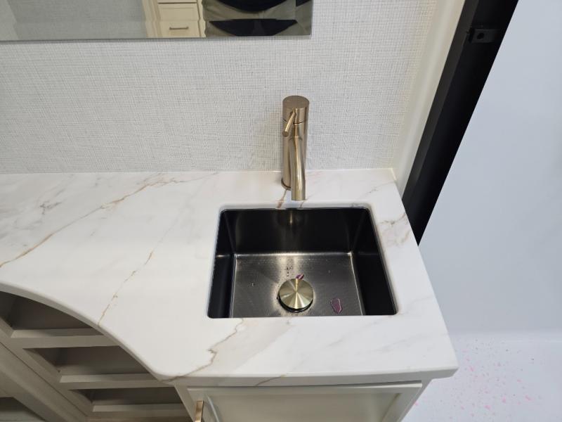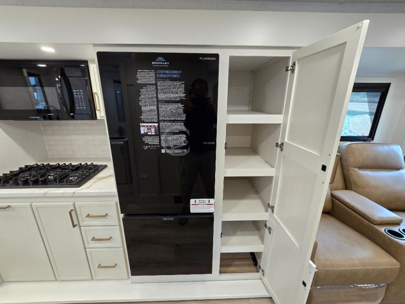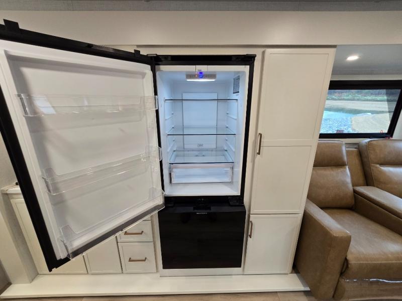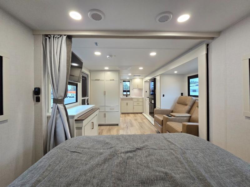 This is the perfect travel trailer for the couple looking for comfort at the campground! Once you've unloaded the pass-thru storage, you can put out the 17' patio awning and relax in your camp chairs. Head inside to make lunch in the fully-equipped kitchen that incudes a range, 30" convection microwave, and dishwasher prep. There is a pantry with outlets within the large slide out, along with a 10 cu. ft. refrigerator that you can access with the slide in, plus theater seating across from the TV. And if you need sleeping space for guests, just choose the optional tri-fold sofa in place of the theater seating! A pull-out table with a drawer provides a place to dine together, and the entryway closet will be perfect to keep jackets and shoes tidy. You'll get a great night's rest on the front queen bed with four drawers, nightstand cubbies, and a room divider for a little more privacy.