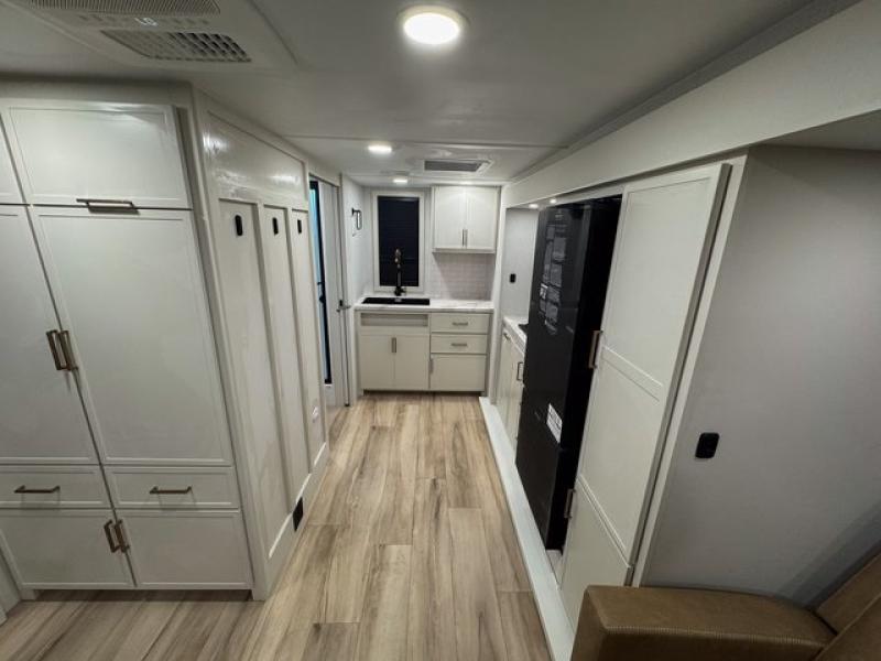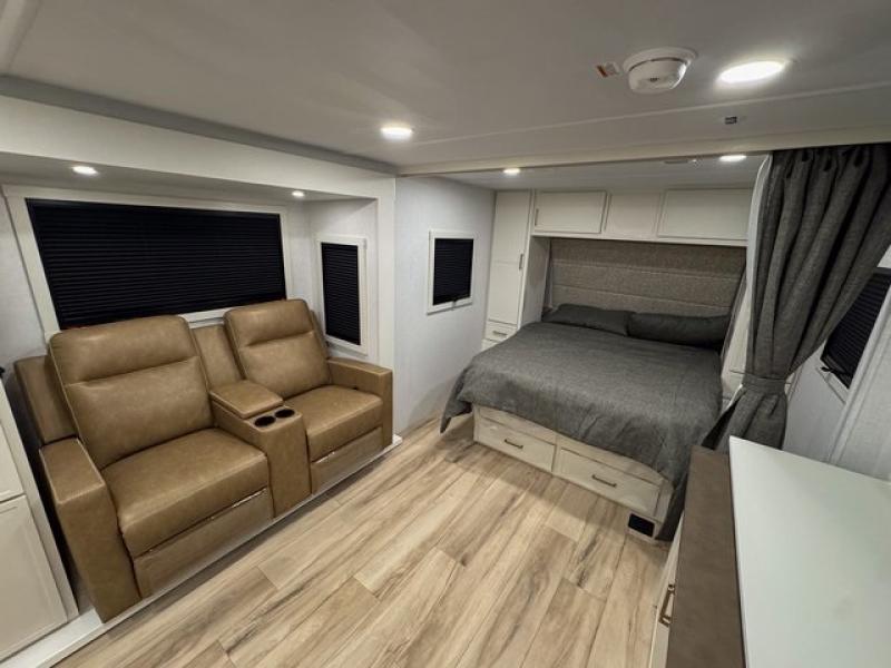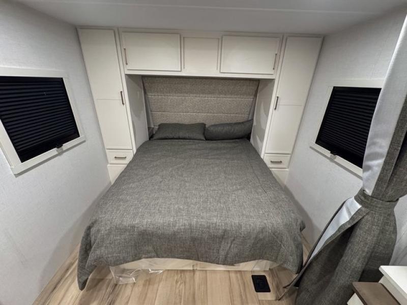 This is the perfect travel trailer for the couple looking for comfort at the campground! Once you've unloaded the pass-thru storage, you can put out the 17' patio awning and relax in your camp chairs. Head inside to make lunch in the fully-equipped kitchen that incudes a range, 30" convection microwave, and dishwasher prep. There is a pantry with outlets within the large slide out, along with a 10 cu. ft. refrigerator that you can access with the slide in, plus theater seating across from the TV. And if you need sleeping space for guests, just choose the optional tri-fold sofa in place of the theater seating! A pull-out table with a drawer provides a place to dine together, and the entryway closet will be perfect to keep jackets and shoes tidy. You'll get a great night's rest on the front queen bed with four drawers, nightstand cubbies, and a room divider for a little more privacy.