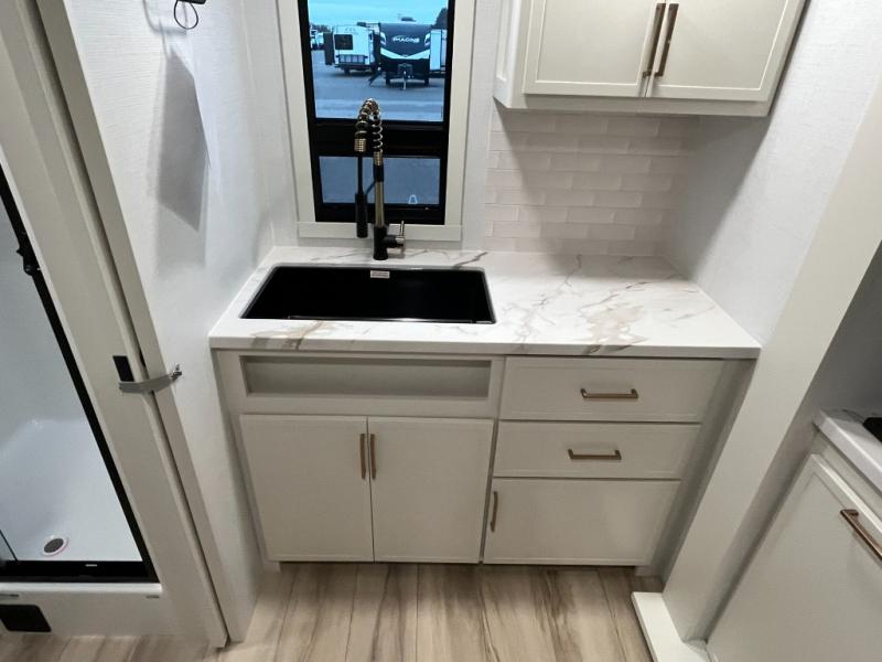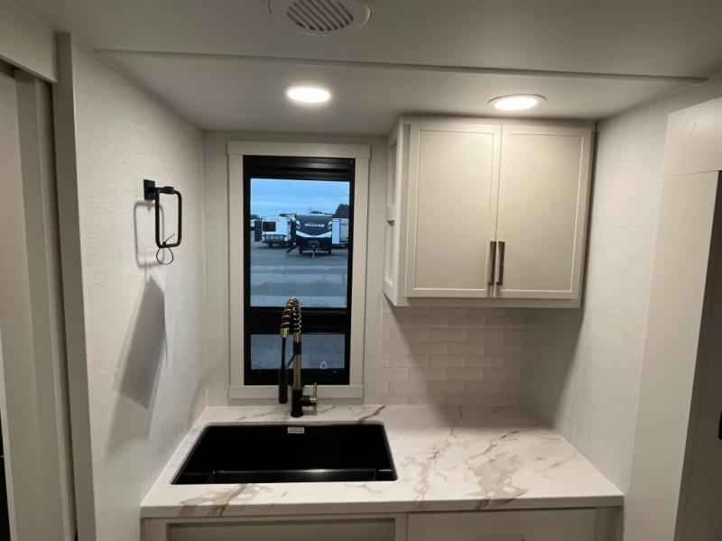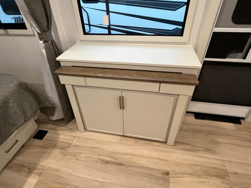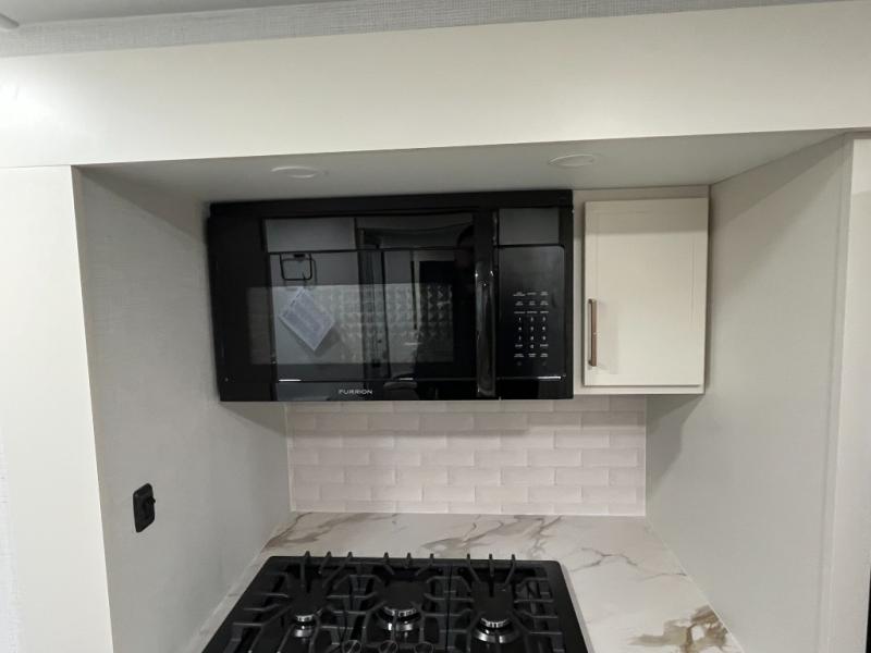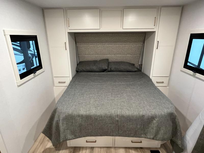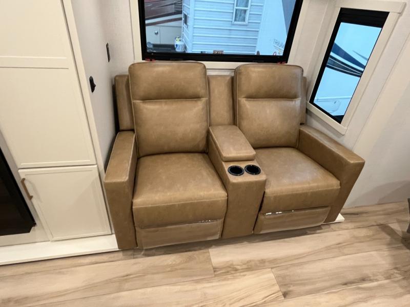 This is the perfect travel trailer for the couple looking for comfort at the campground! Once you've unloaded the pass-thru storage, you can put out the 17' patio awning and relax in your camp chairs. Head inside to make lunch in the fully-equipped kitchen that incudes a range, 30" convection microwave, and dishwasher prep. There is a pantry with outlets within the large slide out, along with a 10 cu. ft. refrigerator that you can access with the slide in, plus theater seating across from the TV. And if you need sleeping space for guests, just choose the optional tri-fold sofa in place of the theater seating! A pull-out table with a drawer provides a place to dine together, and the entryway closet will be perfect to keep jackets and shoes tidy. You'll get a great night's rest on the front queen bed with four drawers, nightstand cubbies, and a room divider for a little more privacy.