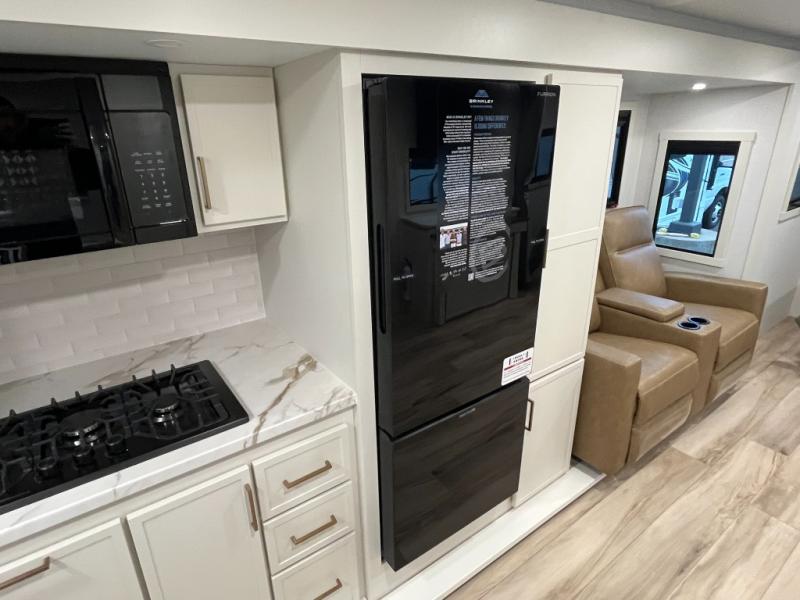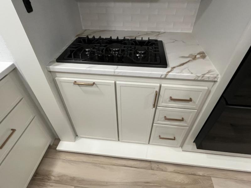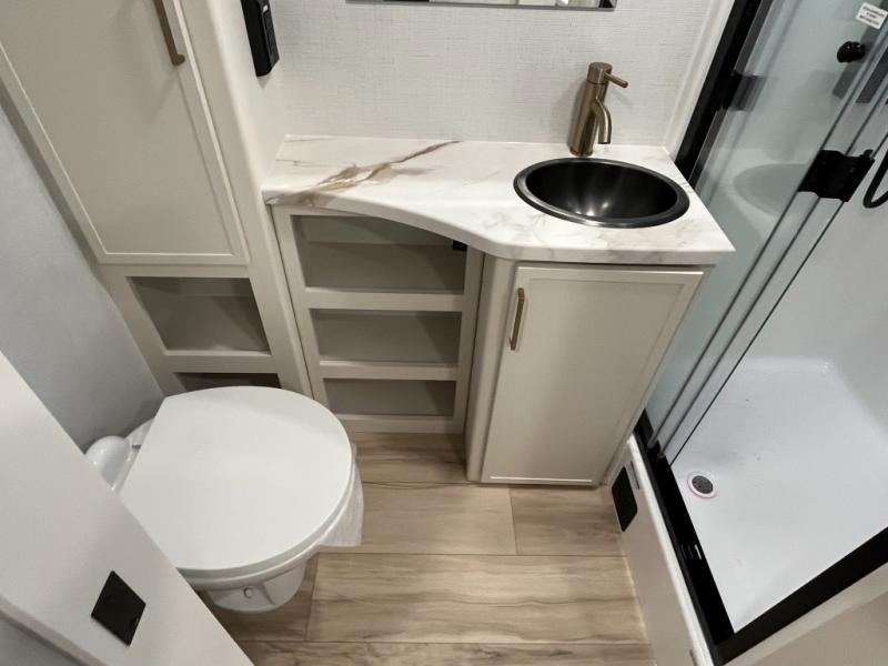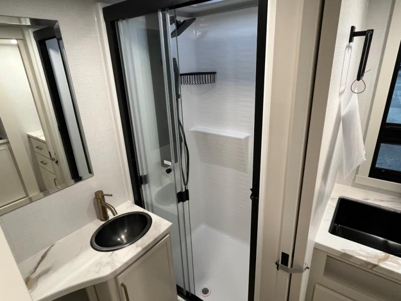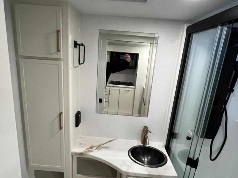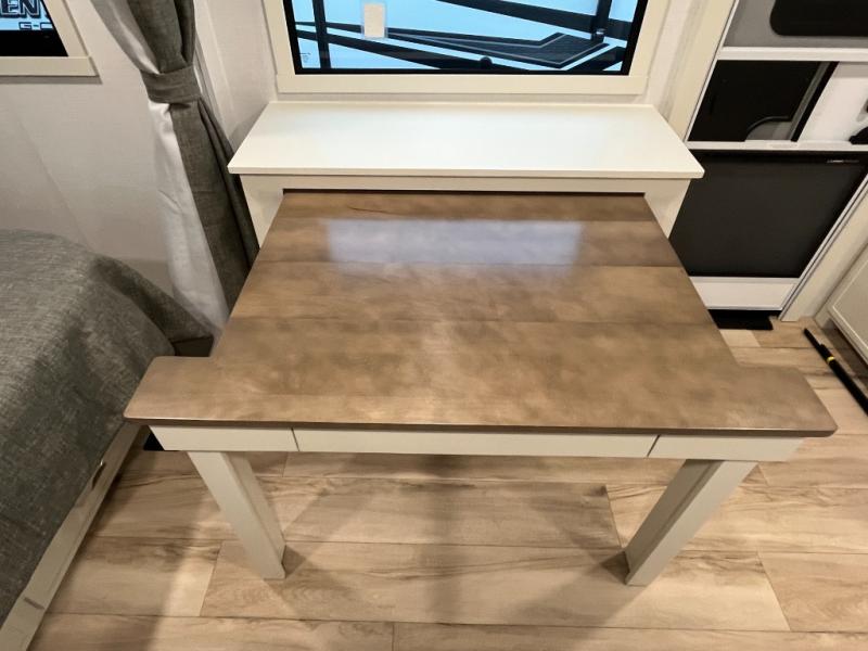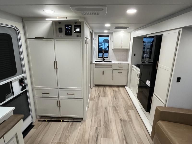 This is the perfect travel trailer for the couple looking for comfort at the campground! Once you've unloaded the pass-thru storage, you can put out the 17' patio awning and relax in your camp chairs. Head inside to make lunch in the fully-equipped kitchen that incudes a range, 30" convection microwave, and dishwasher prep. There is a pantry with outlets within the large slide out, along with a 10 cu. ft. refrigerator that you can access with the slide in, plus theater seating across from the TV. And if you need sleeping space for guests, just choose the optional tri-fold sofa in place of the theater seating! A pull-out table with a drawer provides a place to dine together, and the entryway closet will be perfect to keep jackets and shoes tidy. You'll get a great night's rest on the front queen bed with four drawers, nightstand cubbies, and a room divider for a little more privacy.