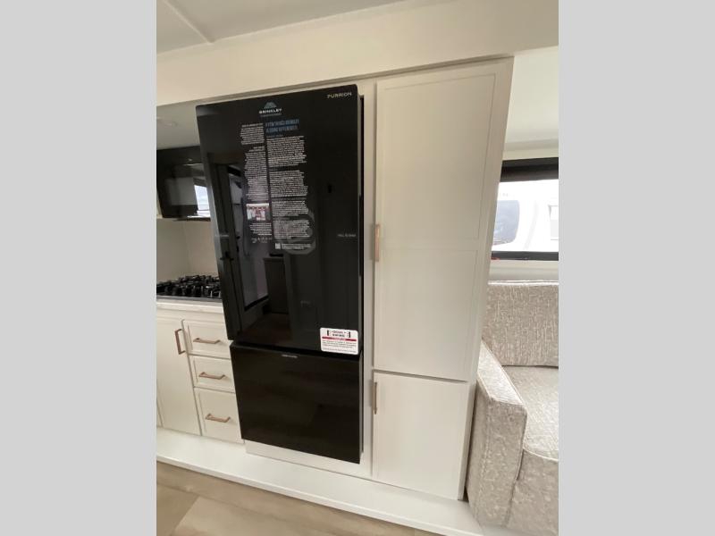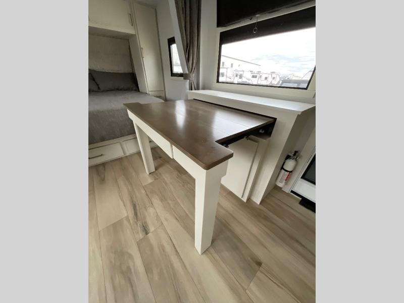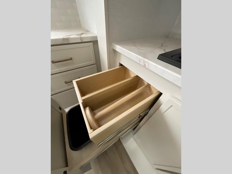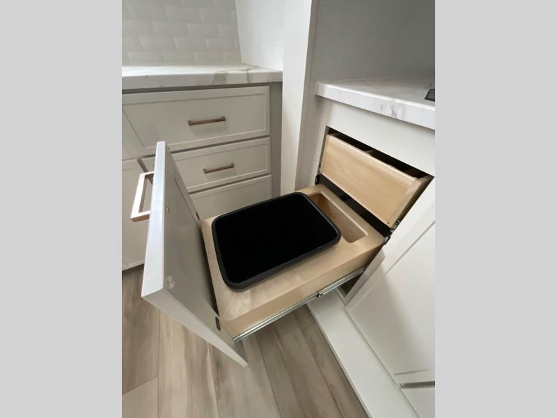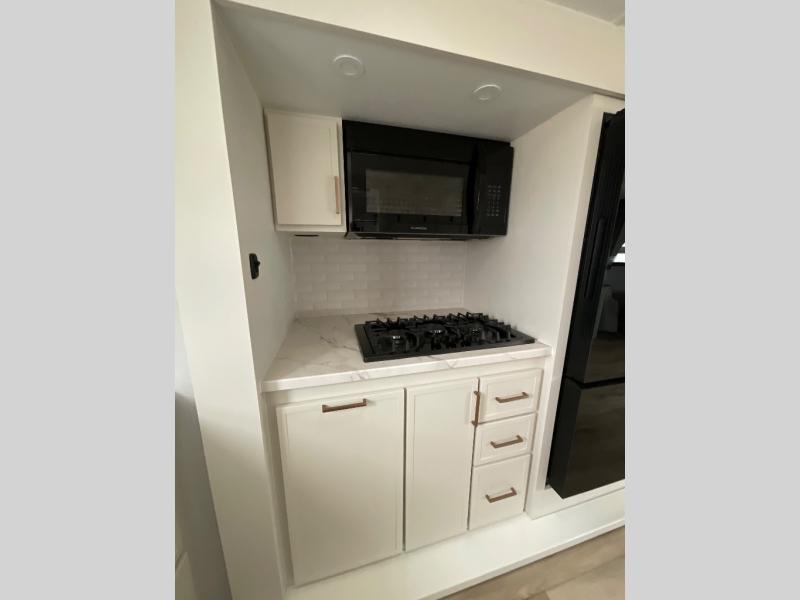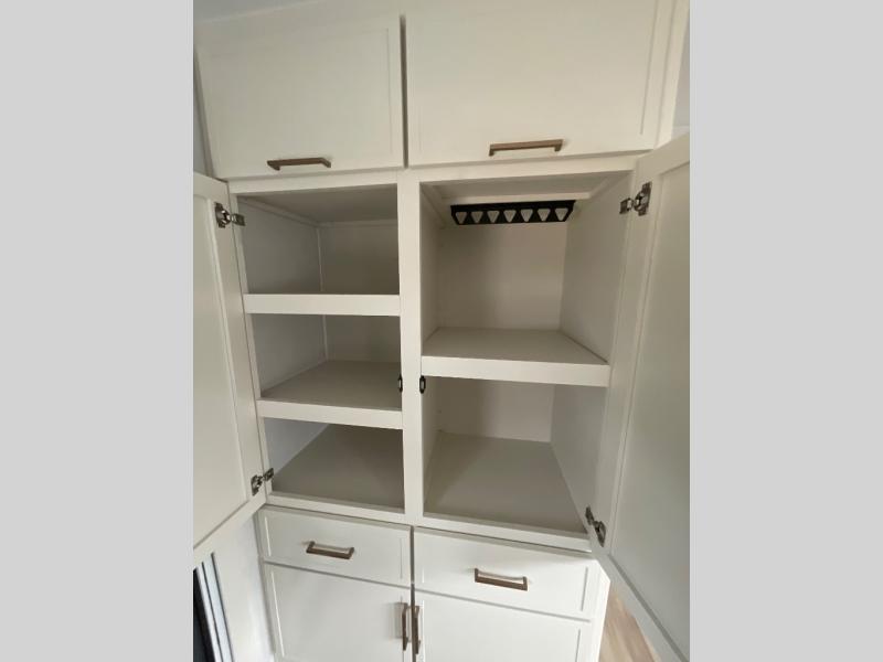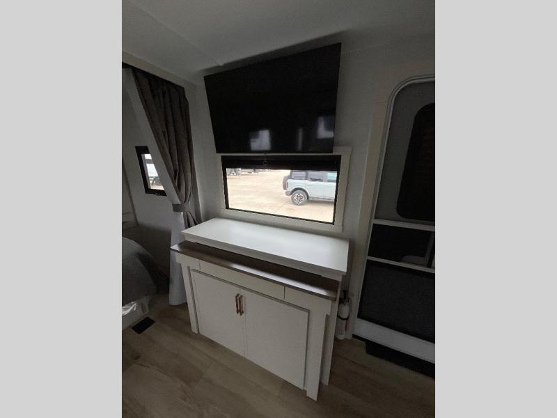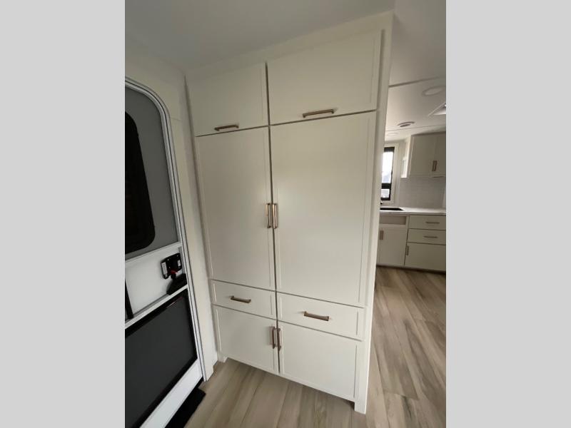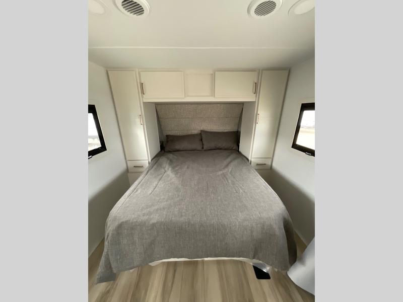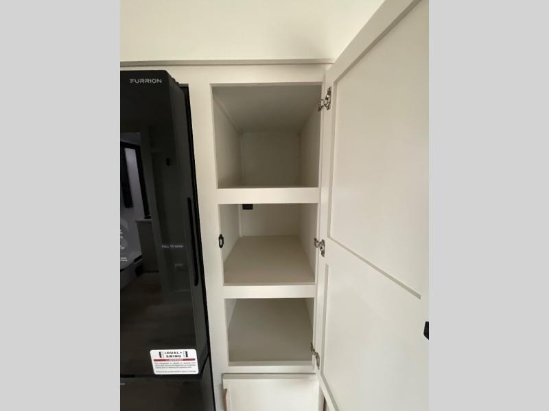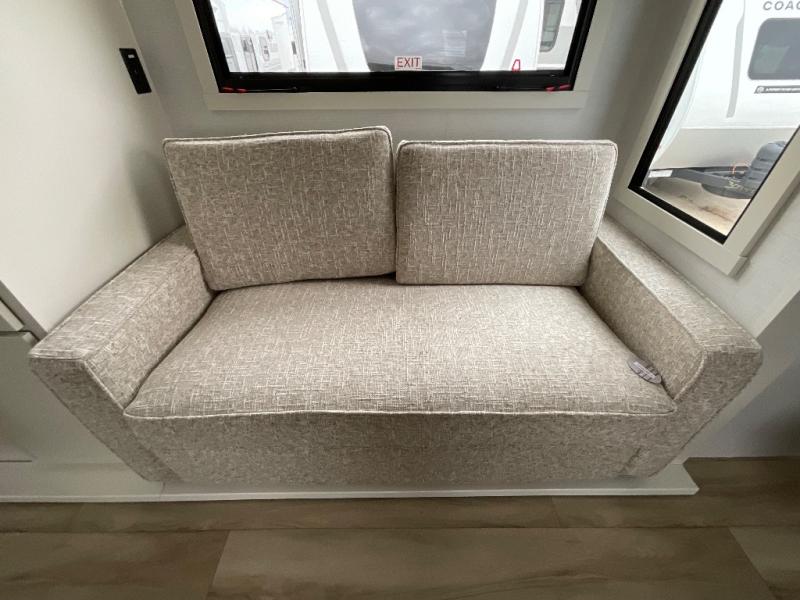 This is the perfect travel trailer for the couple looking for comfort at the campground! Once you've unloaded the pass-thru storage, you can put out the 17' patio awning and relax in your camp chairs. Head inside to make lunch in the fully-equipped kitchen that incudes a range, 30" convection microwave, and dishwasher prep. There is a pantry with outlets within the large slide out, along with a 10 cu. ft. refrigerator that you can access with the slide in, plus theater seating across from the TV. And if you need sleeping space for guests, just choose the optional tri-fold sofa in place of the theater seating! A pull-out table with a drawer provides a place to dine together, and the entryway closet will be perfect to keep jackets and shoes tidy. You'll get a great night's rest on the front queen bed with four drawers, nightstand cubbies, and a room divider for a little more privacy.
