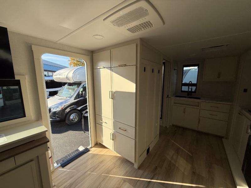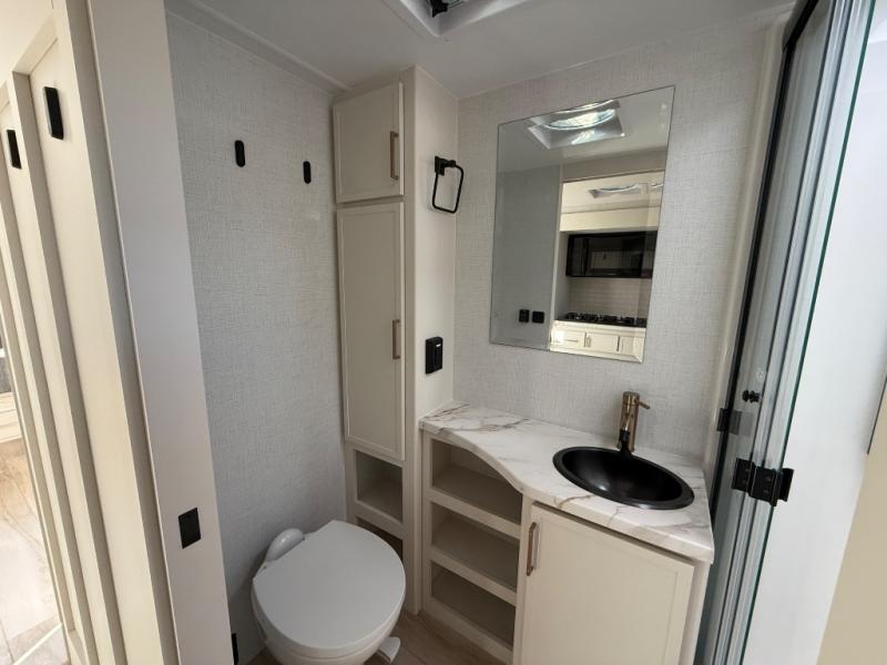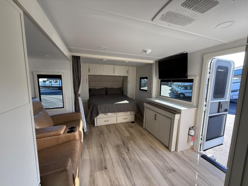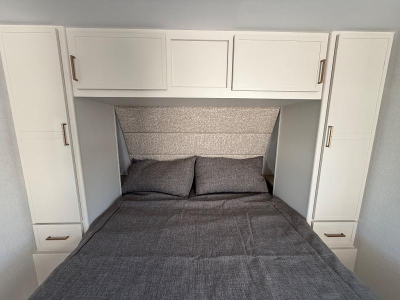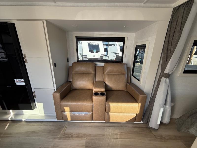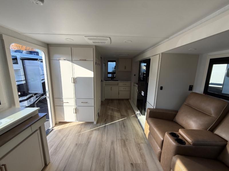 This is the perfect travel trailer for the couple looking for comfort at the campground! Once you've unloaded the pass-thru storage, you can put out the 17' patio awning and relax in your camp chairs. Head inside to make lunch in the fully-equipped kitchen that incudes a range, 30" convection microwave, and dishwasher prep. There is a pantry with outlets within the large slide out, along with a 10 cu. ft. refrigerator that you can access with the slide in, plus theater seating across from the TV. And if you need sleeping space for guests, just choose the optional tri-fold sofa in place of the theater seating! A pull-out table with a drawer provides a place to dine together, and the entryway closet will be perfect to keep jackets and shoes tidy. You'll get a great night's rest on the front queen bed with four drawers, nightstand cubbies, and a room divider for a little more privacy.