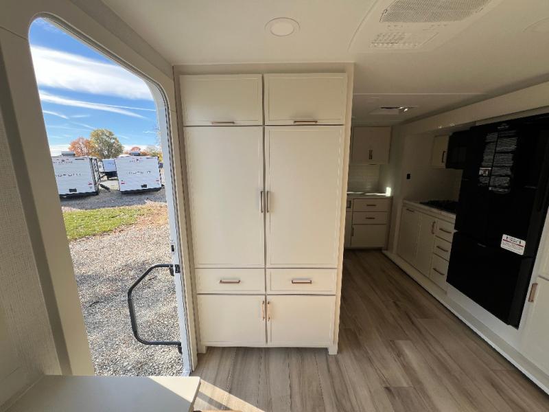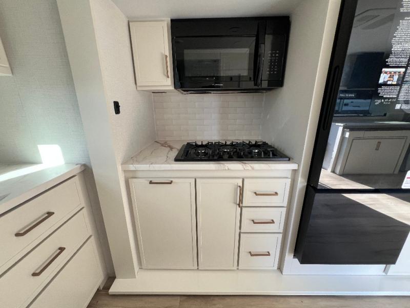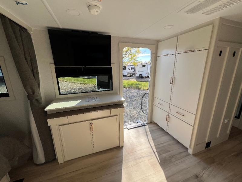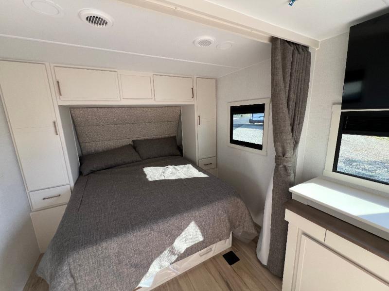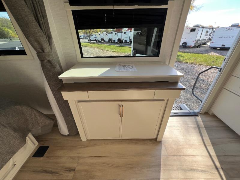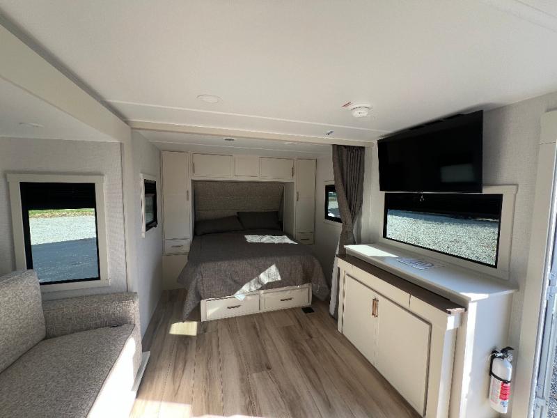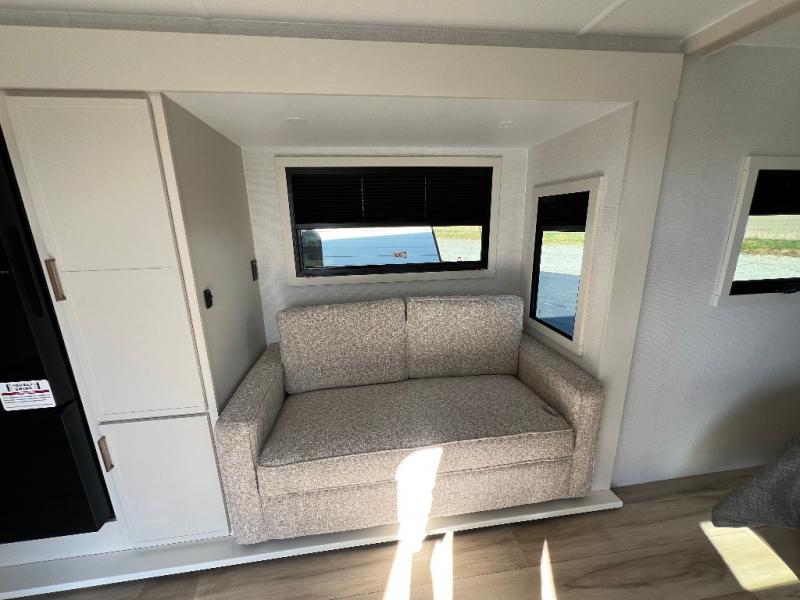This is the perfect travel trailer for the couple looking for comfort at the campground! Once you've unloaded the pass-thru storage, you can put out the 17' patio awning and relax in your camp chairs. Head inside to make lunch in the fully-equipped kitchen that incudes a range, 30" convection microwave, and dishwasher prep. There is a pantry with outlets within the large slide out, along with a 10 cu. ft. refrigerator that you can access with the slide in, plus theater seating across from the TV. And if you need sleeping space for guests, just choose the optional tri-fold sofa in place of the theater seating! A pull-out table with a drawer provides a place to dine together, and the entryway closet will be perfect to keep jackets and shoes tidy. You'll get a great night's rest on the front queen bed with four drawers, nightstand cubbies, and a room divider for a little more privacy.