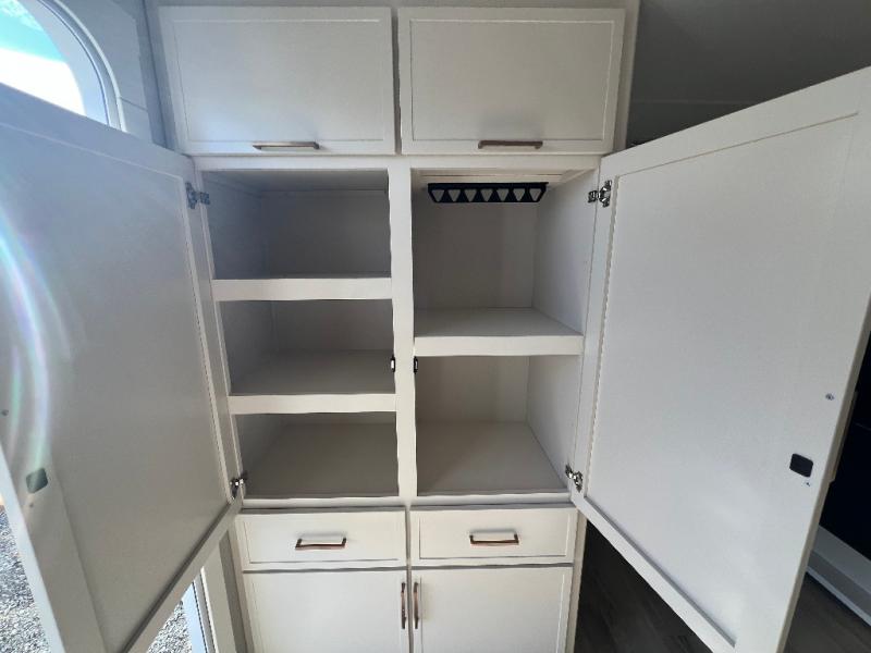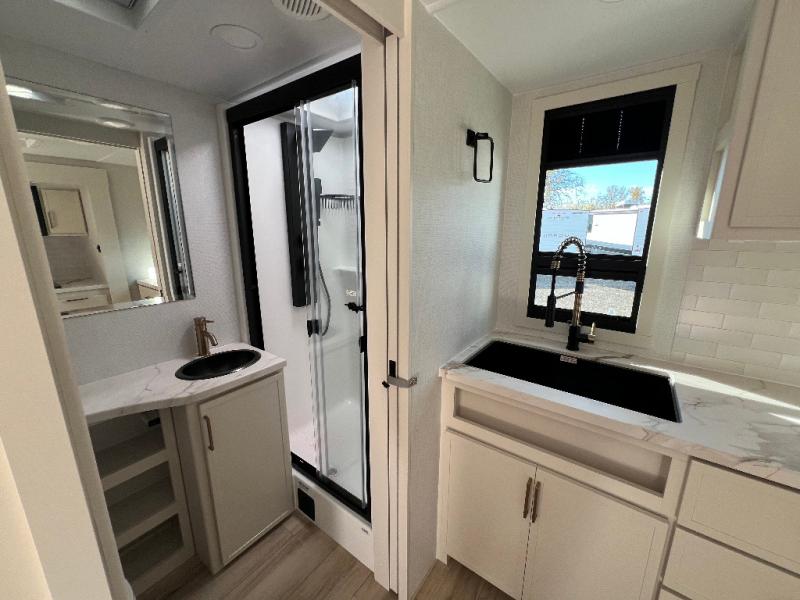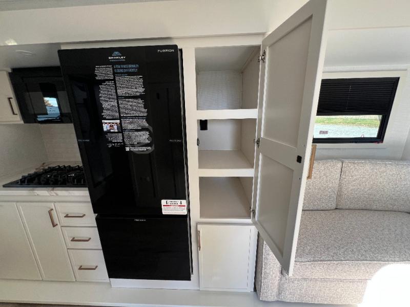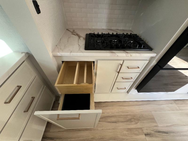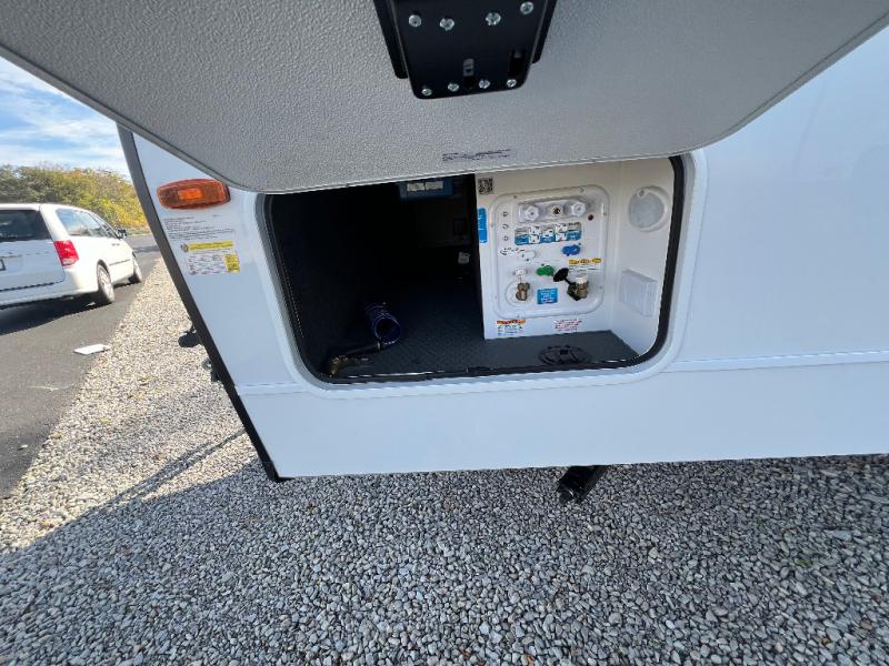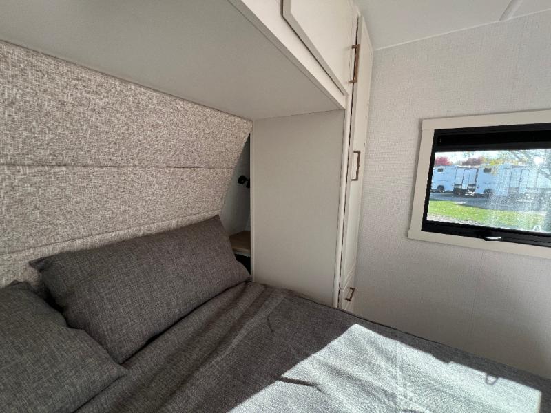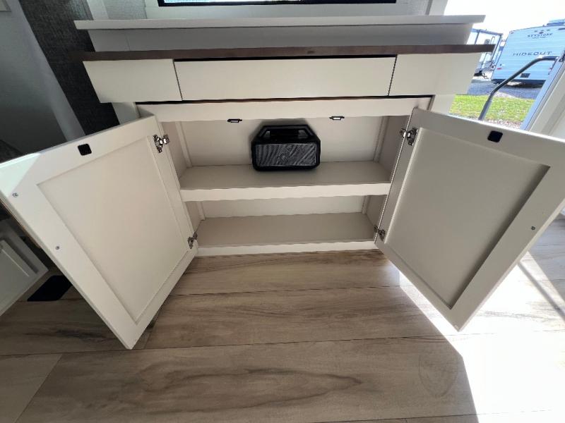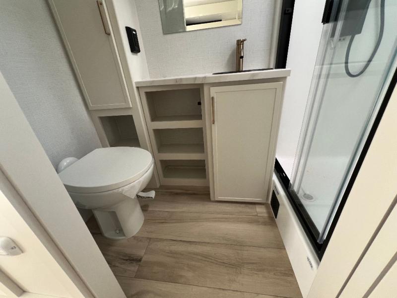 This is the perfect travel trailer for the couple looking for comfort at the campground! Once you've unloaded the pass-thru storage, you can put out the 17' patio awning and relax in your camp chairs. Head inside to make lunch in the fully-equipped kitchen that incudes a range, 30" convection microwave, and dishwasher prep. There is a pantry with outlets within the large slide out, along with a 10 cu. ft. refrigerator that you can access with the slide in, plus theater seating across from the TV. And if you need sleeping space for guests, just choose the optional tri-fold sofa in place of the theater seating! A pull-out table with a drawer provides a place to dine together, and the entryway closet will be perfect to keep jackets and shoes tidy. You'll get a great night's rest on the front queen bed with four drawers, nightstand cubbies, and a room divider for a little more privacy.