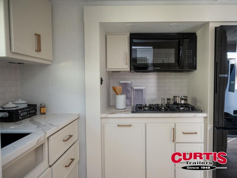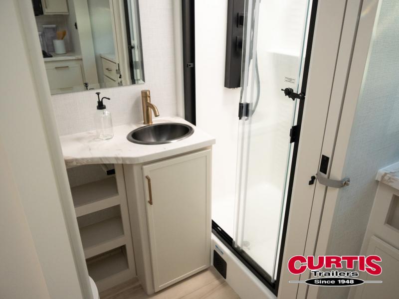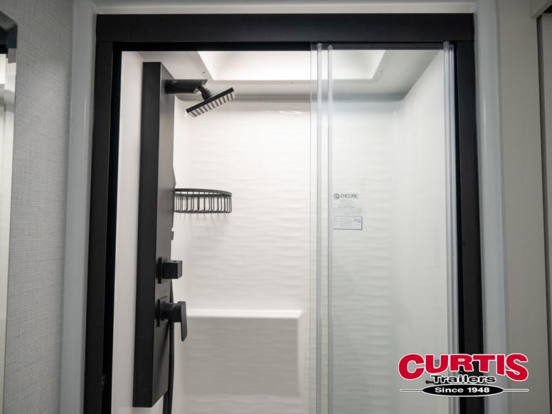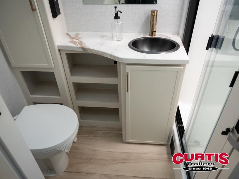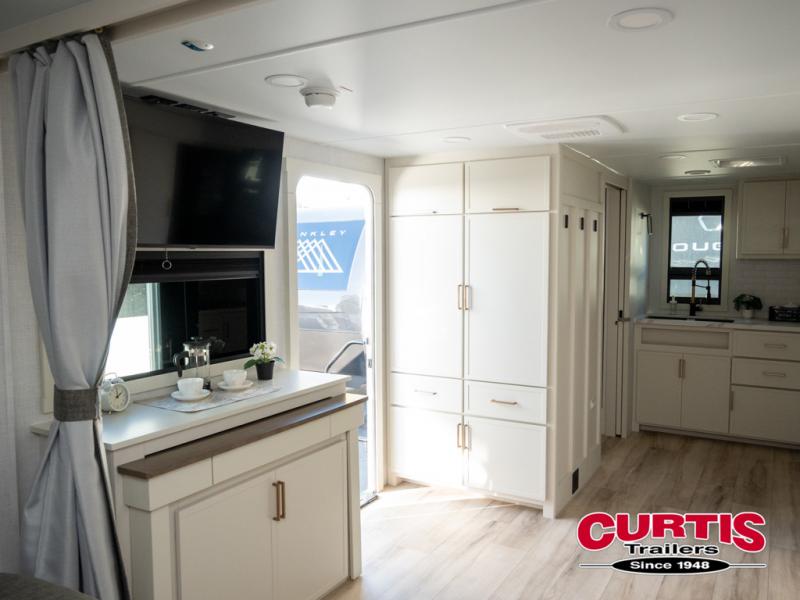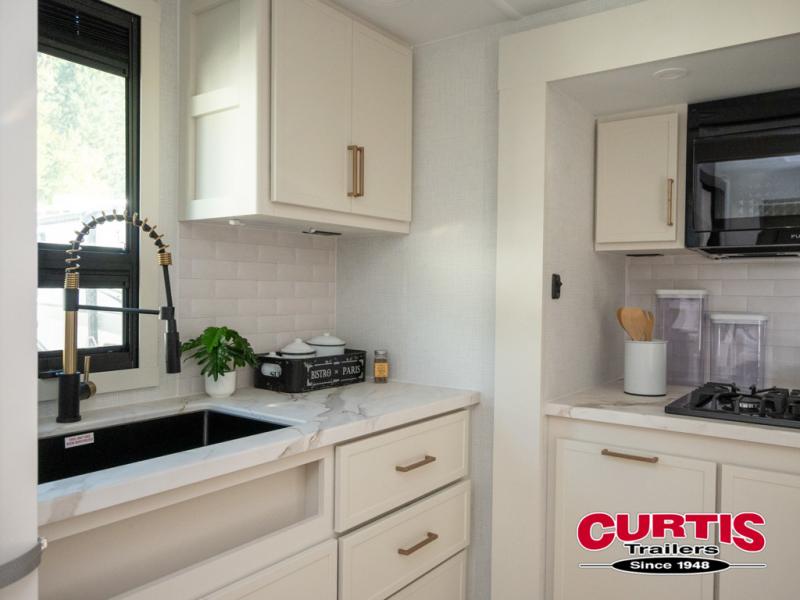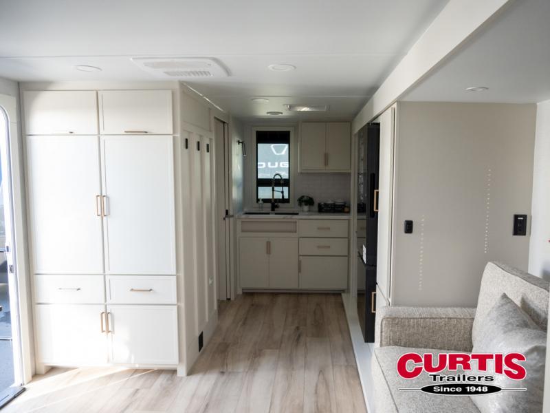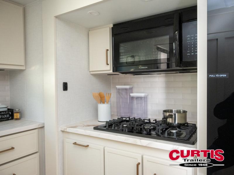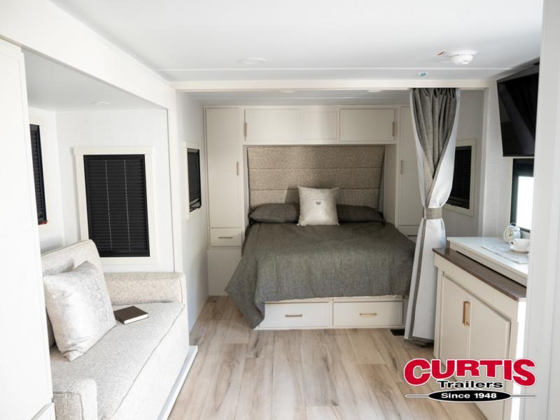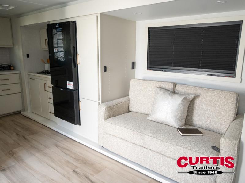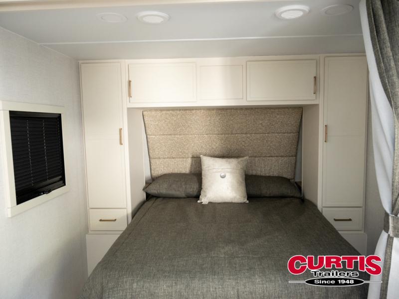 This is the perfect travel trailer for the couple looking for comfort at the campground! Once you've unloaded the pass-thru storage, you can put out the 17' patio awning and relax in your camp chairs. Head inside to make lunch in the fully-equipped kitchen that incudes a range, 30" convection microwave, and dishwasher prep. There is a pantry with outlets within the large slide out, along with a 10 cu. ft. refrigerator that you can access with the slide in, plus theater seating across from the TV. And if you need sleeping space for guests, just choose the optional tri-fold sofa in place of the theater seating! A pull-out table with a drawer provides a place to dine together, and the entryway closet will be perfect to keep jackets and shoes tidy. You'll get a great night's rest on the front queen bed with four drawers, nightstand cubbies, and a room divider for a little more privacy.