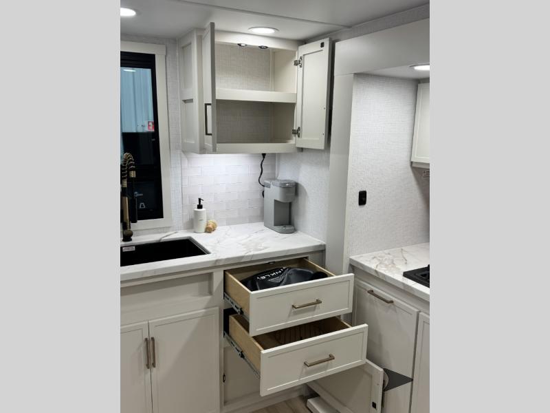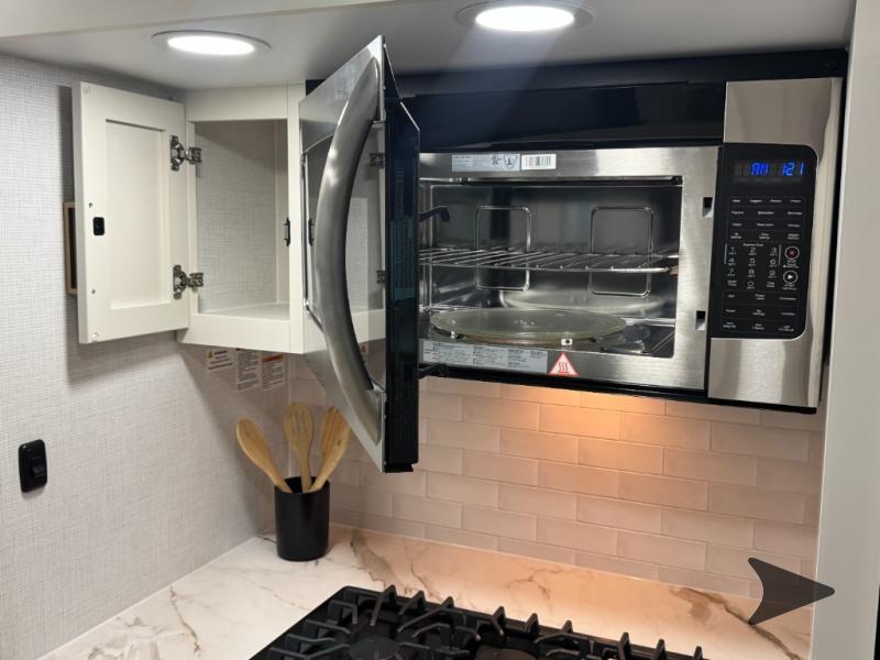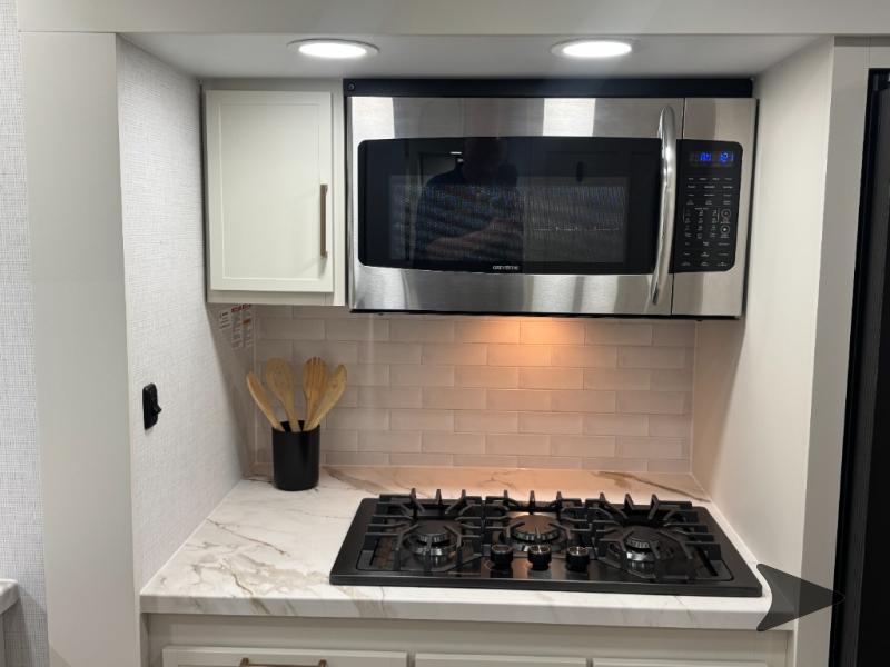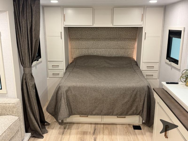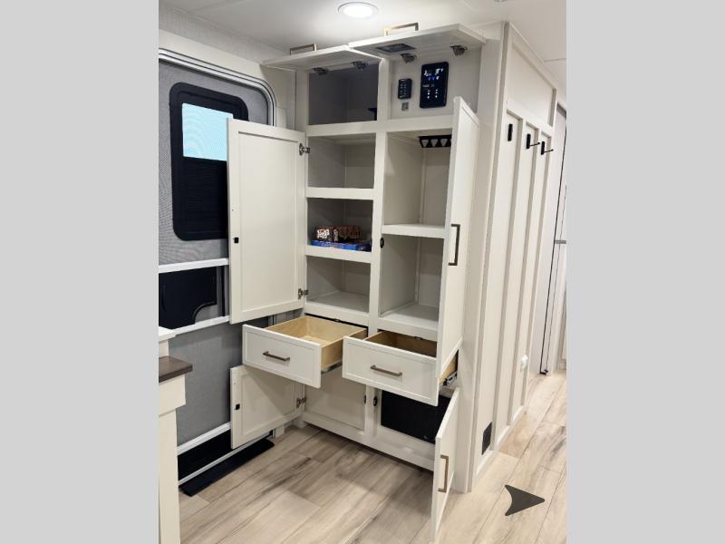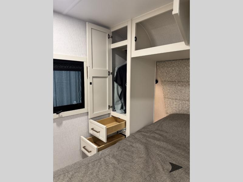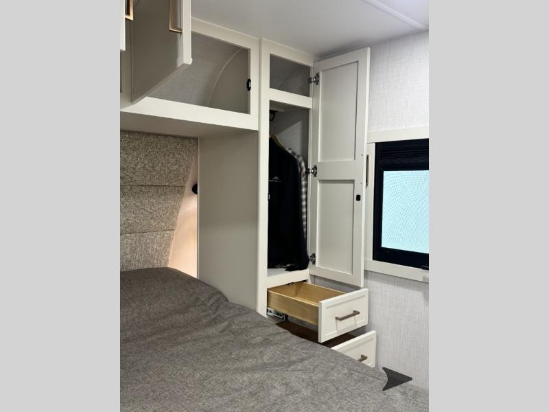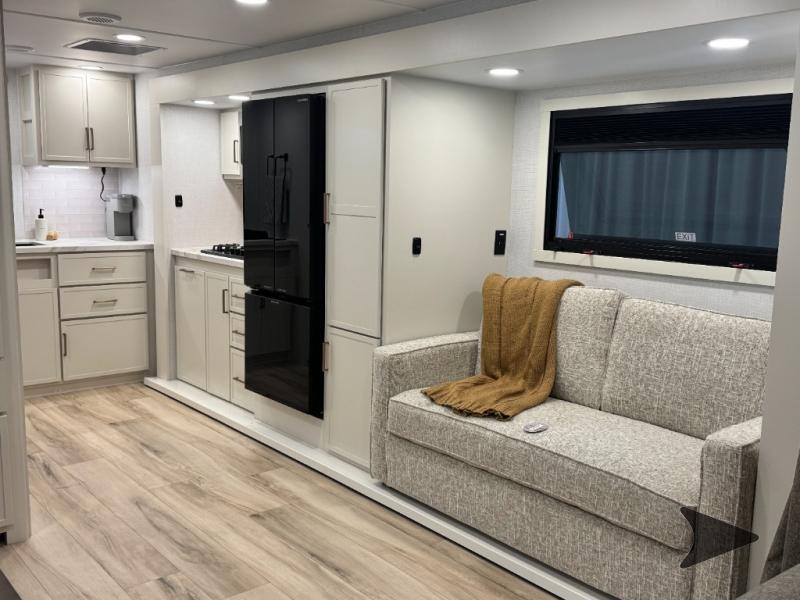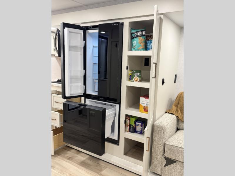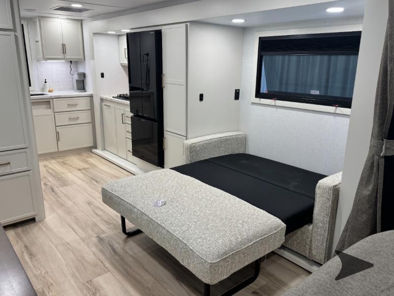 This is the perfect travel trailer for the couple looking for comfort at the campground! Once you've unloaded the pass-thru storage, you can put out the 17' patio awning and relax in your camp chairs. Head inside to make lunch in the fully-equipped kitchen that incudes a range, 30" convection microwave, and dishwasher prep. There is a pantry with outlets within the large slide out, along with a 10 cu. ft. refrigerator that you can access with the slide in, plus theater seating across from the TV. And if you need sleeping space for guests, just choose the optional tri-fold sofa in place of the theater seating! A pull-out table with a drawer provides a place to dine together, and the entryway closet will be perfect to keep jackets and shoes tidy. You'll get a great night's rest on the front queen bed with four drawers, nightstand cubbies, and a room divider for a little more privacy.