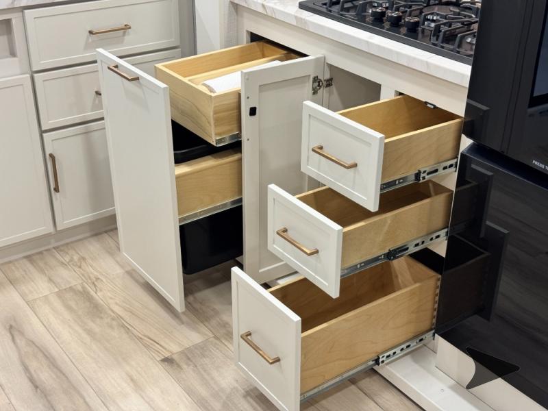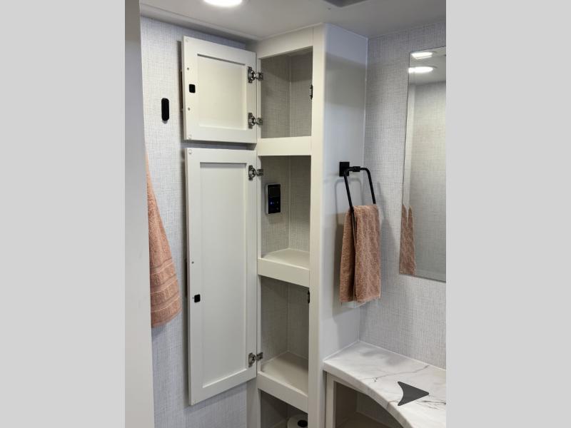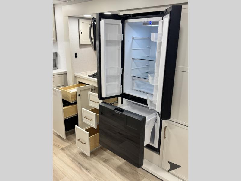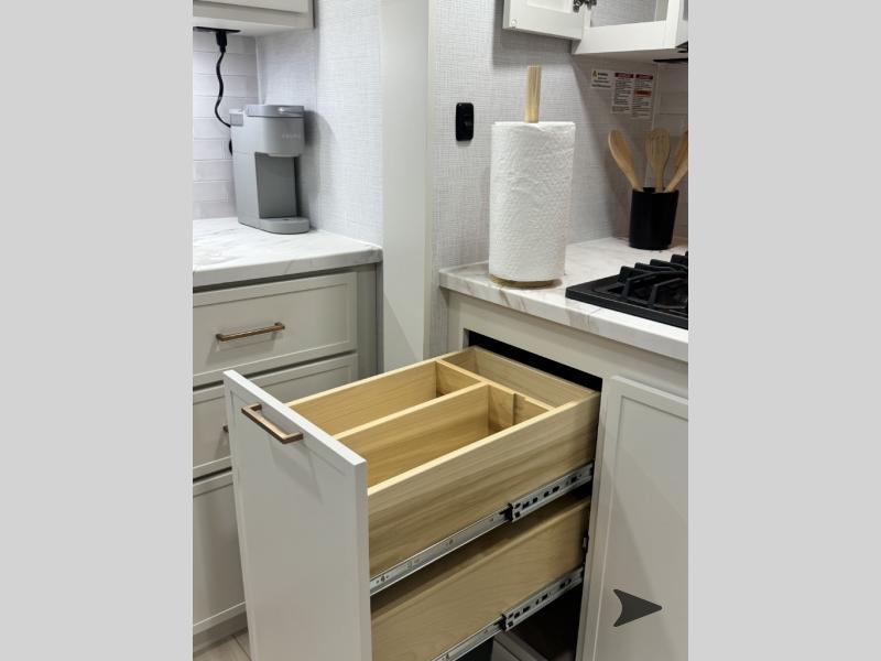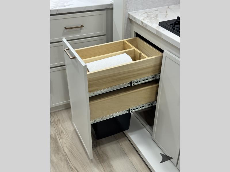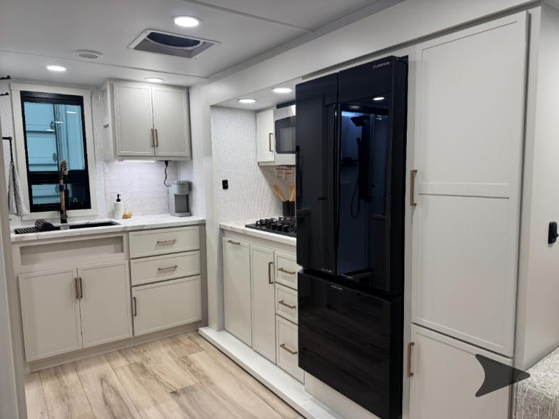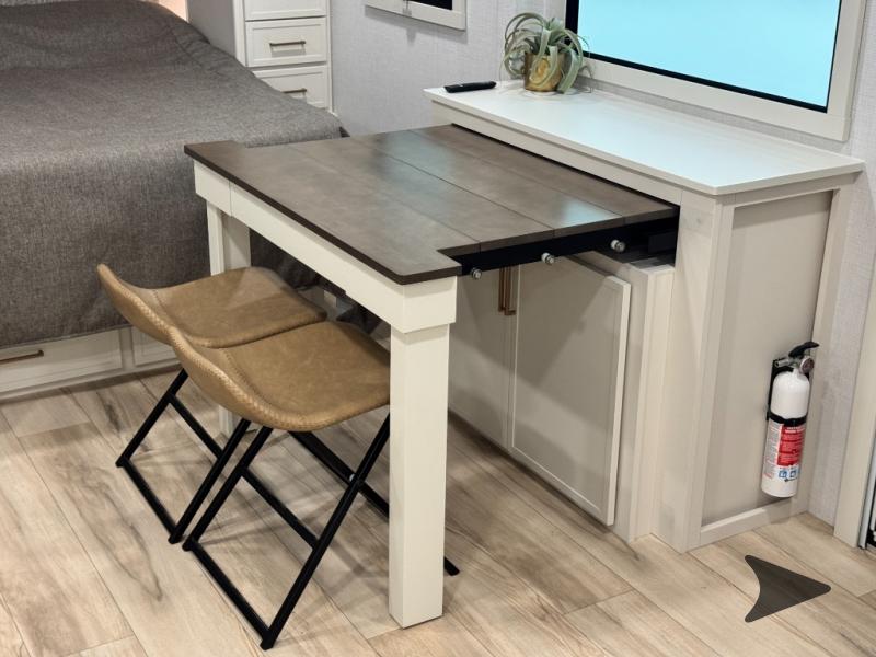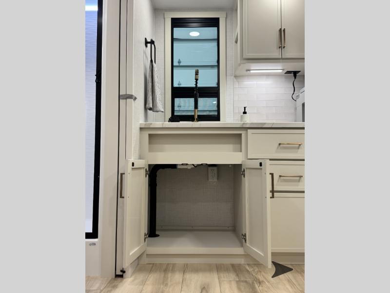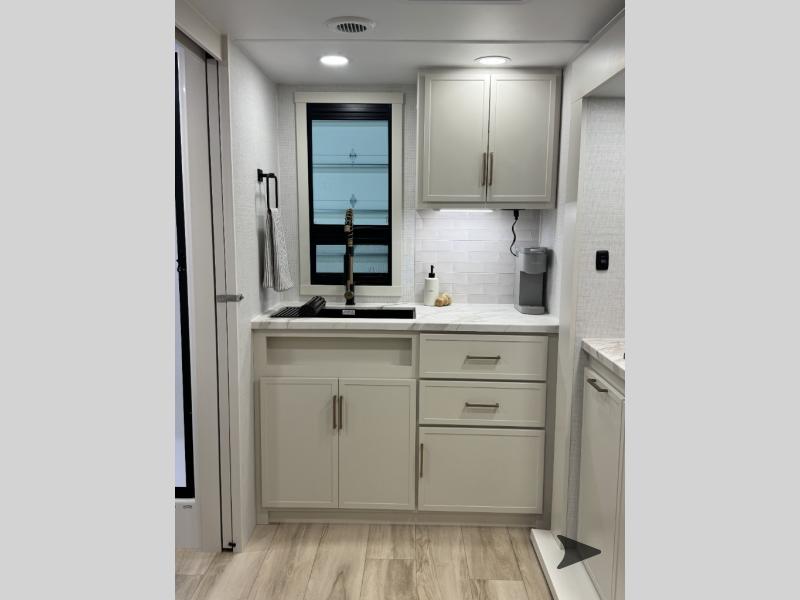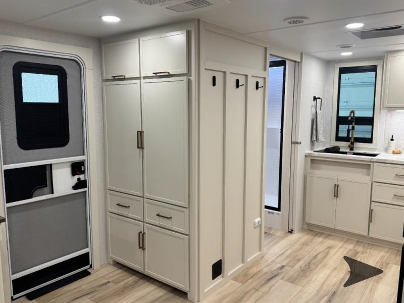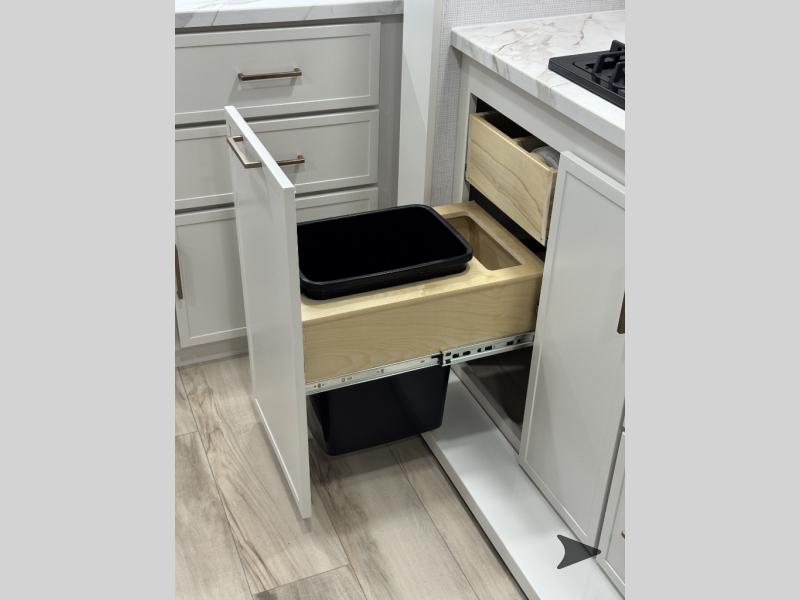 This is the perfect travel trailer for the couple looking for comfort at the campground! Once you've unloaded the pass-thru storage, you can put out the 17' patio awning and relax in your camp chairs. Head inside to make lunch in the fully-equipped kitchen that incudes a range, 30" convection microwave, and dishwasher prep. There is a pantry with outlets within the large slide out, along with a 10 cu. ft. refrigerator that you can access with the slide in, plus theater seating across from the TV. And if you need sleeping space for guests, just choose the optional tri-fold sofa in place of the theater seating! A pull-out table with a drawer provides a place to dine together, and the entryway closet will be perfect to keep jackets and shoes tidy. You'll get a great night's rest on the front queen bed with four drawers, nightstand cubbies, and a room divider for a little more privacy.