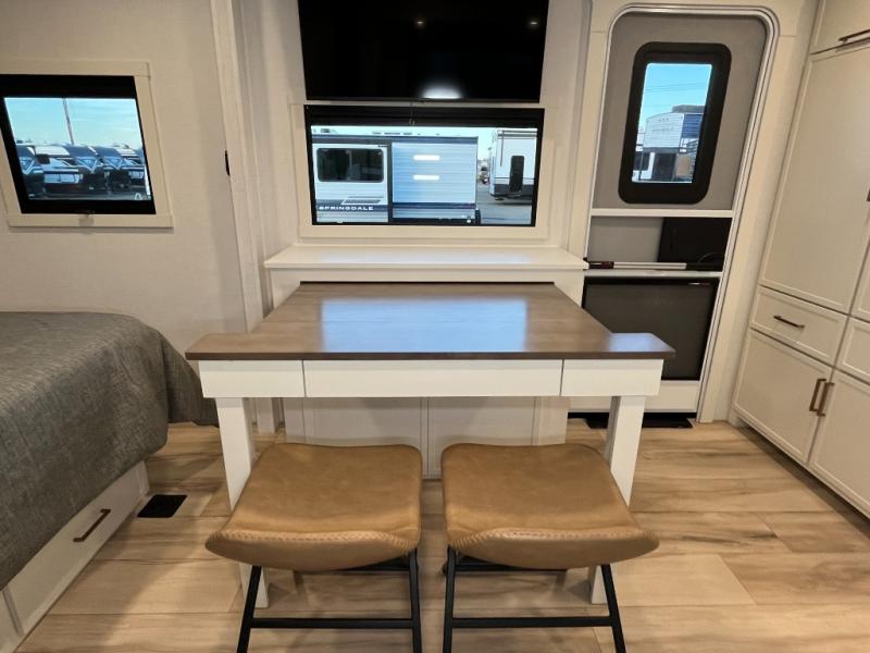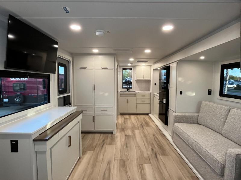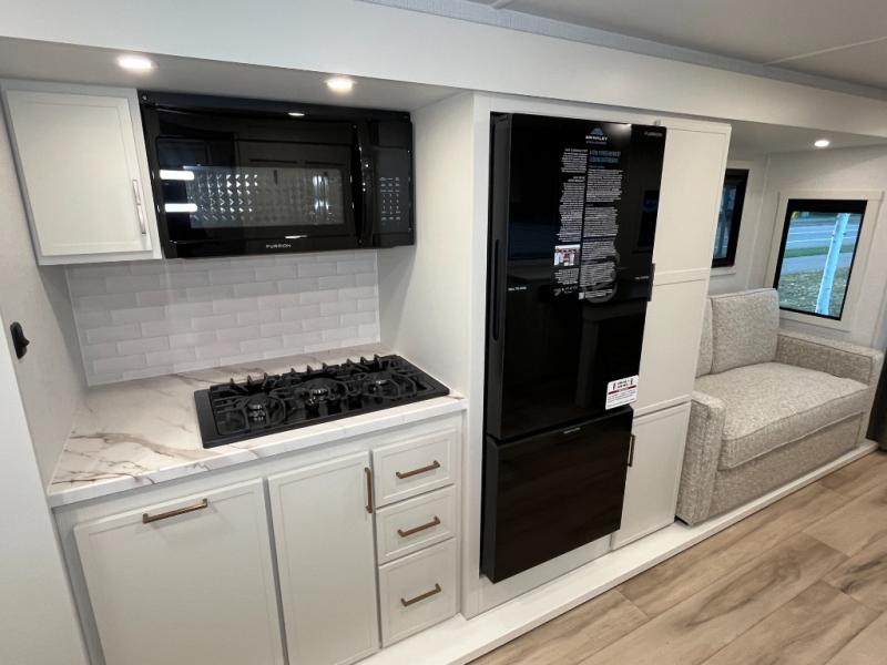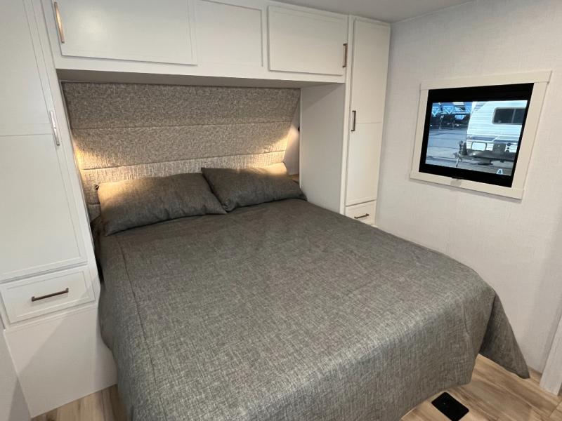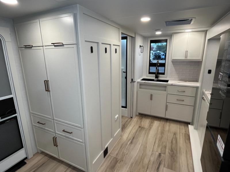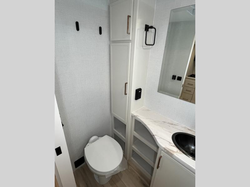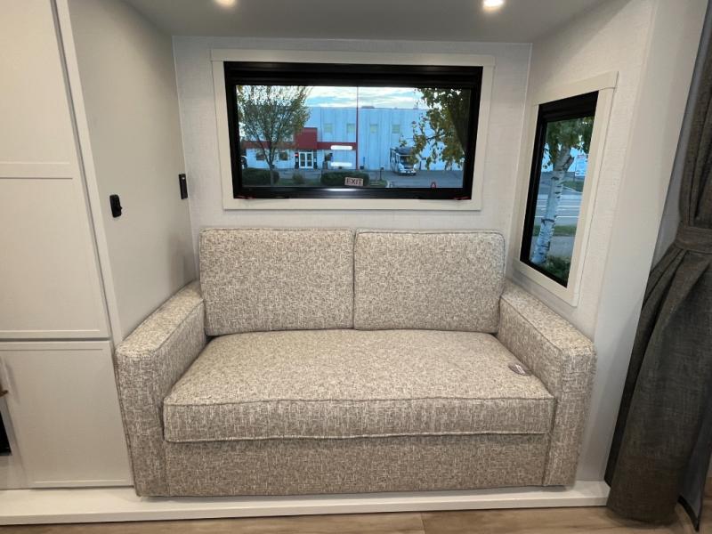 This is the perfect travel trailer for the couple looking for comfort at the campground! Once you've unloaded the pass-thru storage, you can put out the 17' patio awning and relax in your camp chairs. Head inside to make lunch in the fully equipped kitchen that includes a three-burner range, 30" convection microwave, and dishwasher prep. There is a pantry with outlets within the large slide out, along with a 10-cu. ft. refrigerator that you can access with the slide in, plus theater seating across from the TV. And if you need sleeping space for guests, just choose the optional tri-fold sofa in place of the theater seating! A pull-out table with a drawer provides a place to dine together, and the entryway closet will be perfect to keep jackets and shoes tidy. You'll get a great night's rest on the front queen bed with four drawers, nightstand cubbies, and a room divider for a little more privacy.