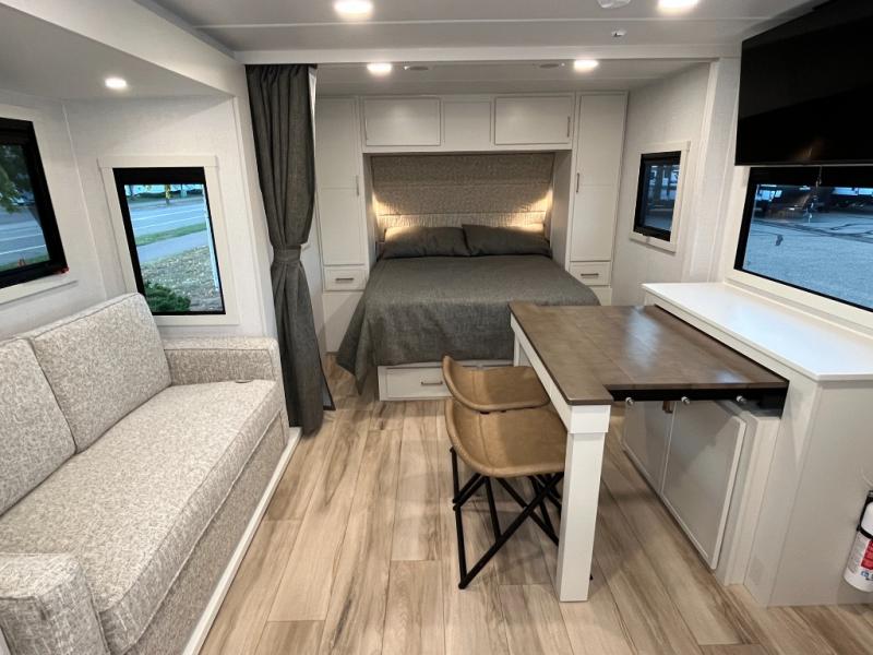 The Model Ix by Brinkley is your ticket to lightweight towing and exceptional features. This premium half-ton towable travel trailer features Brinkley's CraftSense building materials for a higher level of construction, along with a seamless laminated aluminum exterior with automotive grade full-body paint and modern graphics. You will stay powered up thanks to the power package with a 200-watt solar panel, and the Road Armor suspension will help provide a smooth tow from home to campground. The interior of the Model Ix includes premium residential cabinets with dovetail drawers, an ultra quiet and efficient A/C system, and a SoundCore Boom 2 Bluetooth waterproof speaker so you can listen to your favorite tunes indoors or outdoors!