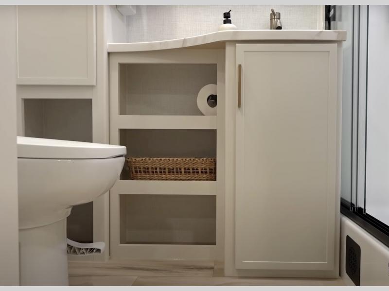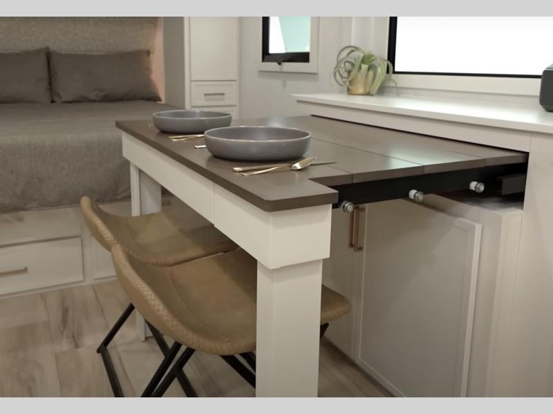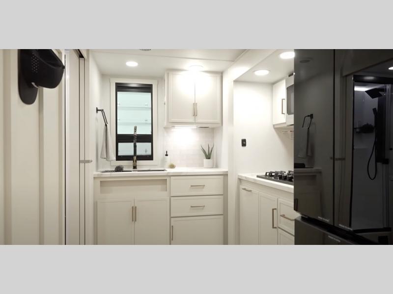 This is the perfect travel trailer for the couple looking for comfort at the campground! Once you've unloaded the pass-thru storage, you can put out the 17' patio awning and relax in your camp chairs. Head inside to make lunch in the fully-equipped kitchen that incudes a range, 30" convection microwave, and dishwasher prep. There is a pantry with outlets within the large slide out, along with a 10 cu. ft. refrigerator that you can access with the slide in, plus theater seating across from the TV. And if you need sleeping space for guests, just choose the optional tri-fold sofa in place of the theater seating! A pull-out table with a drawer provides a place to dine together, and the entryway closet will be perfect to keep jackets and shoes tidy. You'll get a great night's rest on the front queen bed with four drawers, nightstand cubbies, and a room divider for a little more privacy.