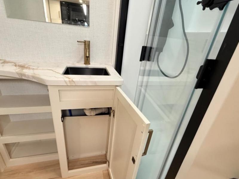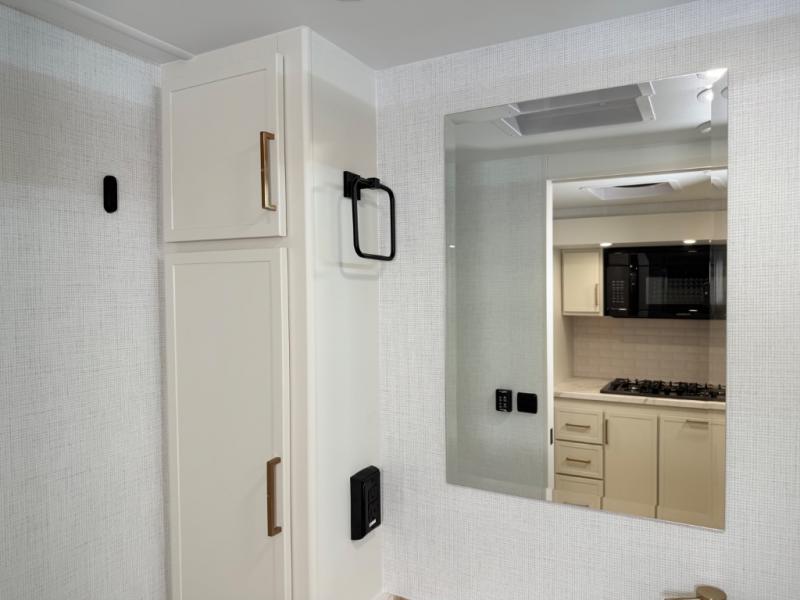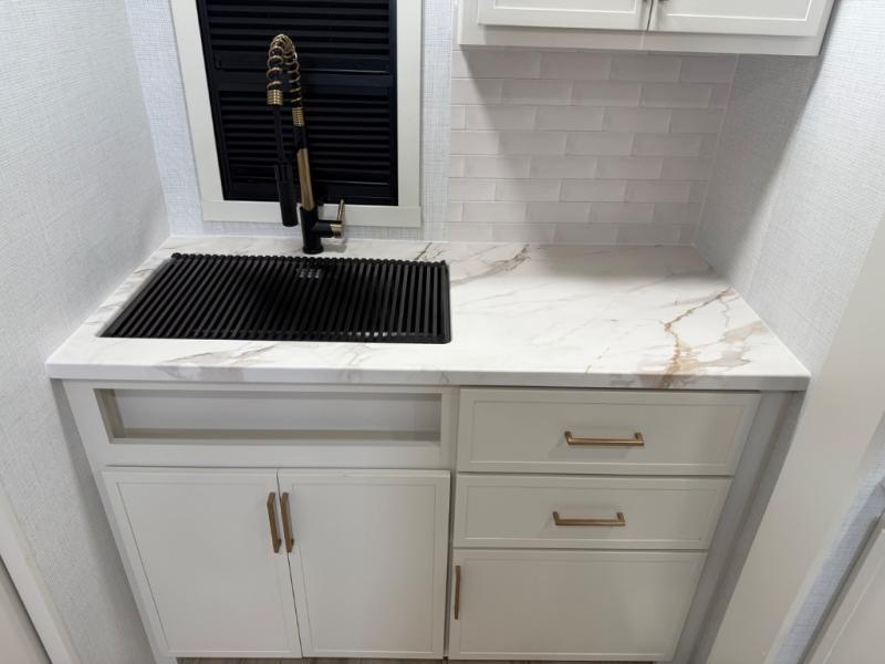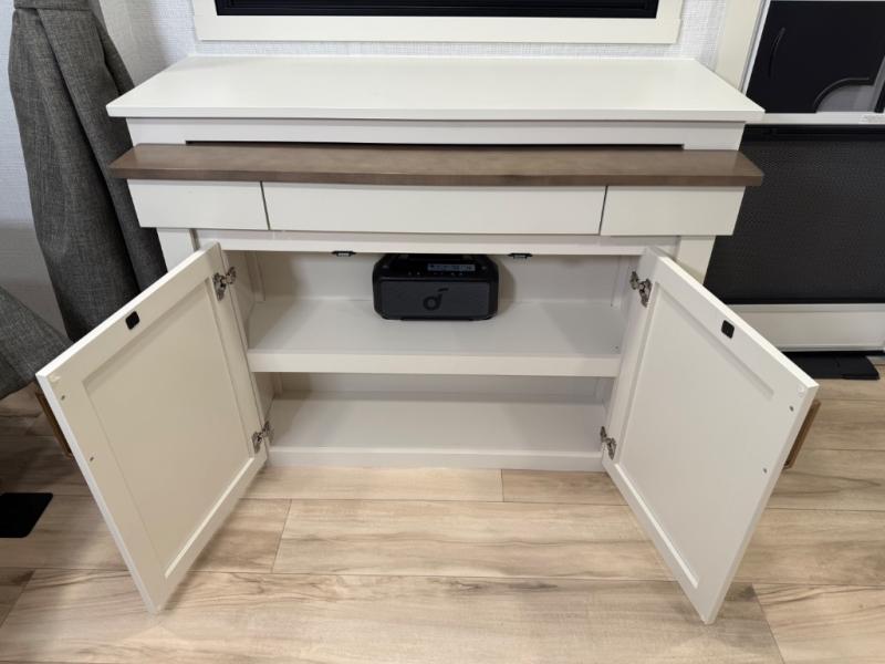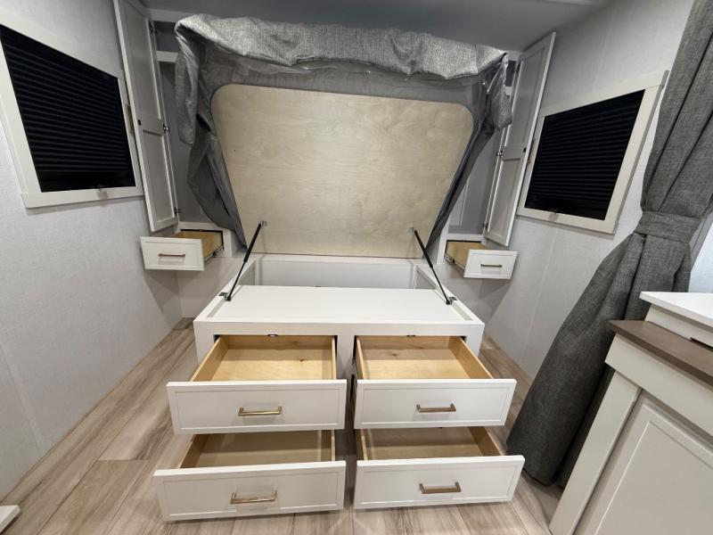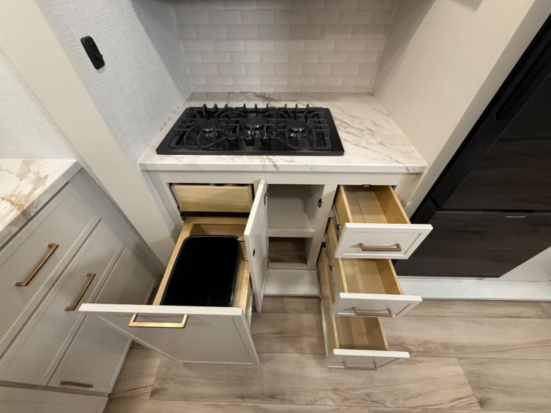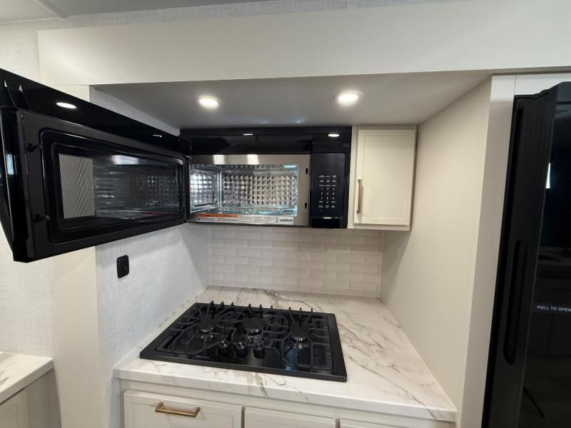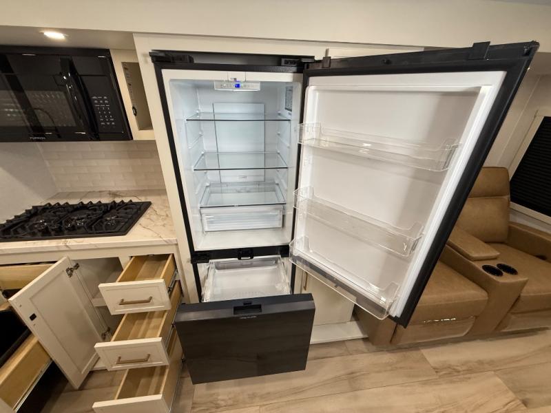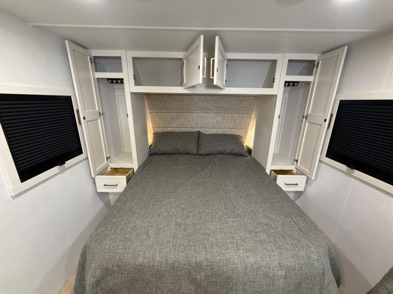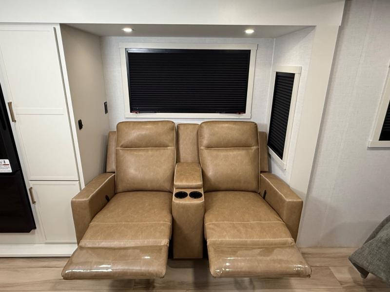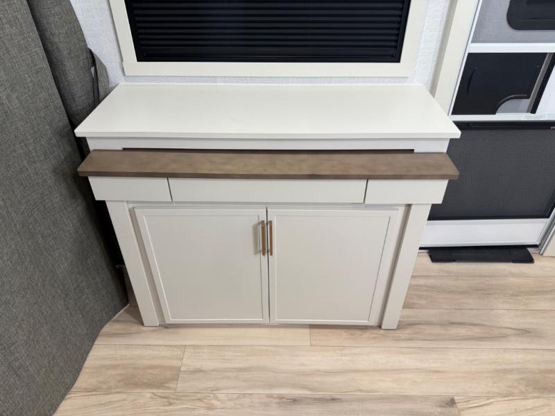 This is the perfect travel trailer for the couple looking for comfort at the campground! Once you've unloaded the pass-thru storage, you can put out the 17' patio awning and relax in your camp chairs. Head inside to make lunch in the fully-equipped kitchen that incudes a range, 30" convection microwave, and dishwasher prep. There is a pantry with outlets within the large slide out, along with a 10 cu. ft. refrigerator that you can access with the slide in, plus theater seating across from the TV. And if you need sleeping space for guests, just choose the optional tri-fold sofa in place of the theater seating! A pull-out table with a drawer provides a place to dine together, and the entryway closet will be perfect to keep jackets and shoes tidy. You'll get a great night's rest on the front queen bed with four drawers, nightstand cubbies, and a room divider for a little more privacy.