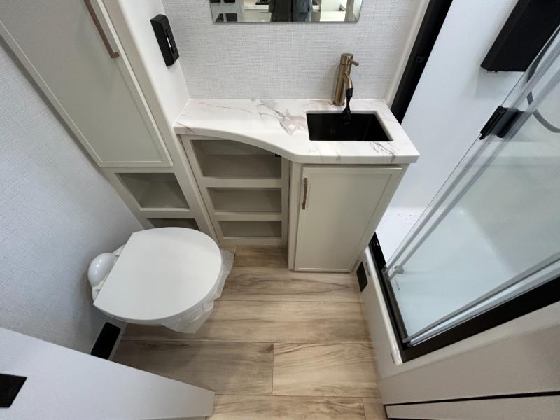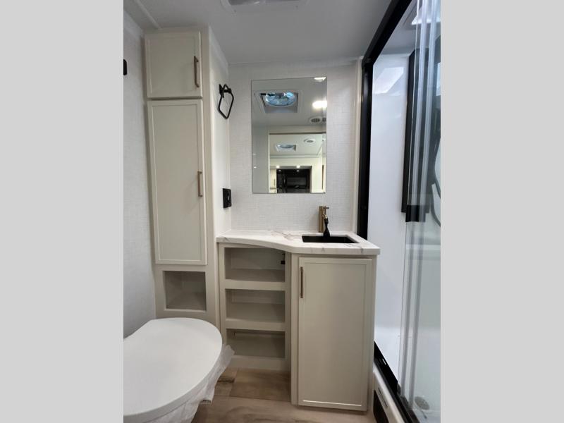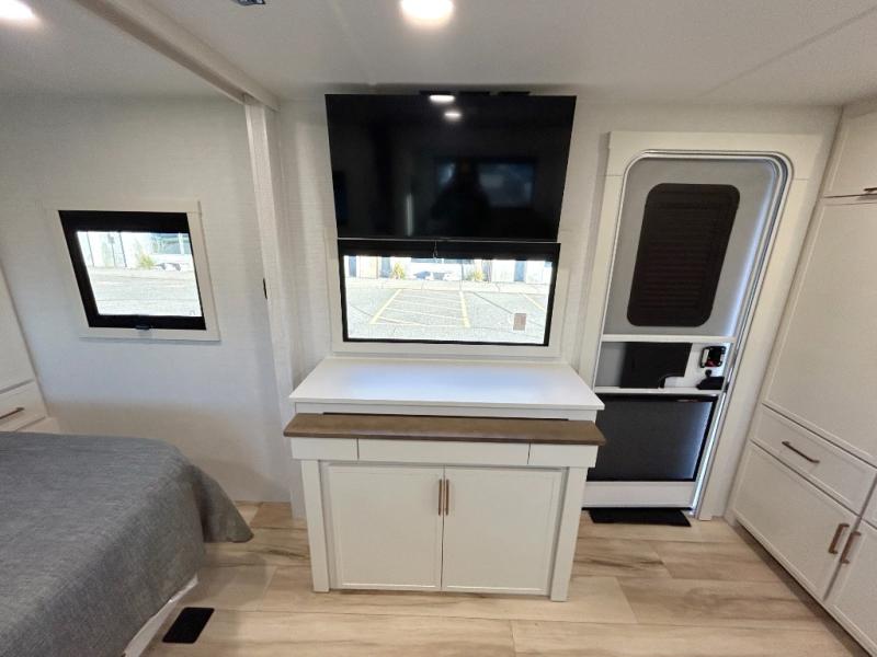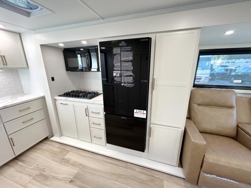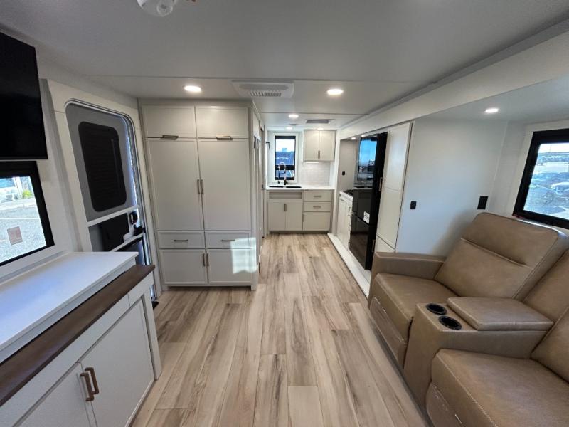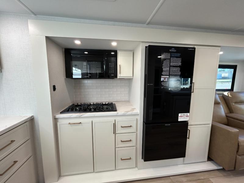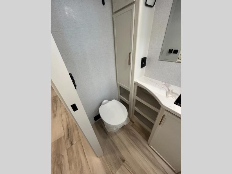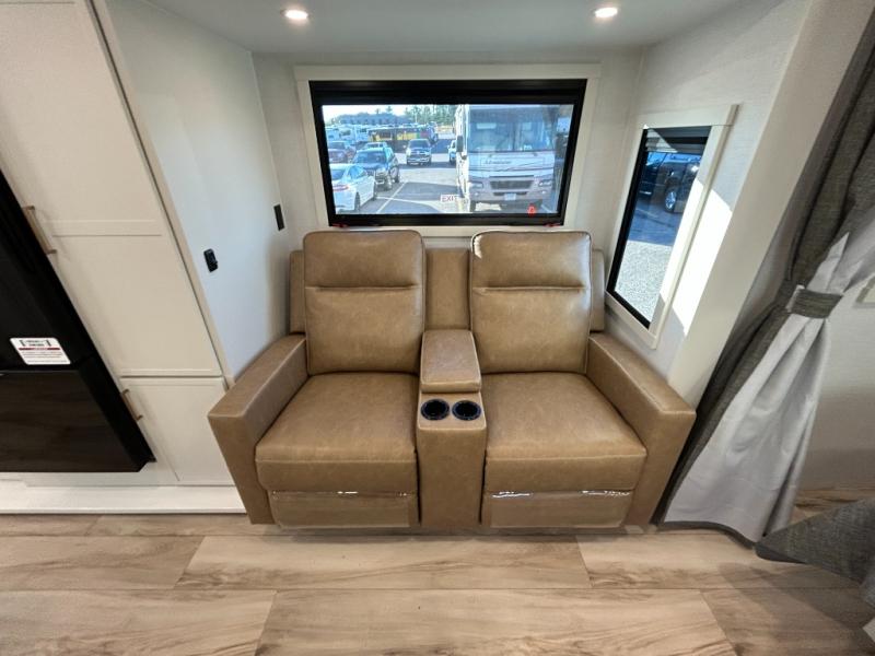 This is the perfect travel trailer for the couple looking for comfort at the campground! Once you've unloaded the pass-thru storage, you can put out the 17' patio awning and relax in your camp chairs. Head inside to make lunch in the fully equipped kitchen that includes a three-burner range, 30" convection microwave, and dishwasher prep. There is a pantry with outlets within the large slide out, along with a 10-cu. ft. refrigerator that you can access with the slide in, plus theater seating across from the TV. And if you need sleeping space for guests, just choose the optional tri-fold sofa in place of the theater seating! A pull-out table with a drawer provides a place to dine together, and the entryway closet will be perfect to keep jackets and shoes tidy. You'll get a great night's rest on the front queen bed with four drawers, nightstand cubbies, and a room divider for a little more privacy.