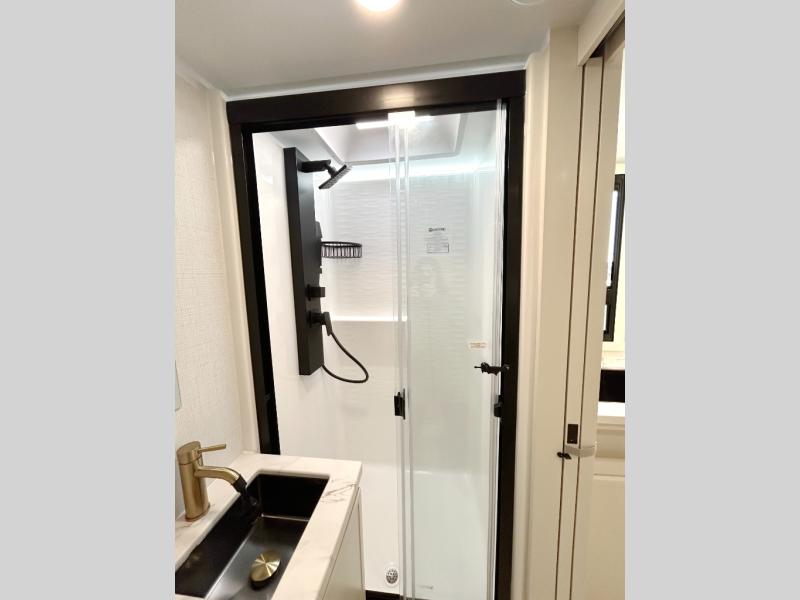 The Model Ix by Brinkley is your ticket to lightweight towing and exceptional features. This premium half-ton towable travel trailer features Brinkley's CraftSense building materials for a higher level of construction, along with a seamless laminated aluminum exterior with automotive grade full-body paint and modern graphics. You will stay powered up thanks to the power package with a 200-watt solar panel, and the Road Armor suspension will help provide a smooth tow from home to campground. The interior of the Model Ix includes premium residential cabinets with dovetail drawers, an ultra quiet and efficient A/C system, and a SoundCore Boom 2 Bluetooth waterproof speaker so you can listen to your favorite tunes indoors or outdoors!