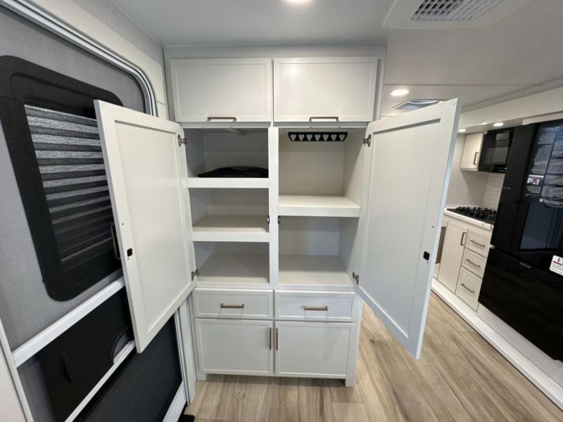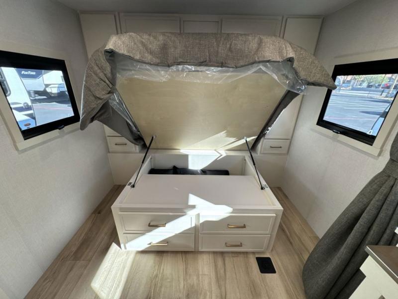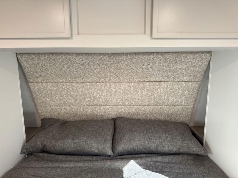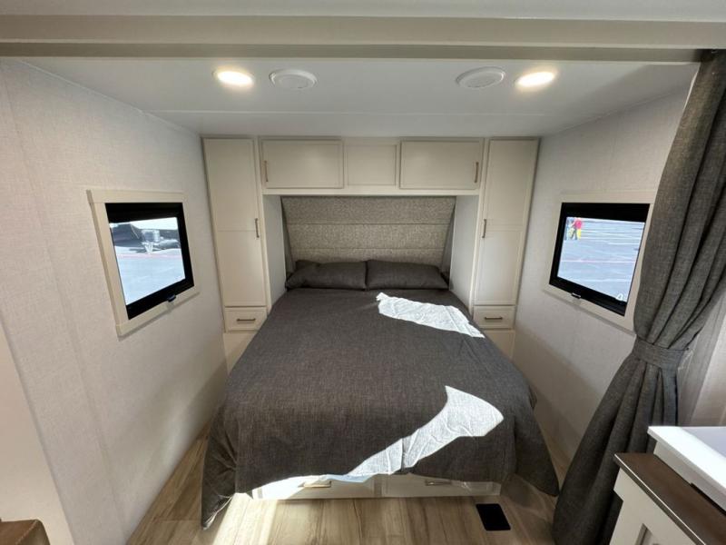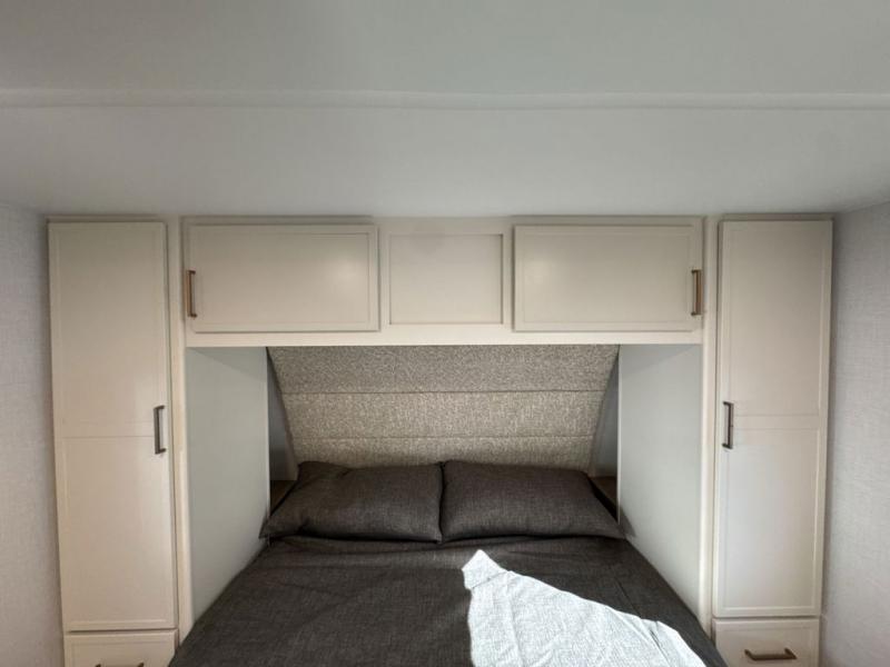 This is the perfect travel trailer for the couple looking for comfort at the campground! Once you've unloaded the pass-thru storage, you can put out the 17' patio awning and relax in your camp chairs. Head inside to make lunch in the fully equipped kitchen that includes a three-burner range, 30" convection microwave, and dishwasher prep. There is a pantry with outlets within the large slide out, along with a 10-cu. ft. refrigerator that you can access with the slide in, plus theater seating across from the TV. And if you need sleeping space for guests, just choose the optional tri-fold sofa in place of the theater seating! A pull-out table with a drawer provides a place to dine together, and the entryway closet will be perfect to keep jackets and shoes tidy. You'll get a great night's rest on the front queen bed with four drawers, nightstand cubbies, and a room divider for a little more privacy.