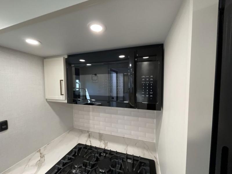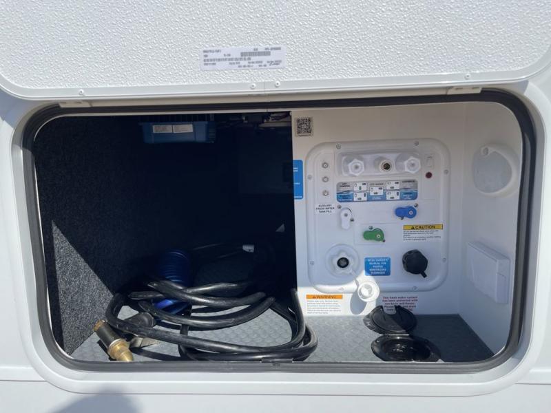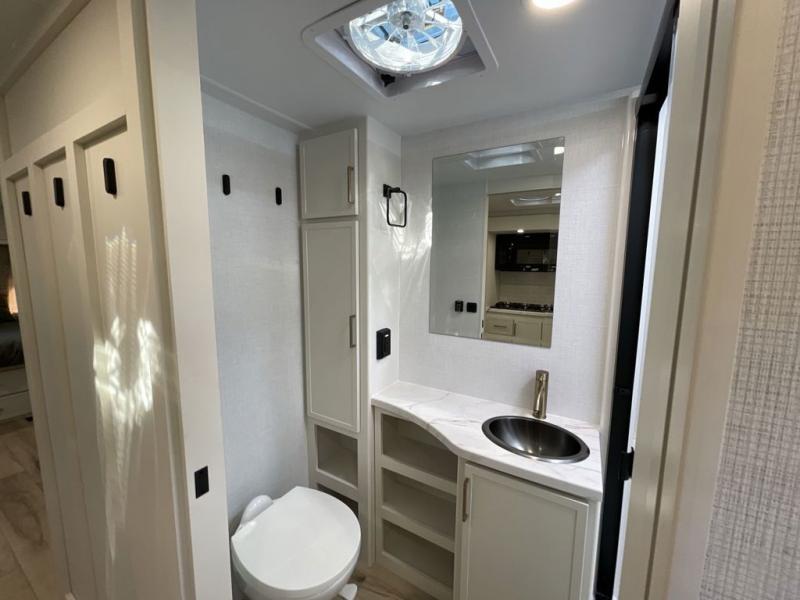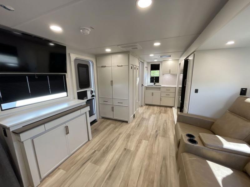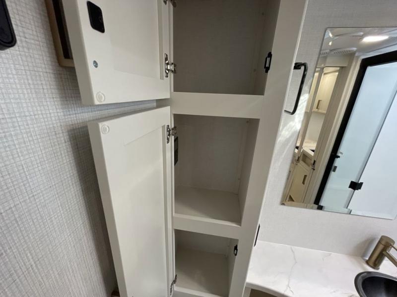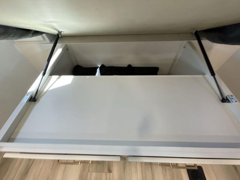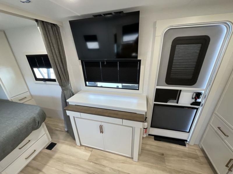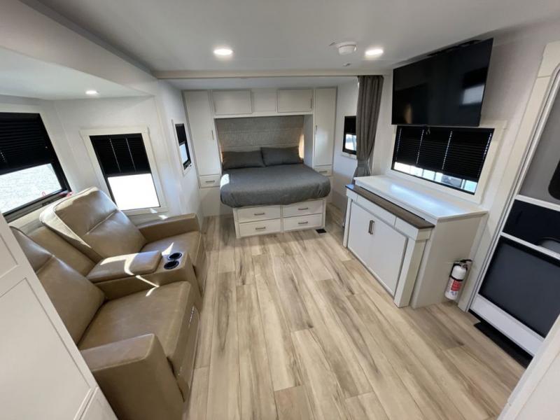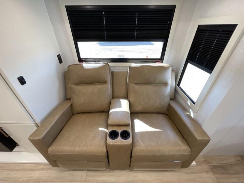 This is the perfect travel trailer for the couple looking for comfort at the campground! Once you've unloaded the pass-thru storage, you can put out the 17' patio awning and relax in your camp chairs. Head inside to make lunch in the fully equipped kitchen that includes a three-burner range, 30" convection microwave, and dishwasher prep. There is a pantry with outlets within the large slide out, along with a 10-cu. ft. refrigerator that you can access with the slide in, plus theater seating across from the TV. And if you need sleeping space for guests, just choose the optional tri-fold sofa in place of the theater seating! A pull-out table with a drawer provides a place to dine together, and the entryway closet will be perfect to keep jackets and shoes tidy. You'll get a great night's rest on the front queen bed with four drawers, nightstand cubbies, and a room divider for a little more privacy.