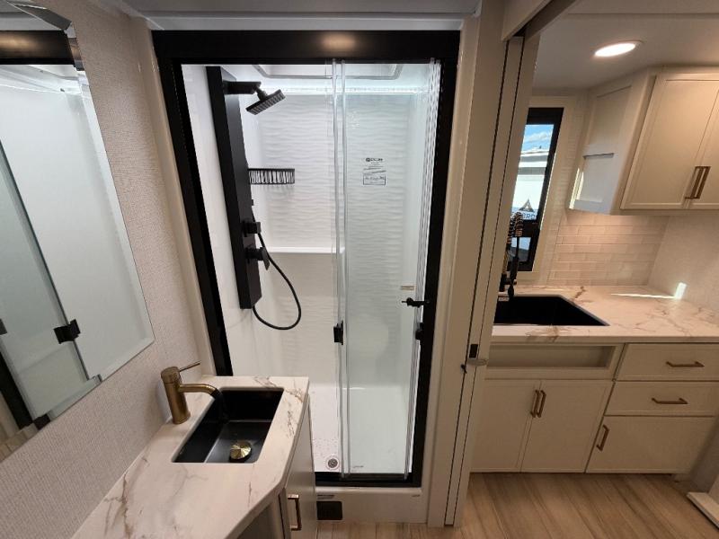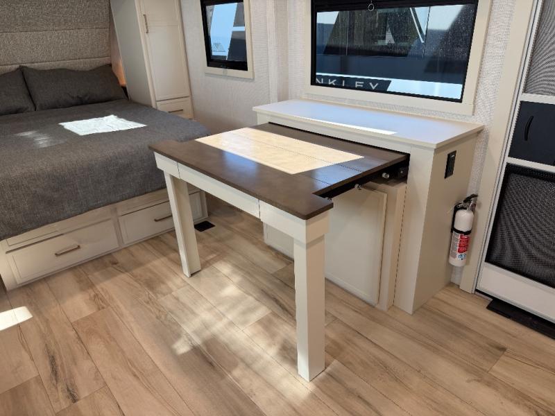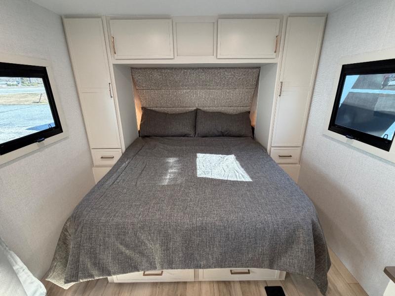 This is the perfect travel trailer for the couple looking for comfort at the campground! Once you've unloaded the pass-thru storage, you can put out the 17' patio awning and relax in your camp chairs. Head inside to make lunch in the fully-equipped kitchen that incudes a range, 30" convection microwave, and dishwasher prep. There is a pantry with outlets within the large slide out, along with a 10 cu. ft. refrigerator that you can access with the slide in, plus theater seating across from the TV. And if you need sleeping space for guests, just choose the optional tri-fold sofa in place of the theater seating! A pull-out table with a drawer provides a place to dine together, and the entryway closet will be perfect to keep jackets and shoes tidy. You'll get a great night's rest on the front queen bed with four drawers, nightstand cubbies, and a room divider for a little more privacy.